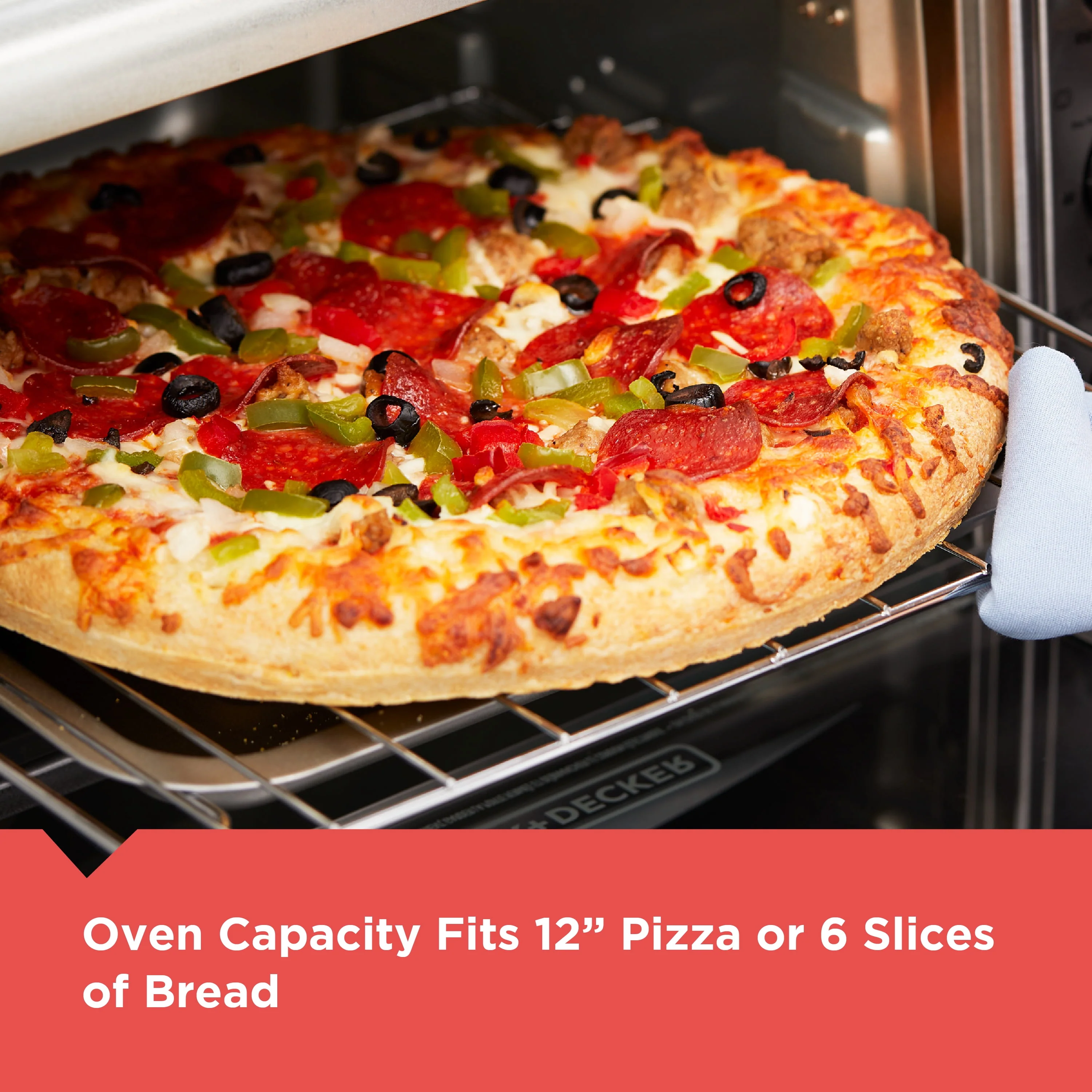 Introducing Air Fry Technology, new in the BLACK+DECKER Crisp 'N Bake Air Fry Toaster Oven. This is deep fried taste without the fat! Air Fry Technology uses high intensity hot air to bake, brown, and crisp your favorite fried foods with little to no oil giving you the same lovely taste. Try French fries, veggie chips, breaded fish filets, frozen snacks, and a lot more! Perfect for a family of 6 since there’s space for up to 6 slices of bread or a 12�?pizza. Three control knobs make it easy to set the toast timer, 60-minute timer, and choose from 5 cooking functions: bake, broil, toast, keep warm, and air fry. Convection technology circulates air within the oven for fast and even results when air frying. Plus, this toaster oven includes an air fry basket so you don't have to flip the food half way through the cycle for an even cook, bake/broil pan and rack, and an external crumb tray that slides in and out to make cleanup a breeze.