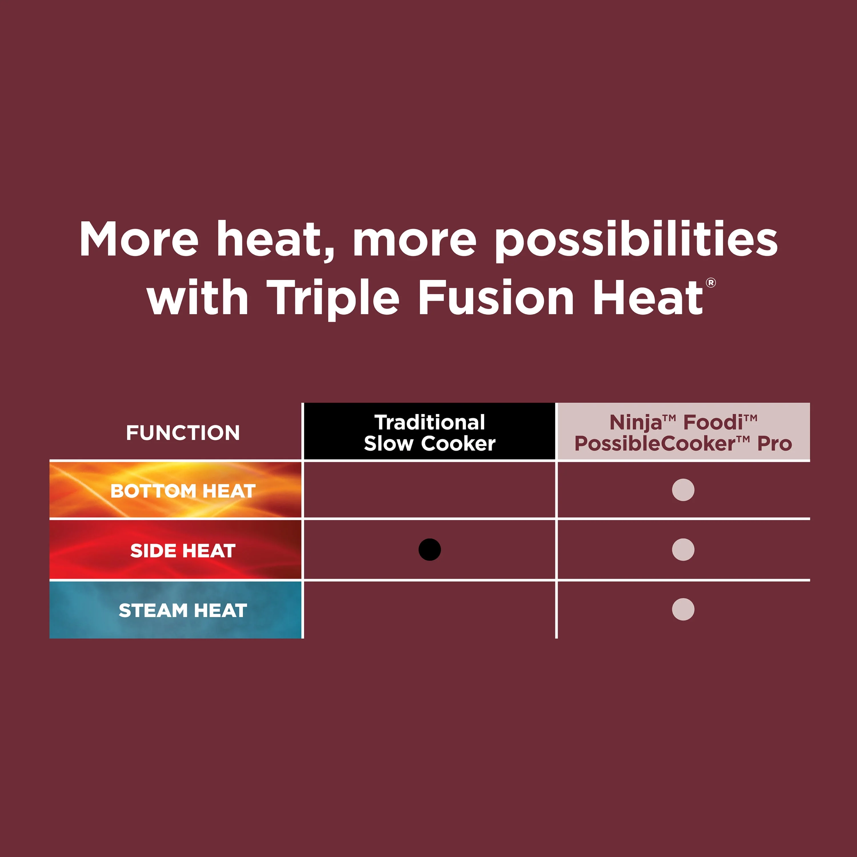 Meet the Ninja Foodi Possible Cooker 8.5 qt., MC1000WM, the versatile 6-in-1 cooker that makes anything possible. This go-to cooker can replace 10 cooking tools and appliances, offering cooker to oven to table functionality. Cook up to 30% faster than a conventional oven* with Triple Fusion Heat, which combines bottom, side, and steam heating elements to unlock even more cooking options. *Tested on 6-lb chickens.