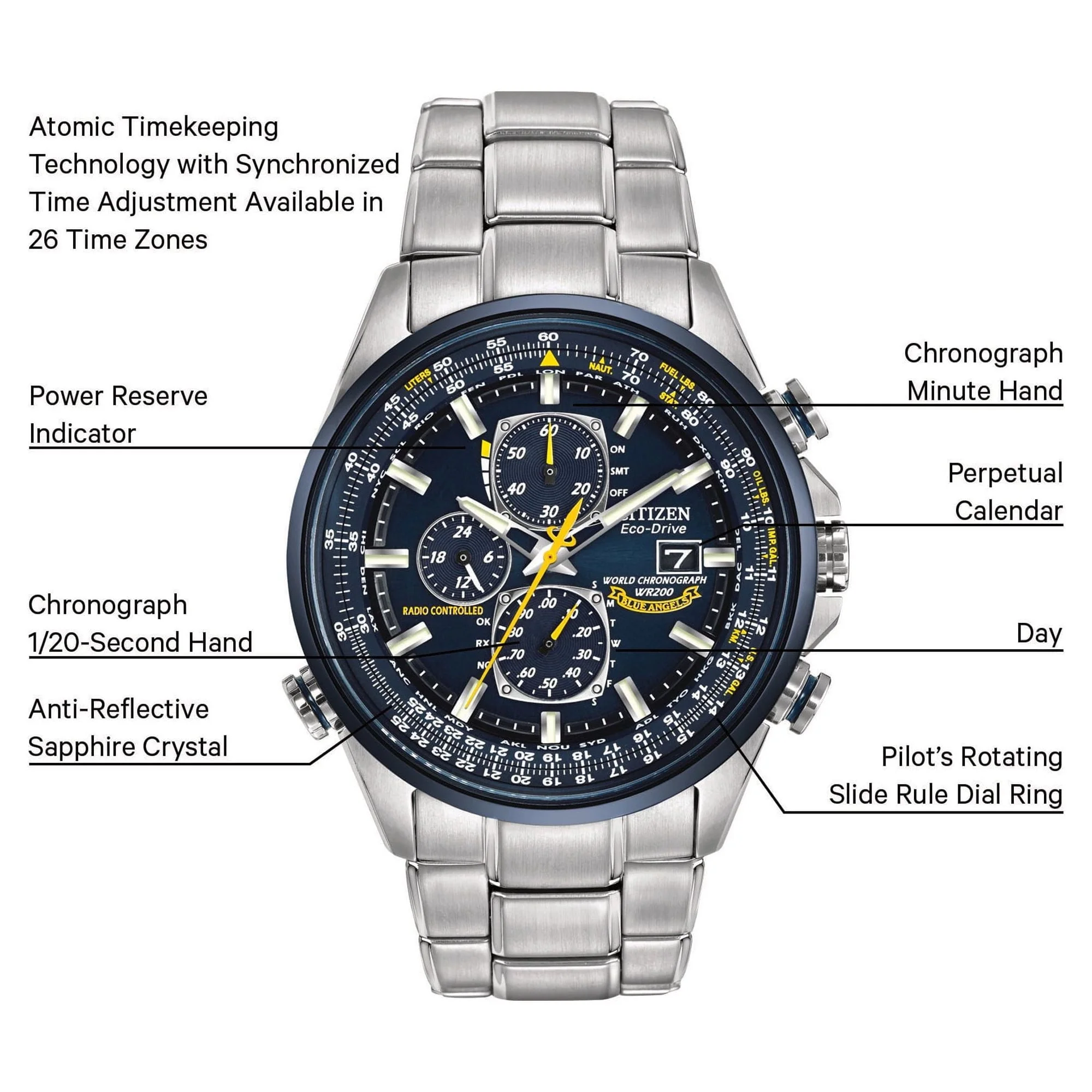 Citizen Eco-Drive Radio-Controlled Chronograph World Timer; Blue Angels edition with caseback insignia. Atomic time in 26 world cities; radio-controlled accuracy in 5 zones. 1/20 second chrono measures up to 60 minutes, perpetual calendar, 12/24 hour time, power reserve, non-reflective sapphire crystal. Stainless steel with blue ion plating. Featuring our Eco-Drive technology �?powered by light, any light. Never needs a battery.