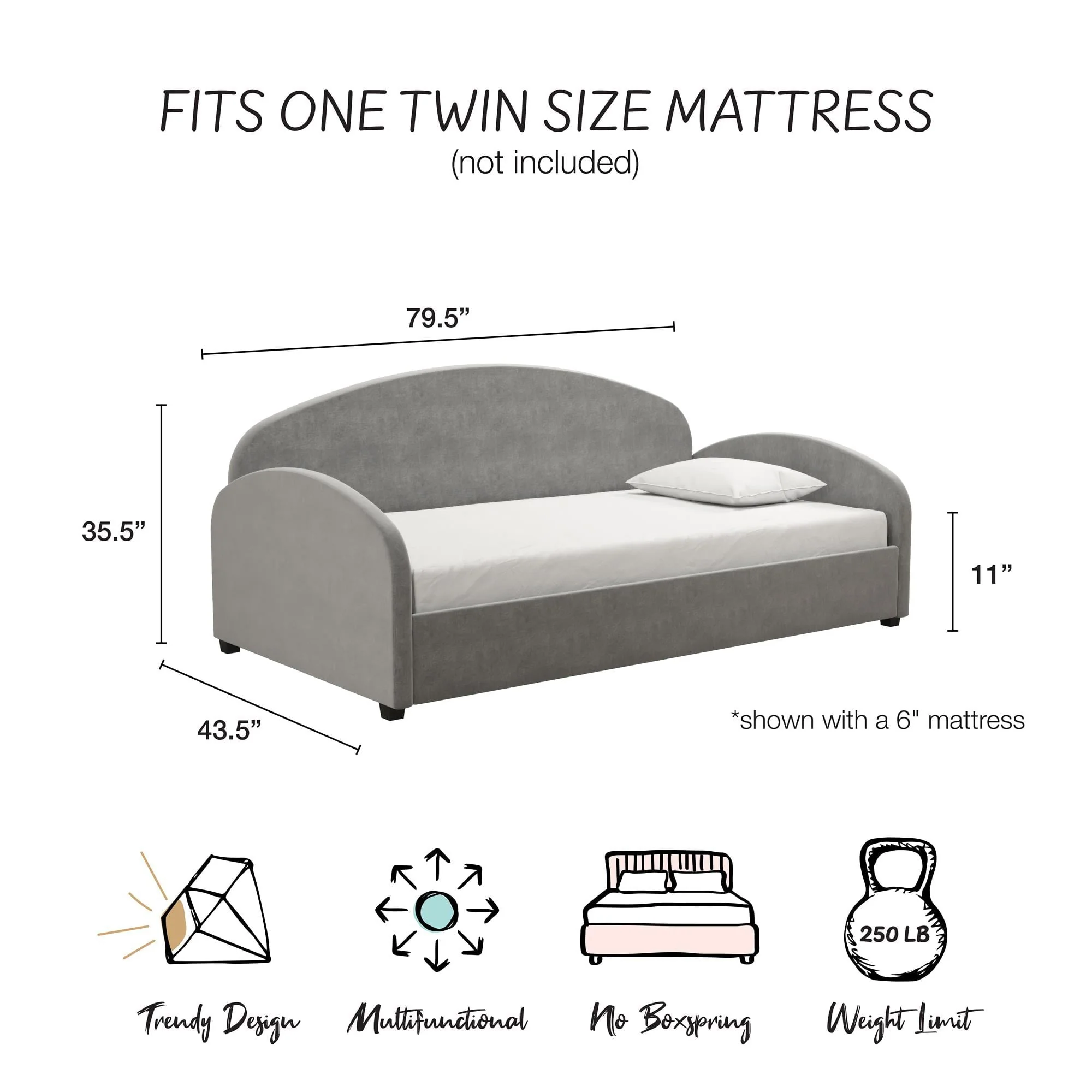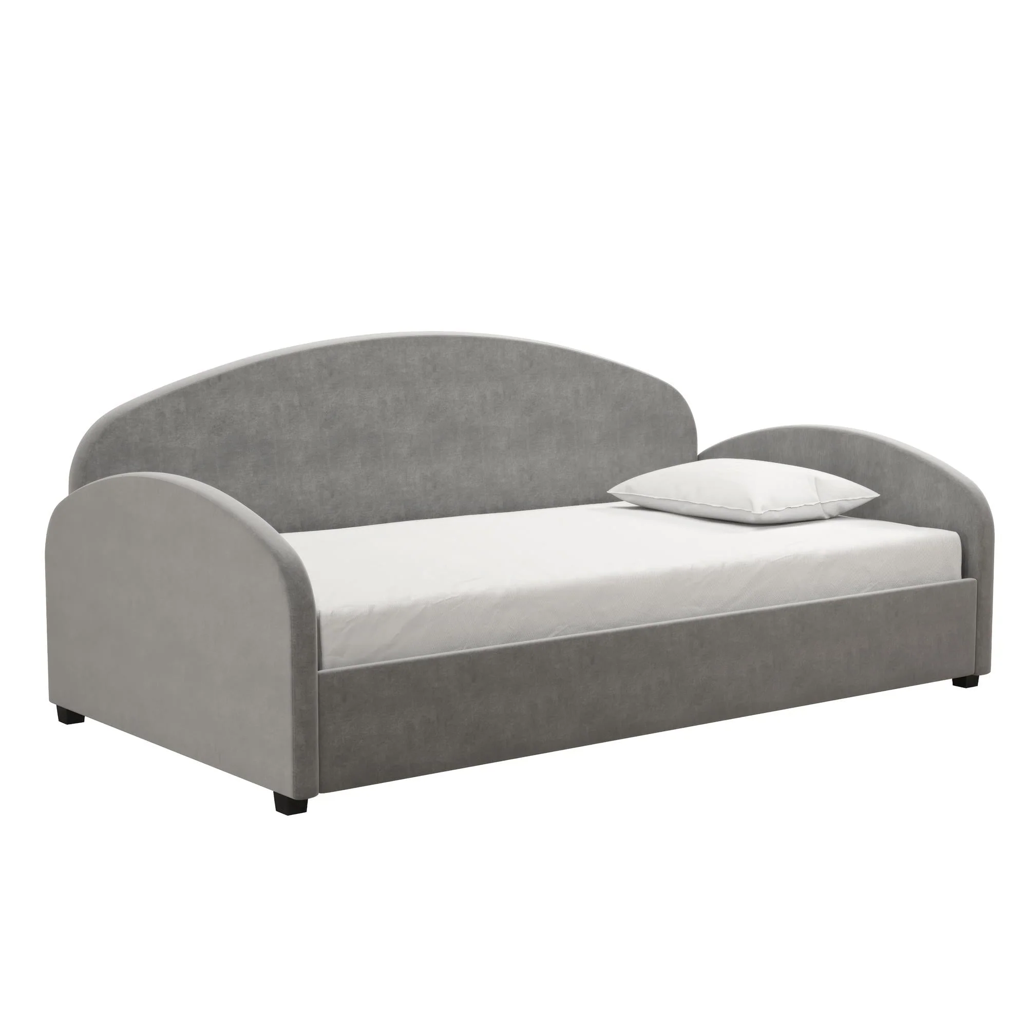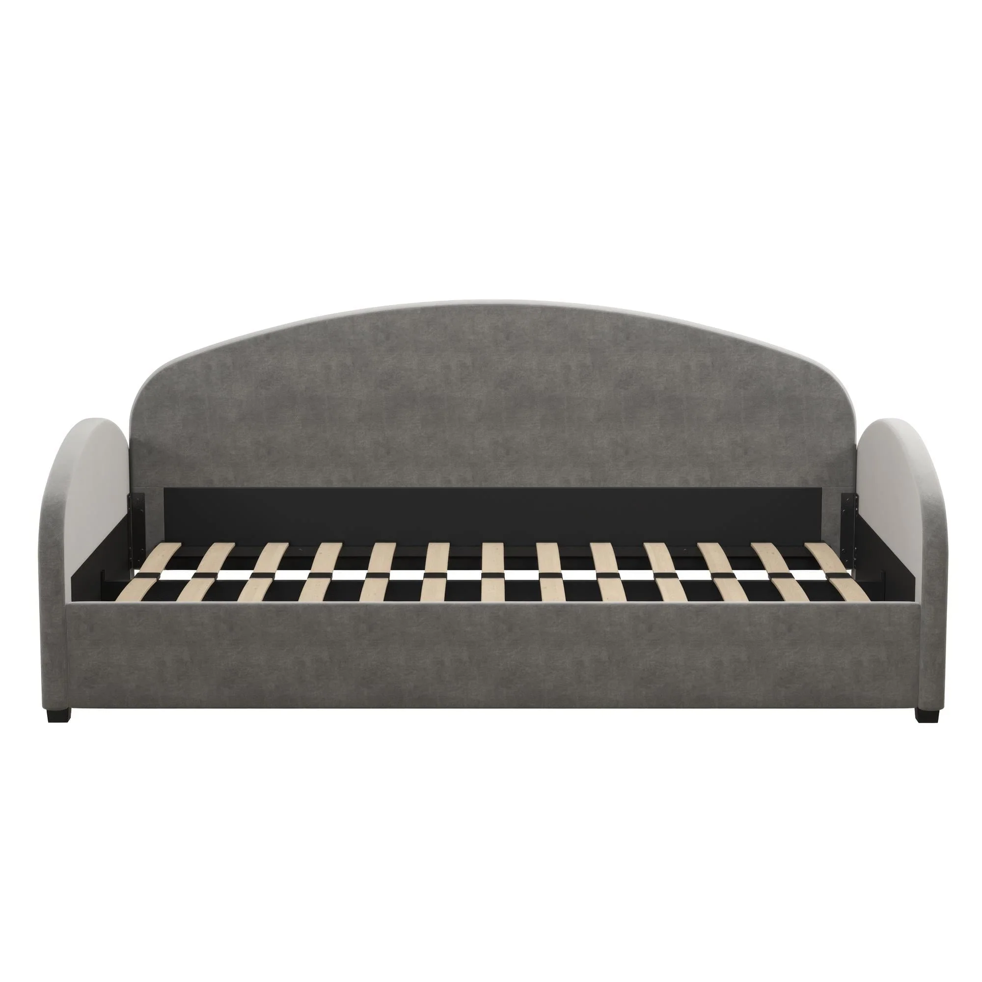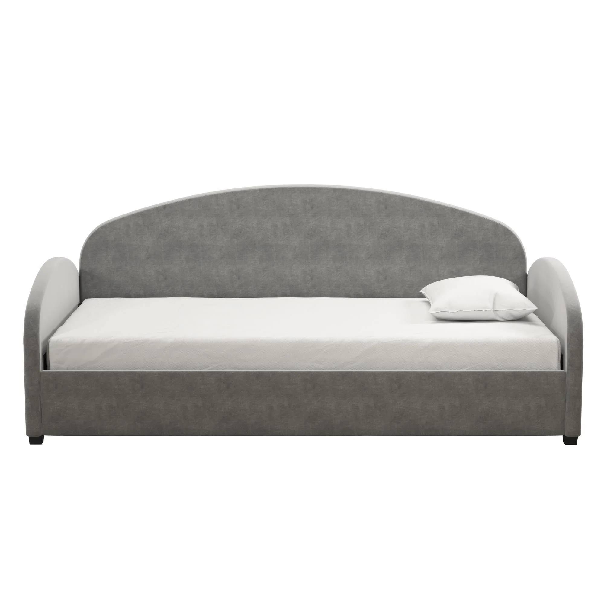 A dreamy and unique half-moon silhouette couch by day and a cozy bed by night, The Mr. Kate Moon Upholstered Daybed was designed to provide a beautiful and helpful solution to your multi-functional living spaces. Perfect for a small bedroom, living room or a spare bedroom, this soft Daybed with cushioned armrests smartly opens up your space and gives you and your guests a comfortable spot to take a seat or call it a night on, all while reaching for the stars with its creative design. Its strong frame combines both wood and metal construction elements with the use of sturdy bentwood slats and steel front, rear, and center rails for extra support. Against the backdrop of some framed artwork or an accent wall covered in vibrant multicolored wallpaper, lift the Moon to new heights and curate your own modern, free-spirited retreat--your home, your rules!