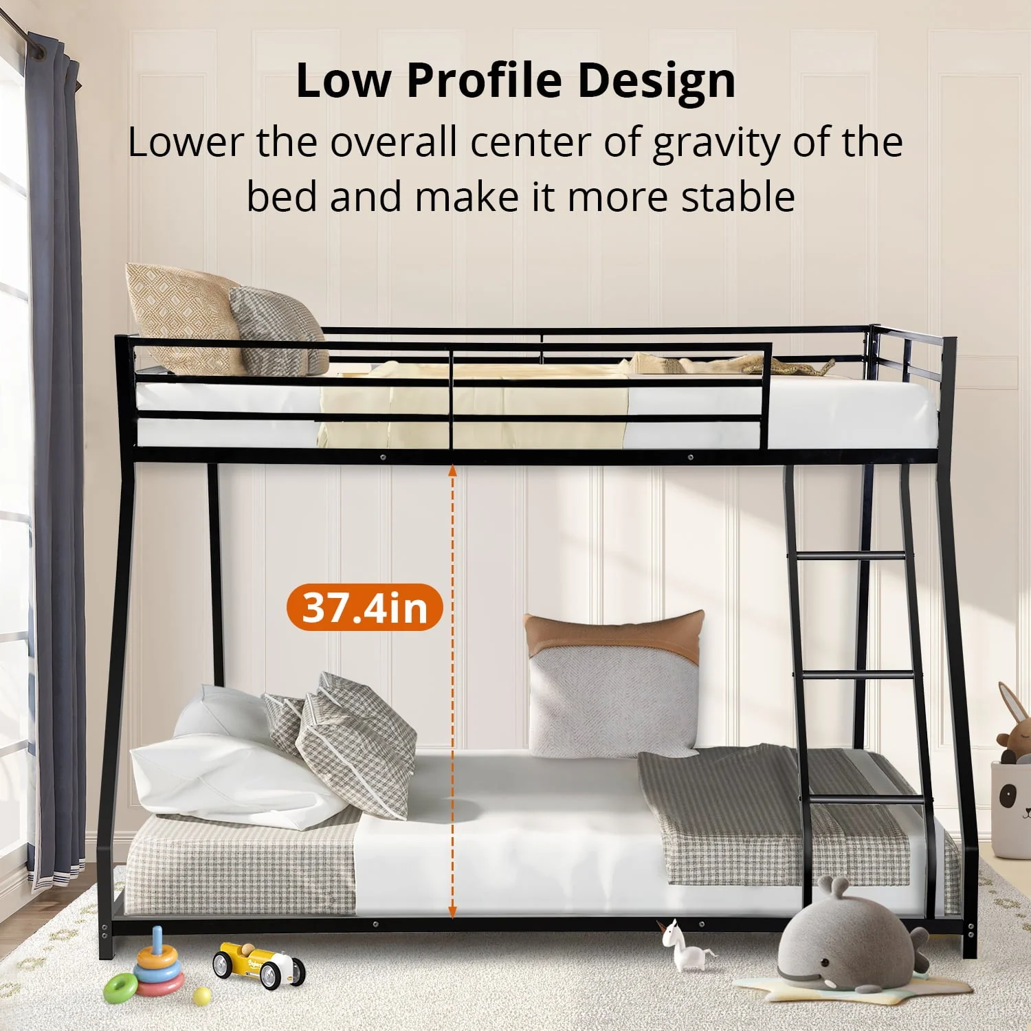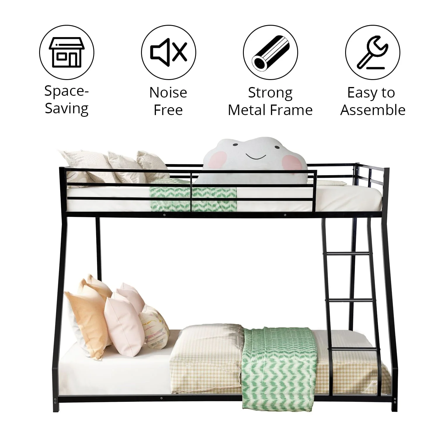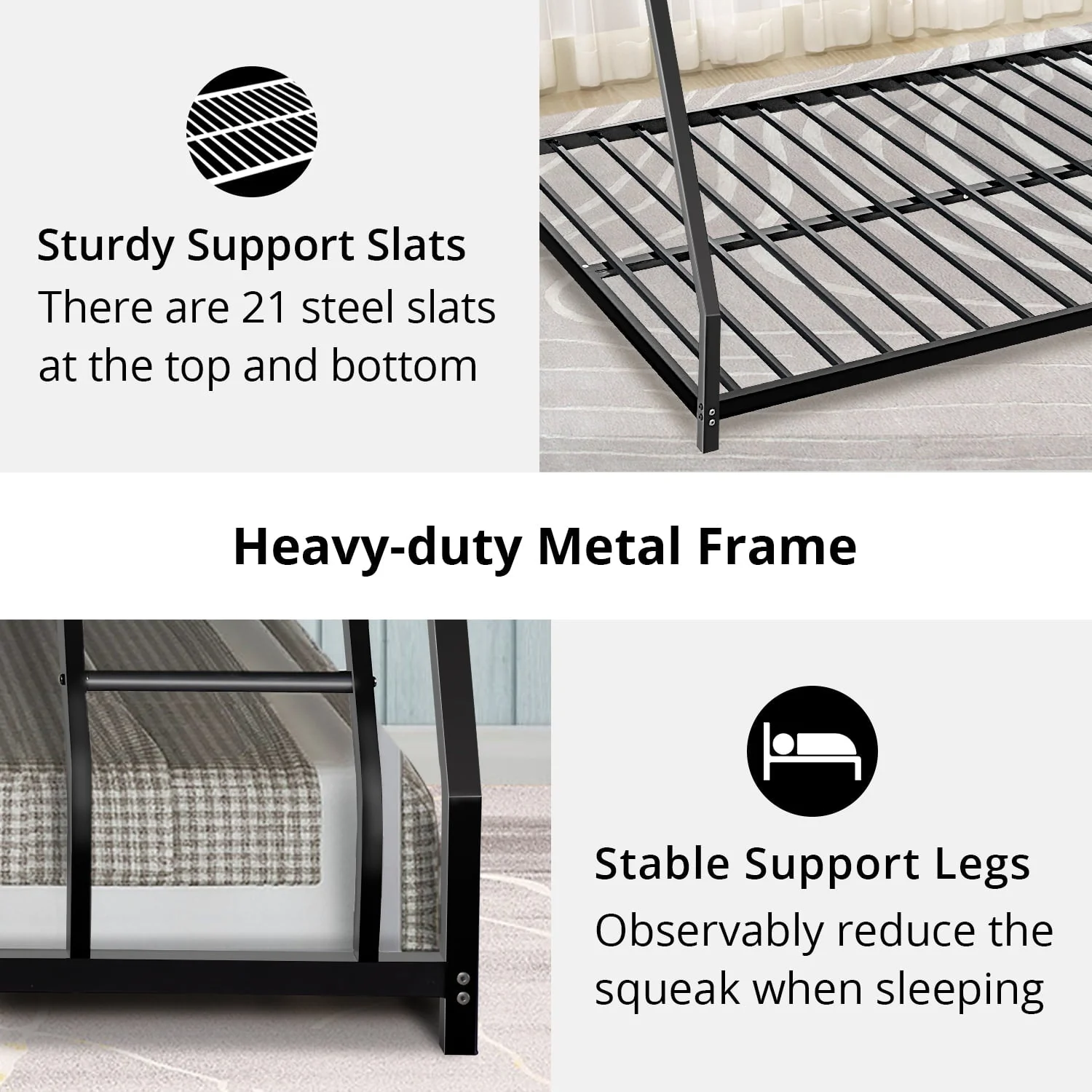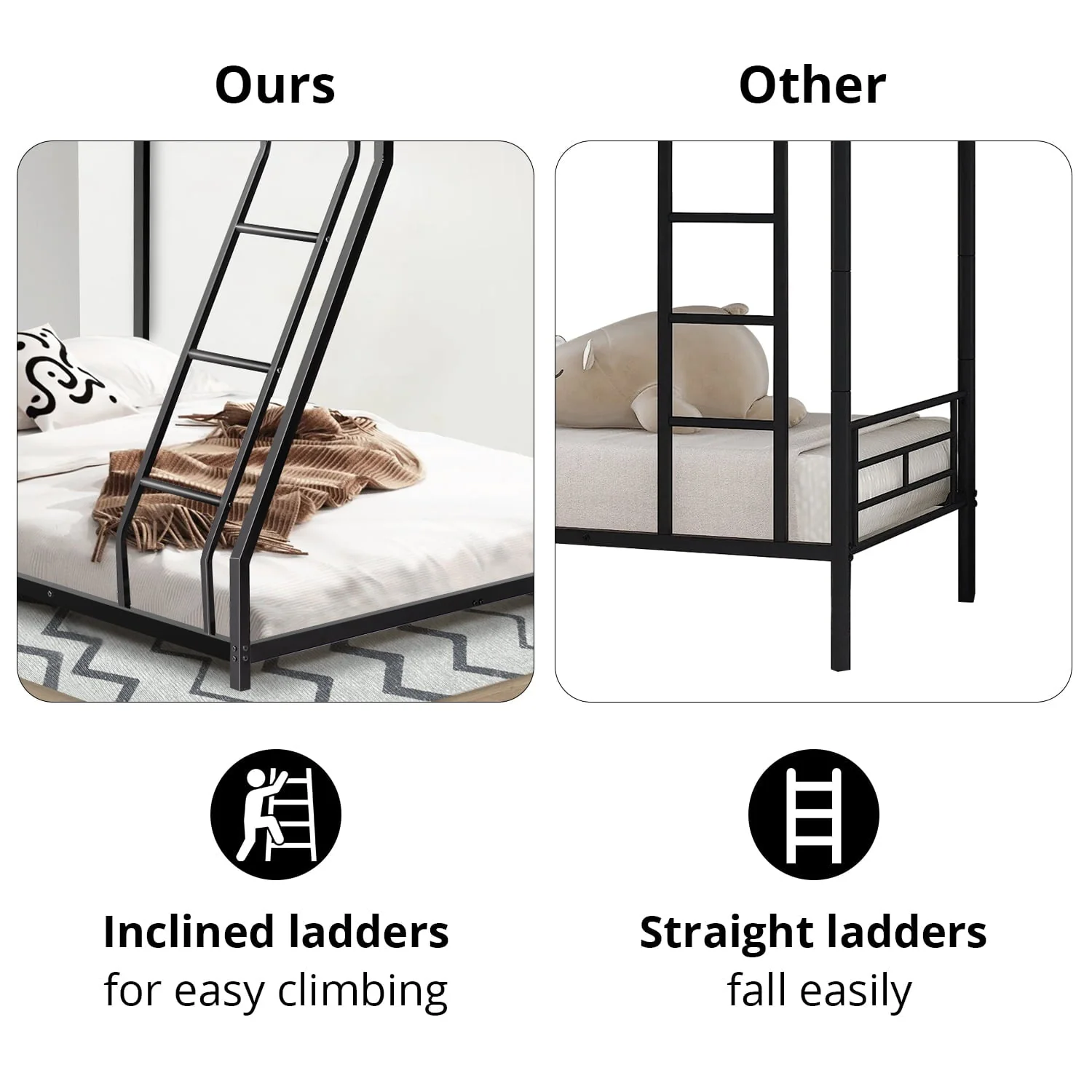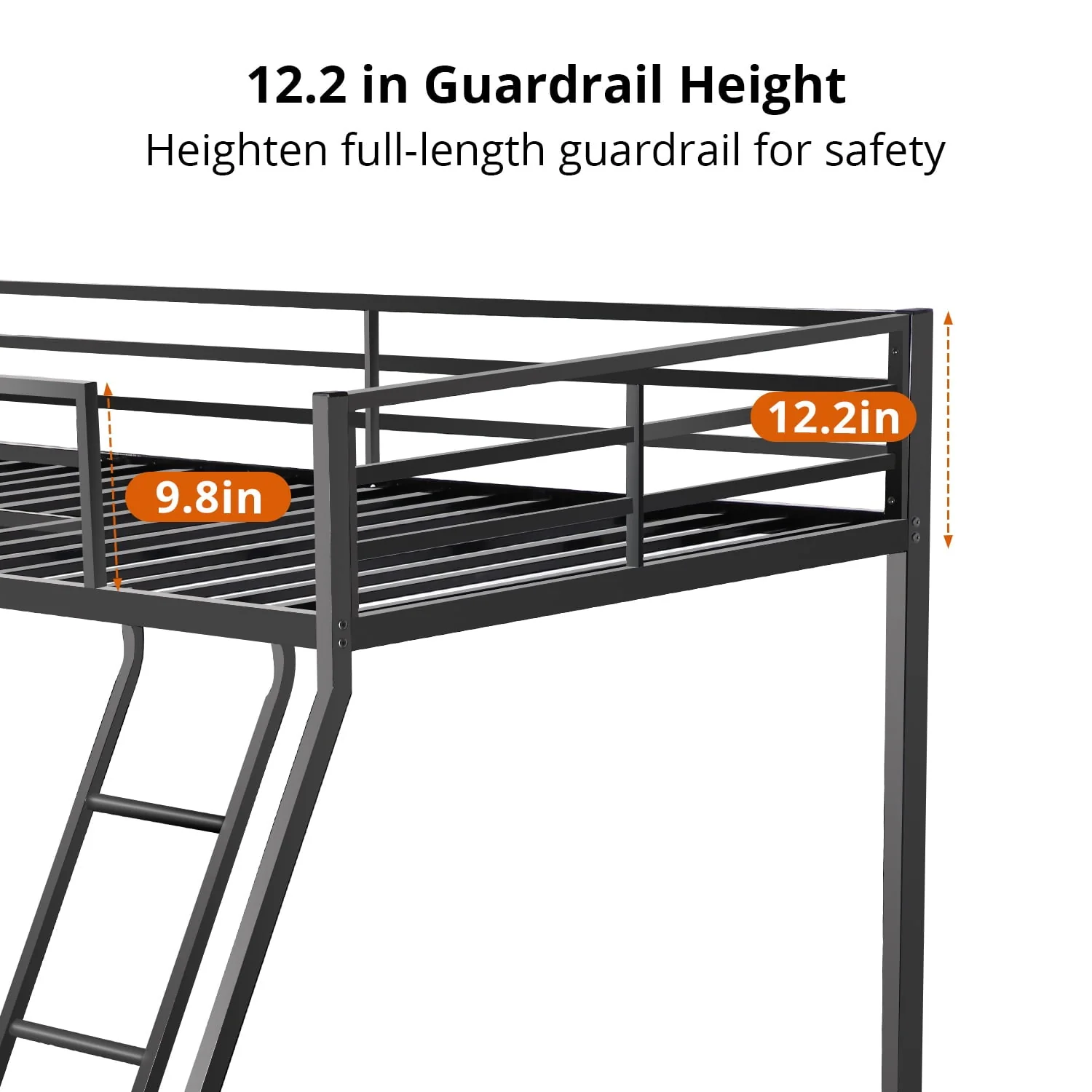Crafted from durable and sturdy metal, the industrial-style metal bunk bed boasts 21 separate metal slats on both the top and bottom bunks, ensuring exceptional durability and stability. The upper bed has a weight capacity of 250lbs, while the bottom bed can support up to 350lbs. Safety is a top priority, with a full-length guard rail height of 12.17 inches surrounding the top bunk and a built-in inclined ladder for easy access. The floor bed features a low-profile design, making it suitable for younger children to easily get in and out. Additionally, our twin over full bunk bed comfortably accommodates 2-3 children for a good night's sleep.