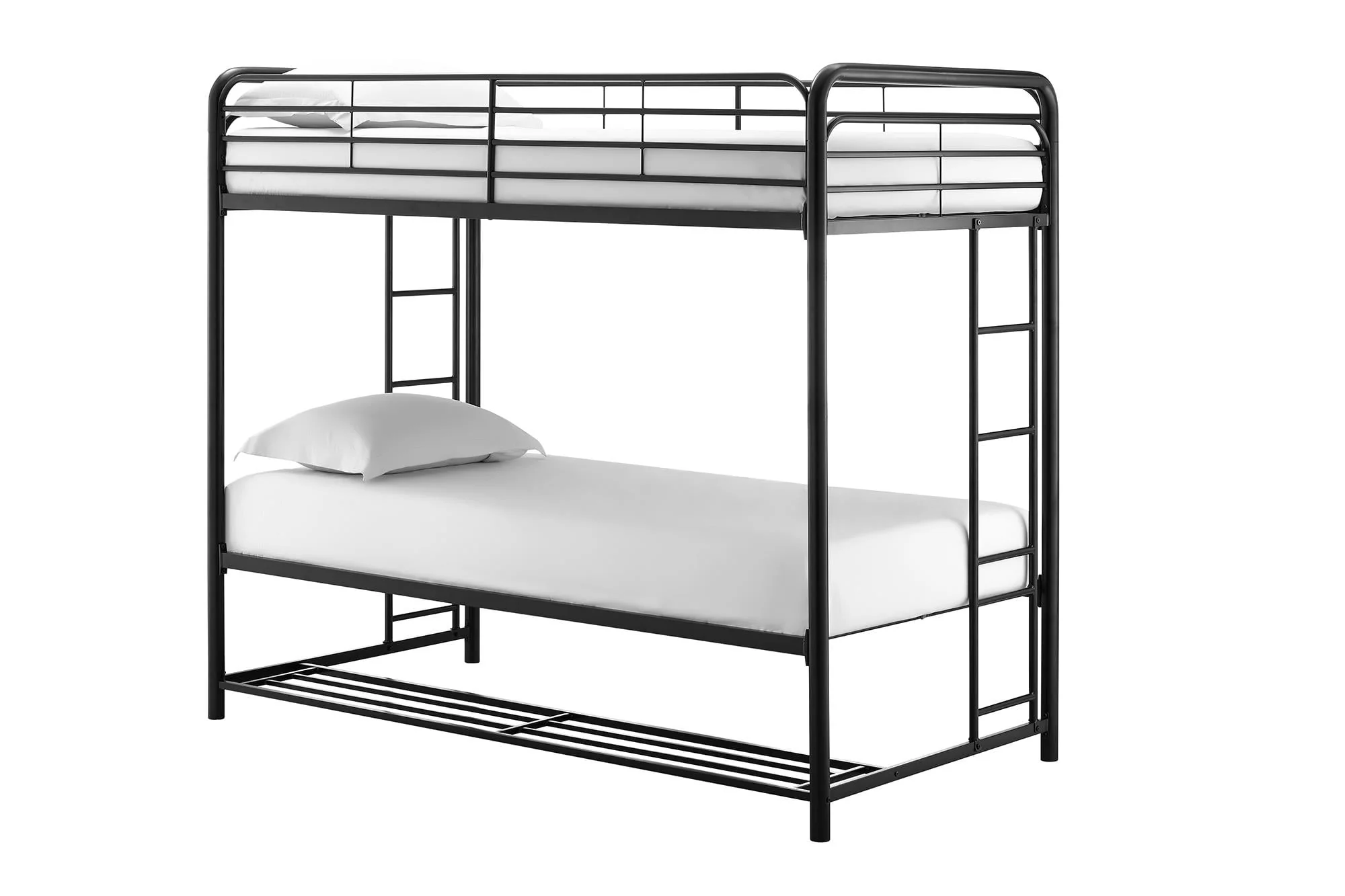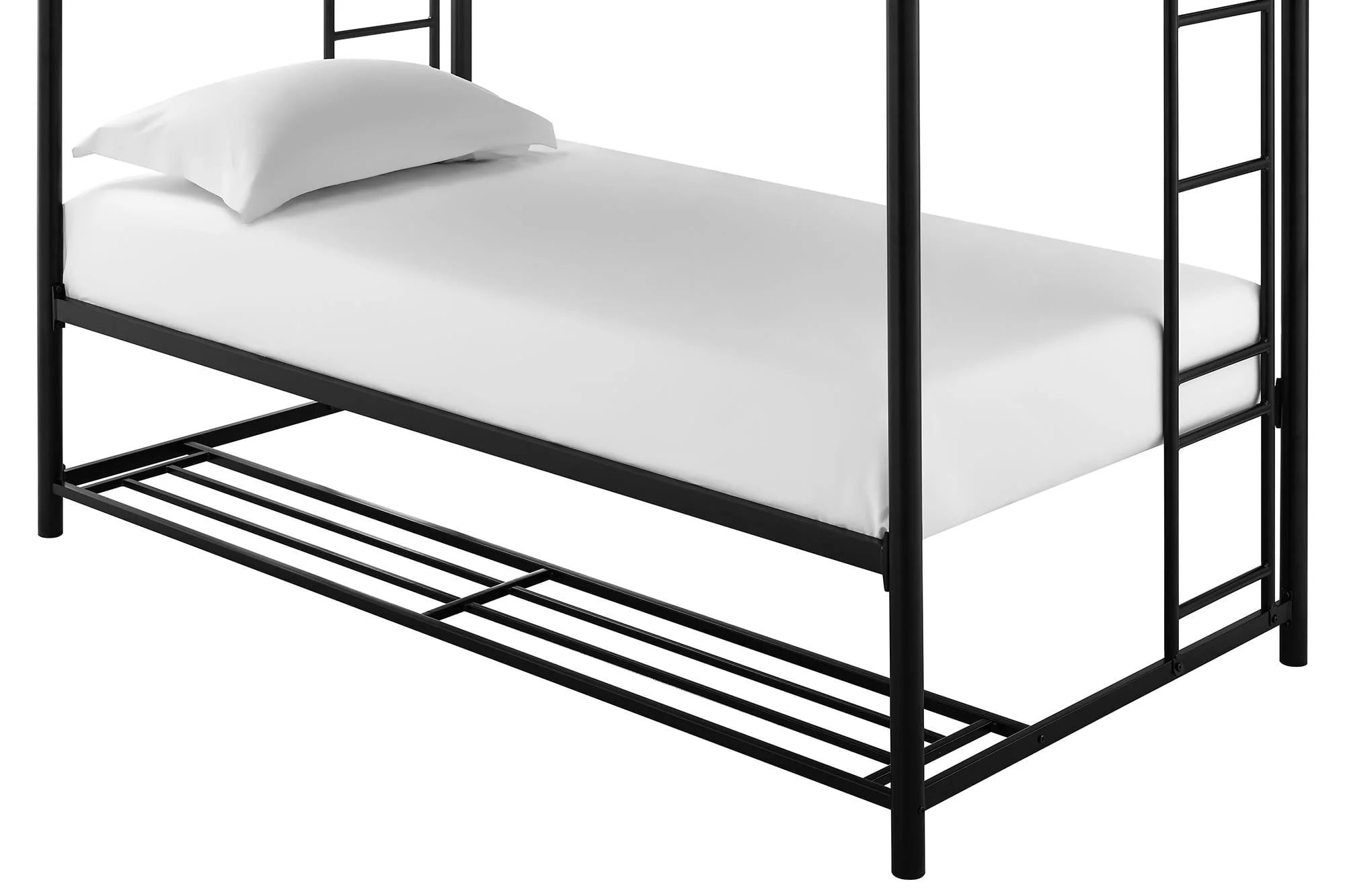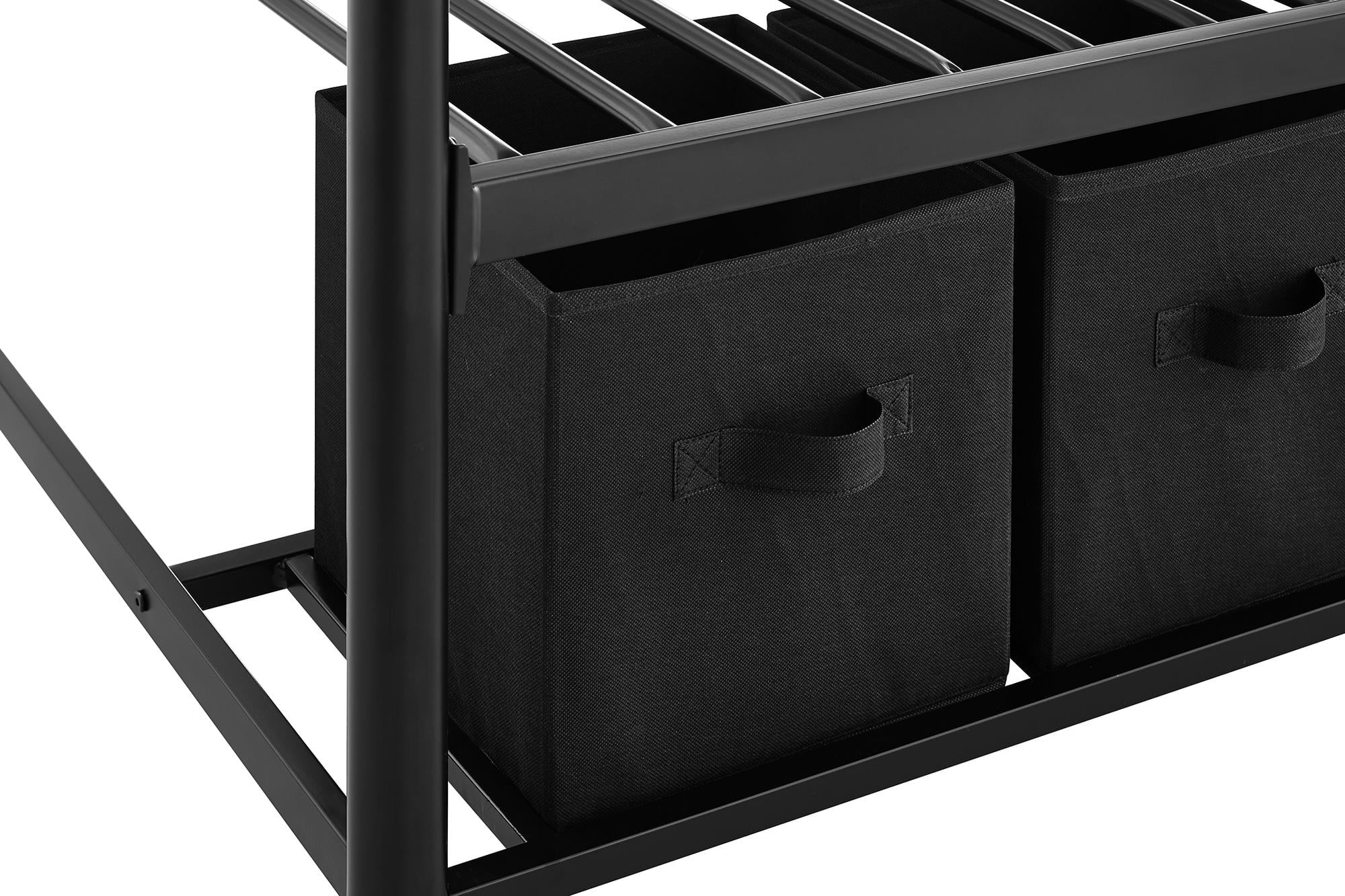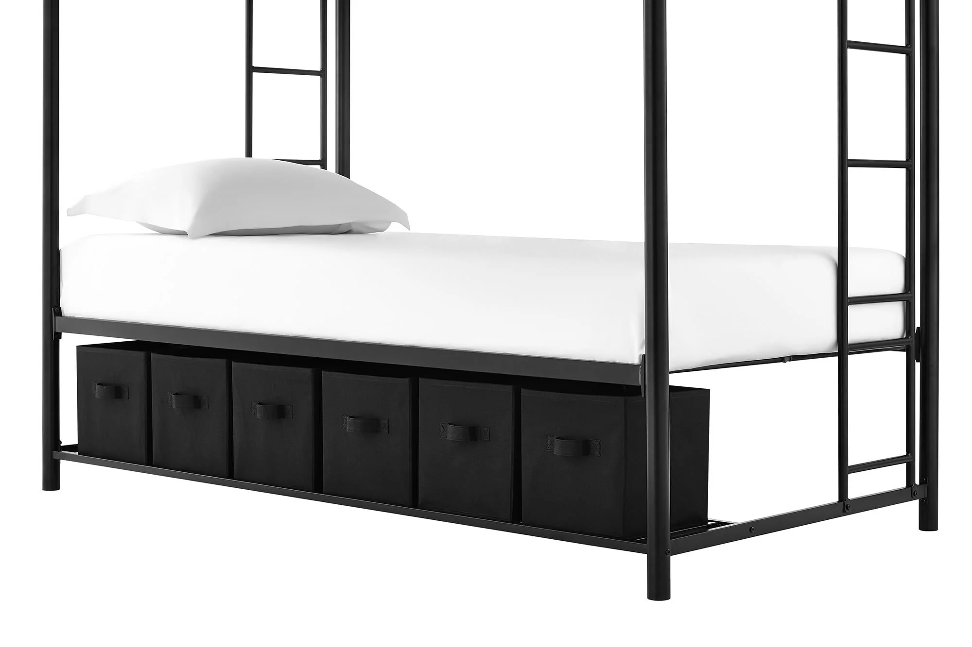 When you need to save room and make the most of your space, you need a bed that's designed with your family in mind. That's what makes the Mainstays bunk bed with storage the ideal solution for your busy home. The all-metal, twin-over-twin bunk bed is available in impressive black or silver metal and built to withstand all the wear and tear your kids can throw at it. Best of all, it comes with six handy storage containers under the base to keep all the kids' books, toys, extra clothes, or whatever else you need to tuck away. We've included two integrated bunk bed ladders to give you the flexibility to position the bed where you need it. Plus, the metal slat base on each bunk provides plenty of air circulation for mattresses, keeping them fresher for longer. Add a youth mattress or your favourite twin mattress and your kids may just go to bed when you ask them to! Mattresses are sold separately. Recommended mattress height for the top bunk is 6 inches.