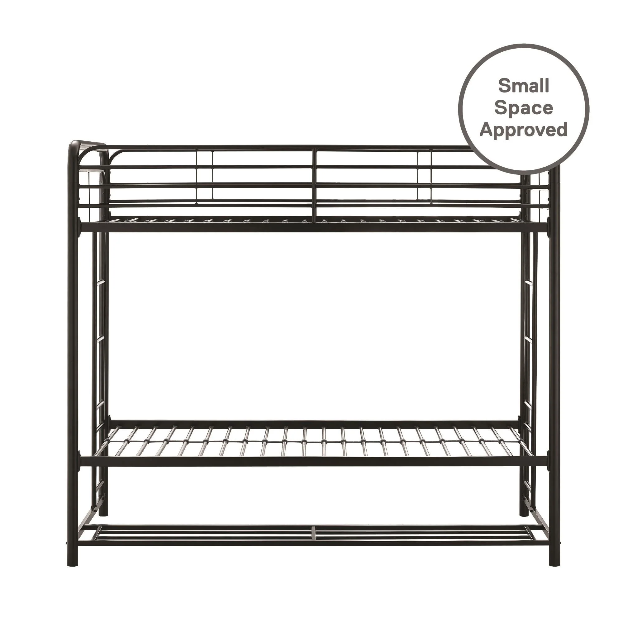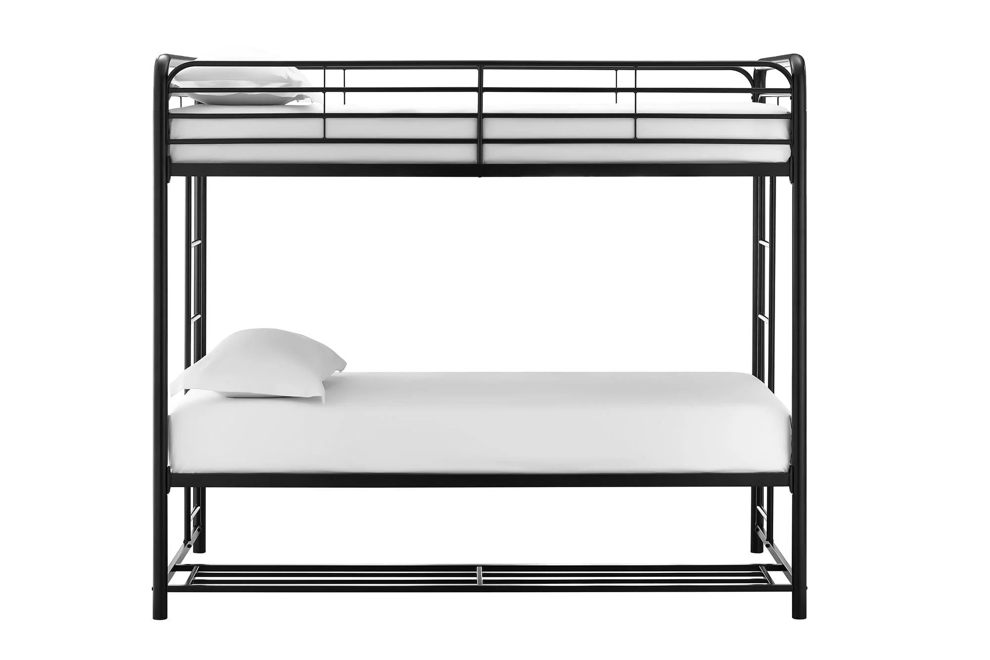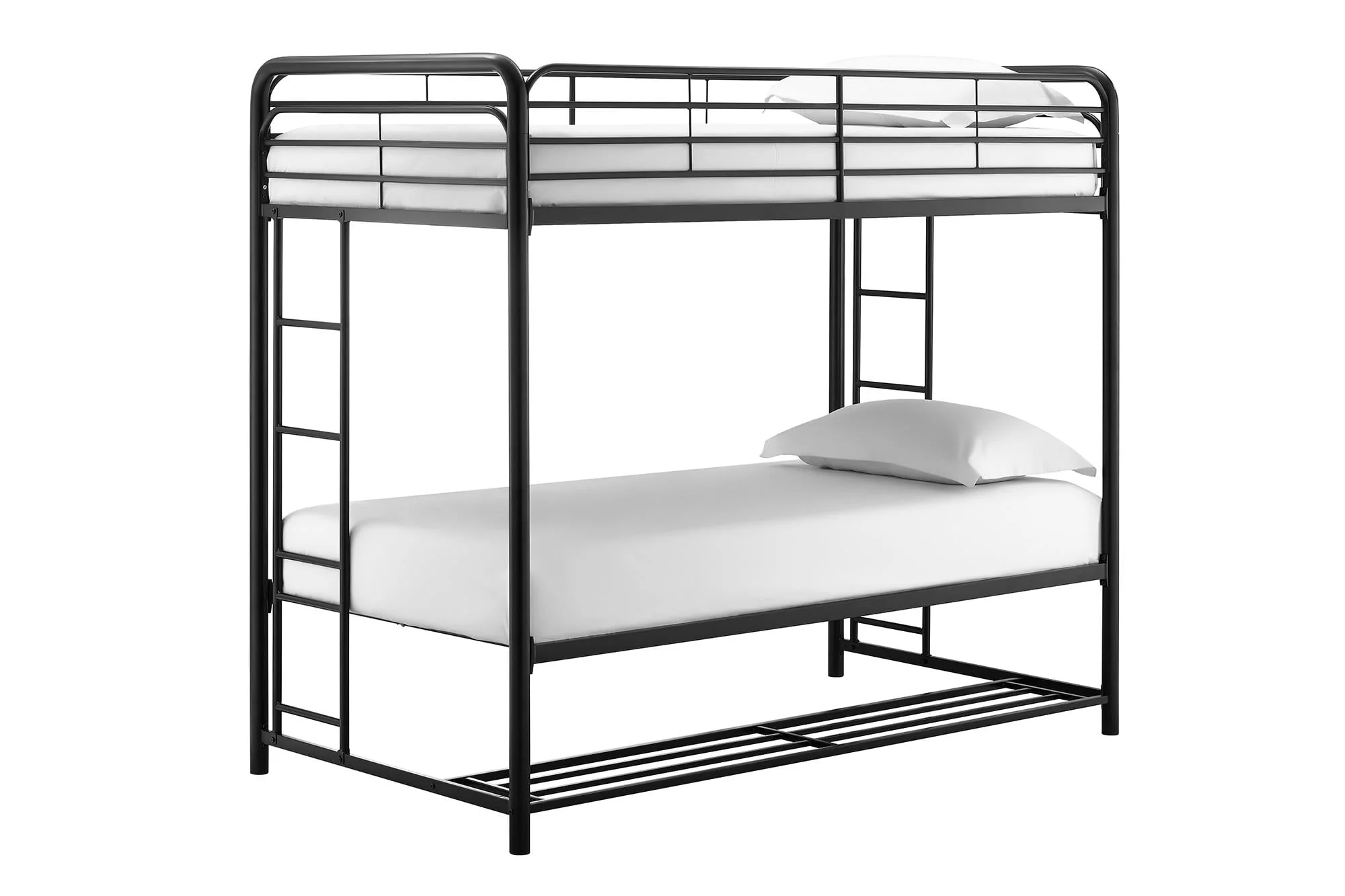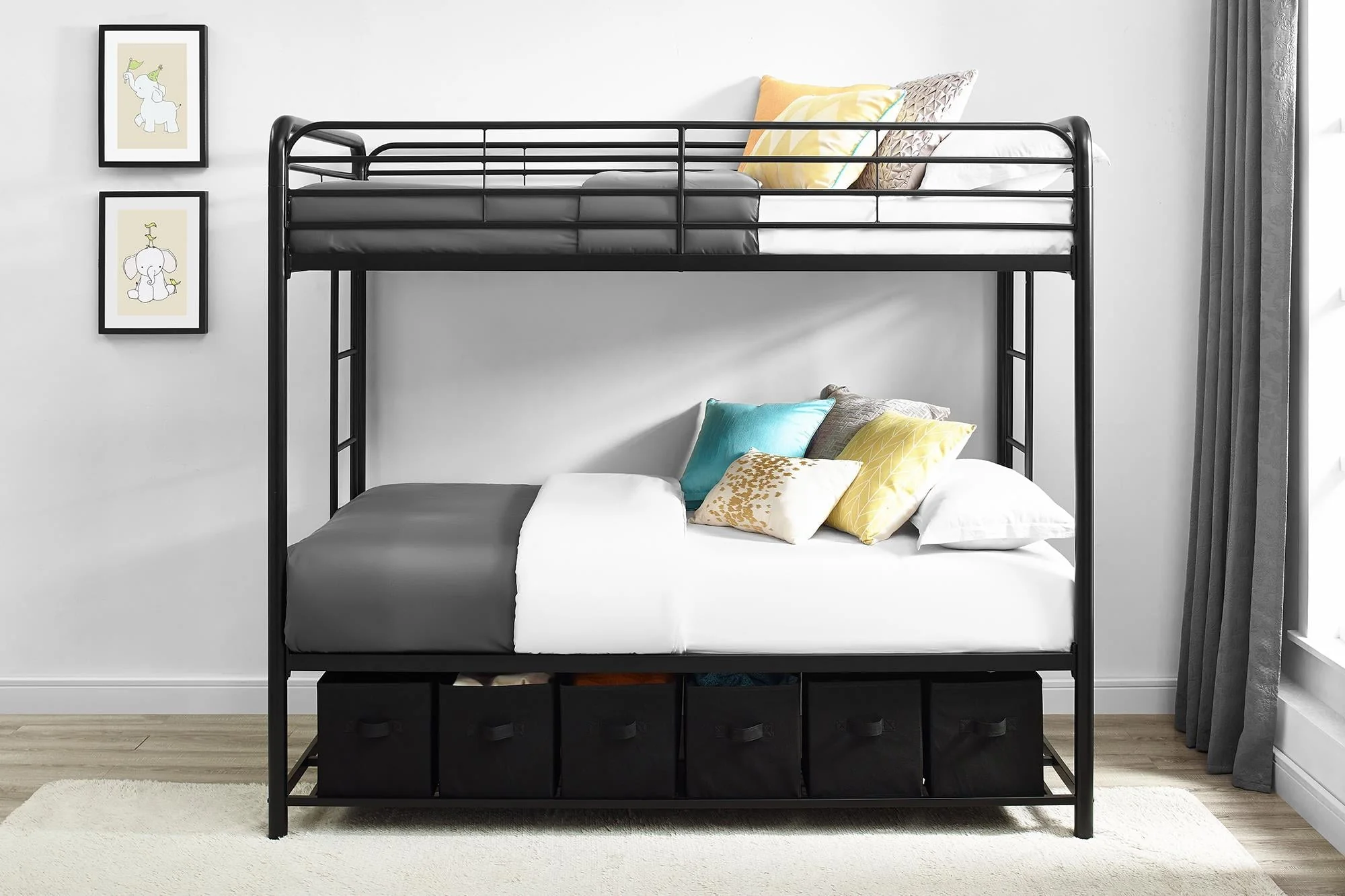 When you need to save room and make the most of your space, you need a bed that's designed with your family in mind. That's what makes the Mainstays bunk bed with storage the ideal solution for your busy home. The all-metal, twin-over-twin bunk bed is available in impressive black or silver metal and built to withstand all the wear and tear your kids can throw at it. Best of all, it comes with six handy storage containers under the base to keep all the kids' books, toys, extra clothes, or whatever else you need to tuck away. We've included two integrated bunk bed ladders to give you the flexibility to position the bed where you need it. Plus, the metal slat base on each bunk provides plenty of air circulation for mattresses, keeping them fresher for longer. Add a youth mattress or your favourite twin mattress and your kids may just go to bed when you ask them to! Mattresses are sold separately. Recommended mattress height for the top bunk is 6 inches.
