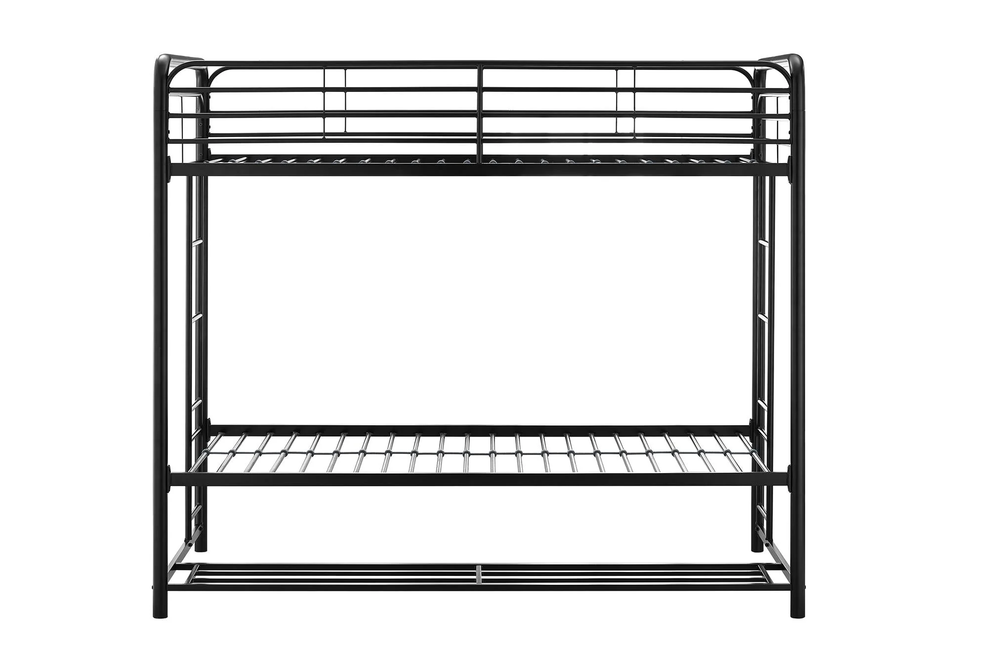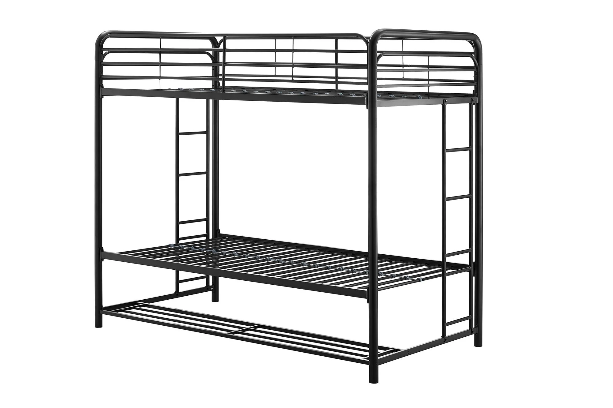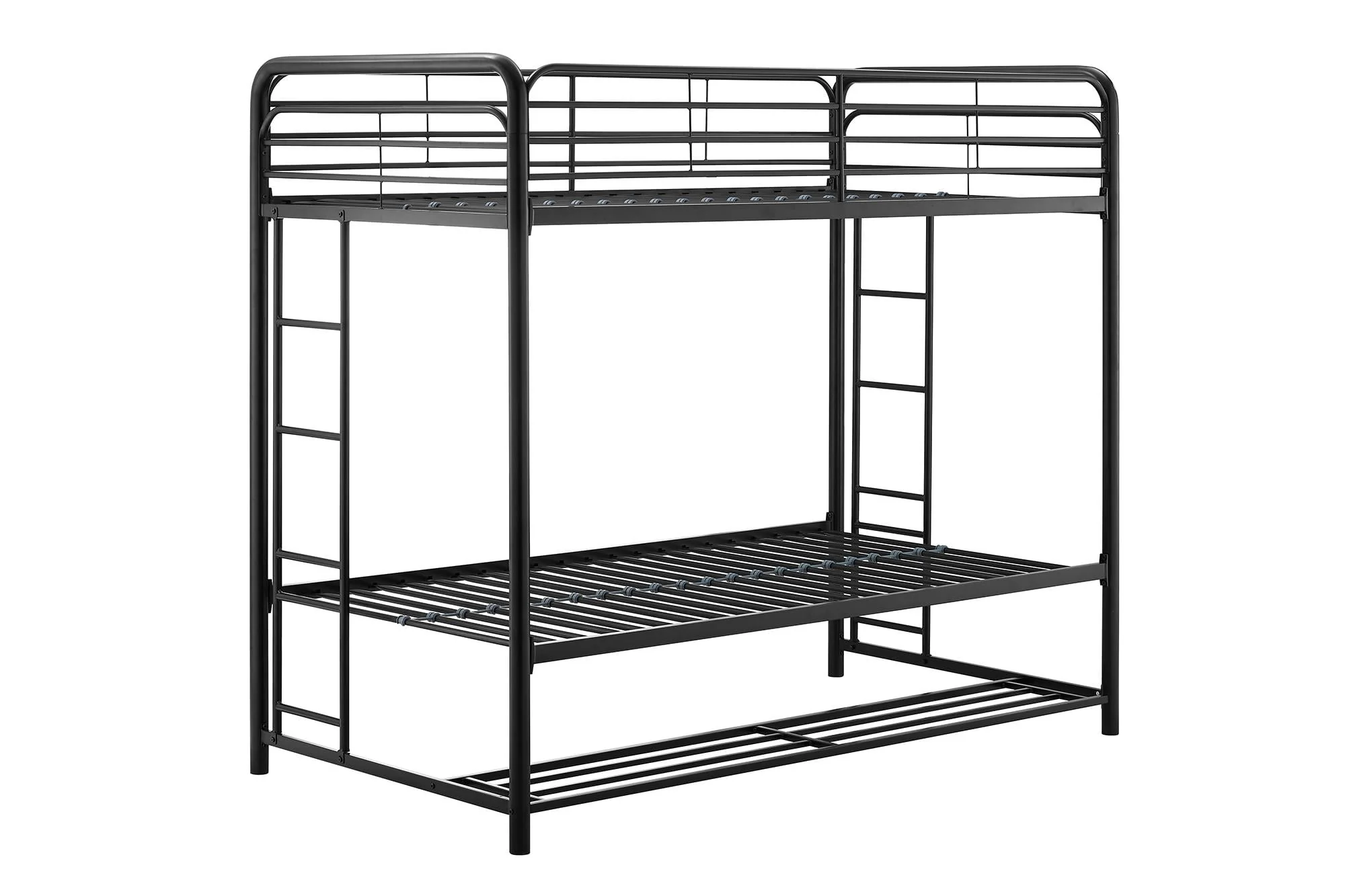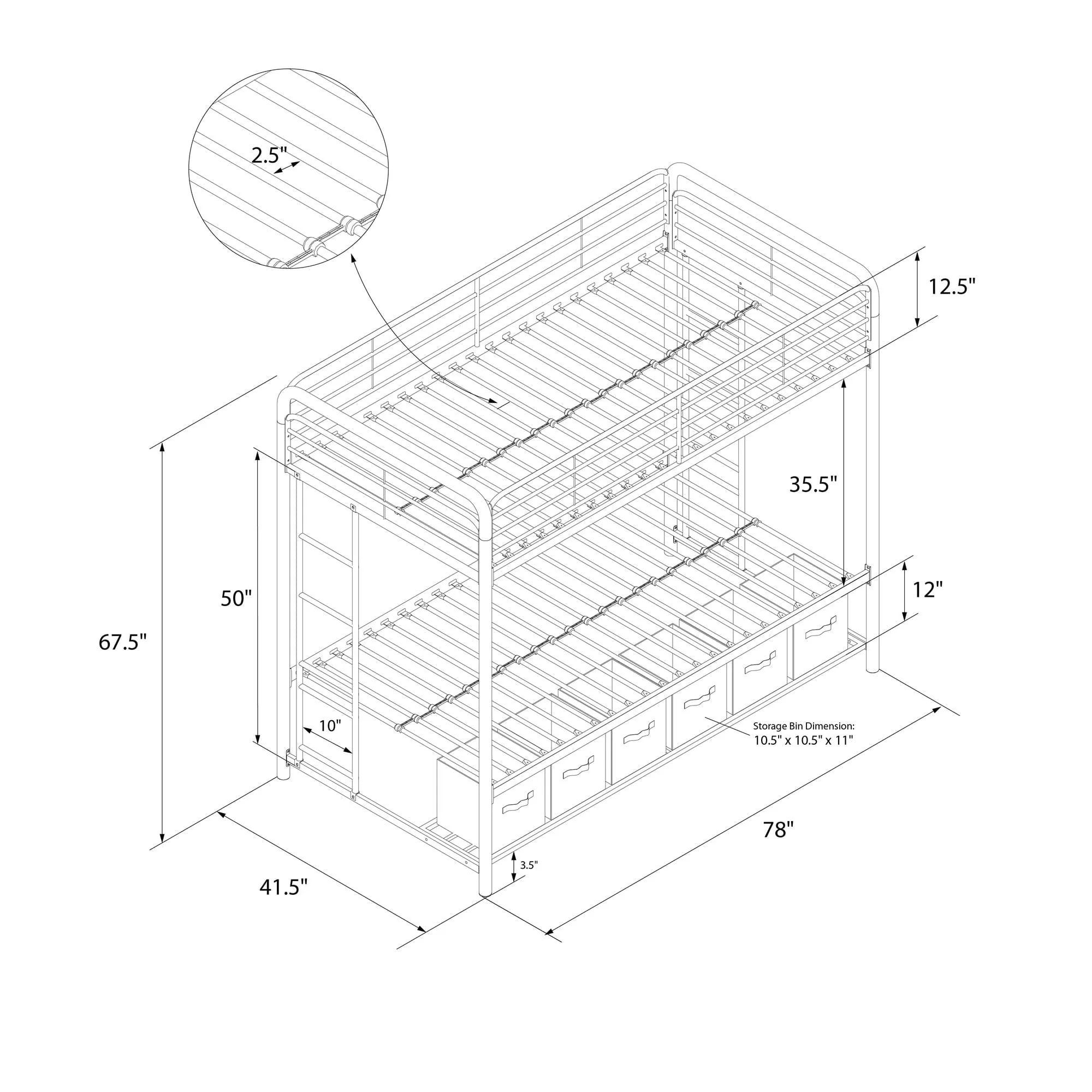 When you need to save room and make the most of your space, you need a bed that's designed with your family in mind. That's what makes the Mainstays bunk bed with storage the ideal solution for your busy home. The all-metal, twin-over-twin bunk bed is available in impressive black or silver metal and built to withstand all the wear and tear your kids can throw at it. Best of all, it comes with six handy storage containers under the base to keep all the kids' books, toys, extra clothes, or whatever else you need to tuck away. We've included two integrated bunk bed ladders to give you the flexibility to position the bed where you need it. Plus, the metal slat base on each bunk provides plenty of air circulation for mattresses, keeping them fresher for longer. Add a youth mattress or your favourite twin mattress and your kids may just go to bed when you ask them to! Mattresses are sold separately. Recommended mattress height for the top bunk is 6 inches.