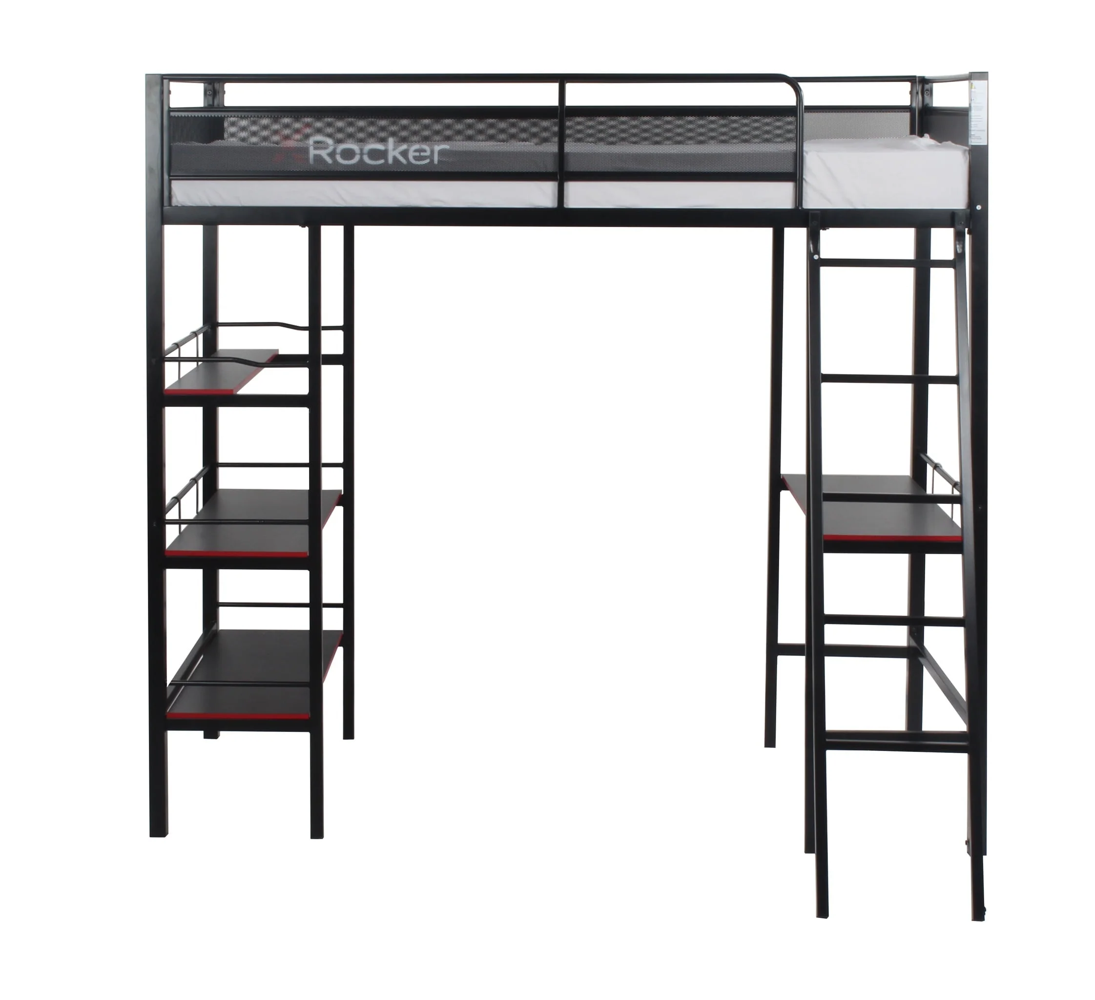 Get ready to conquer the virtual battlefield with the X Rocker Fortress Gaming Bunk Bed. Ideal for gaming, studying, and displaying collectables, the built-in desk features 3 shelves with a smooth carbon fiber effect and red wooden trim. The versatile desk space is spacious enough to hold TVs or PC monitors of up to 40". Pull up an X Rocker gaming chair to create the ideal gaming setup. With a sturdy metal frame and slats, this bed is designed with long-lasting durability in mind. The fixed ladder positioned on the right hand side ensures your child is safe climbing in and out of bed. Measuring 77.6" x 59.17" x 72", this twin high sleeper bed is perfectly suited for younger gamers. Founded in 1992, Ace Casual Furniture specializes in furniture designed to fit into your lifestyle. Their top-quality home furnishings are custom made at a price you can afford. The products they use are sourced from around the world, resulting in pieces you can't get anywhere else. Every item they offer combines style and function in an exceptional way.