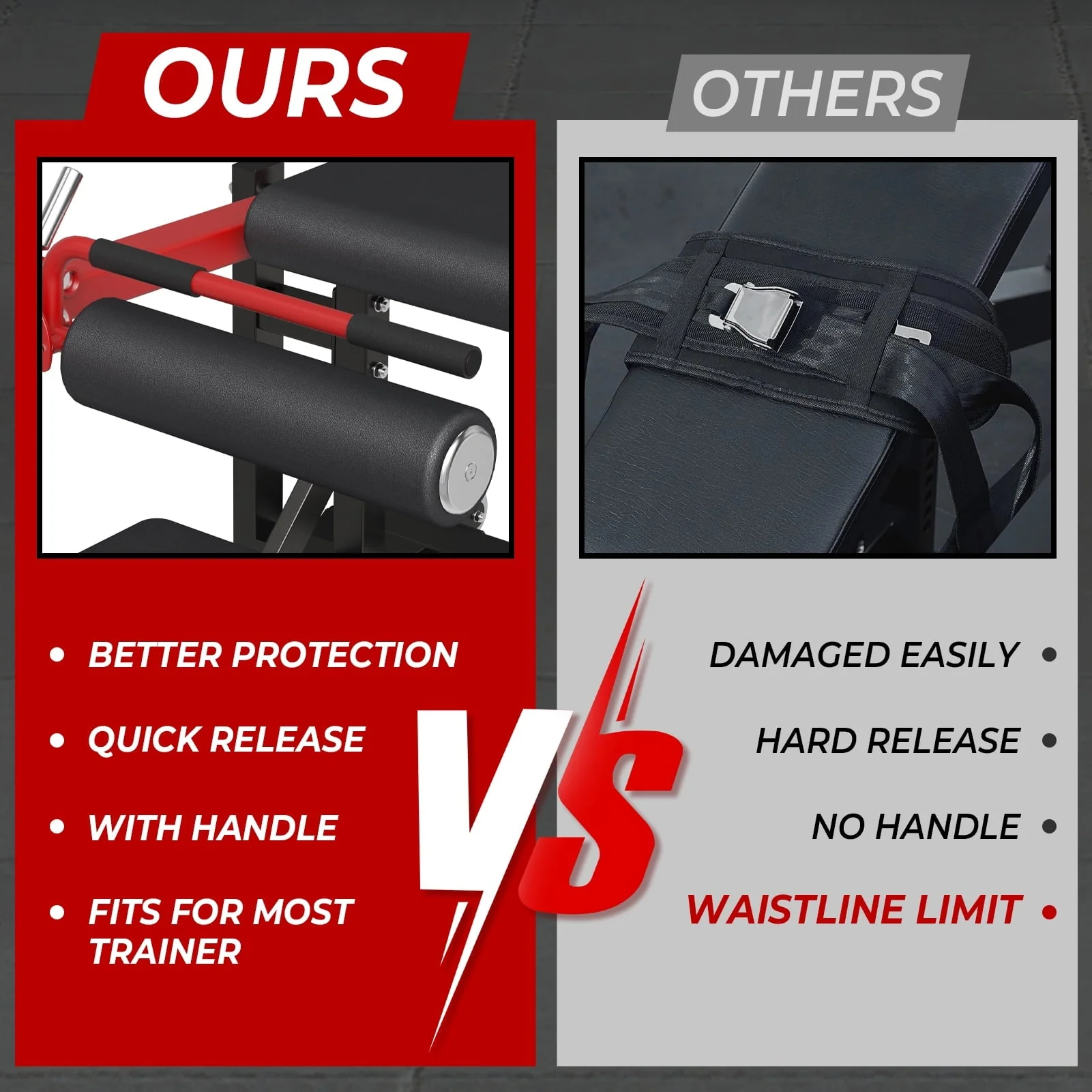 Our new generation glute bridge machine is designed with two angles on the footboard. The inclined angle targets your gluteus maximus, and the flat angle targets your gluteus minimus. Feel free to choose the gluteus you want to train!