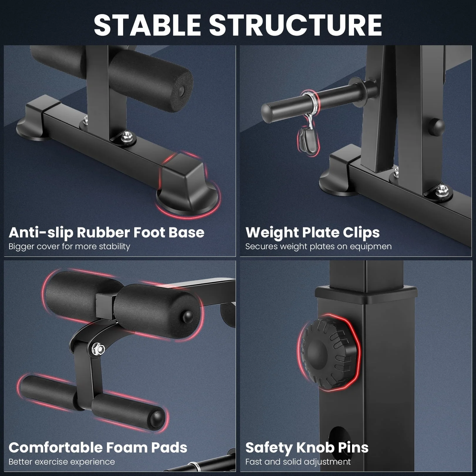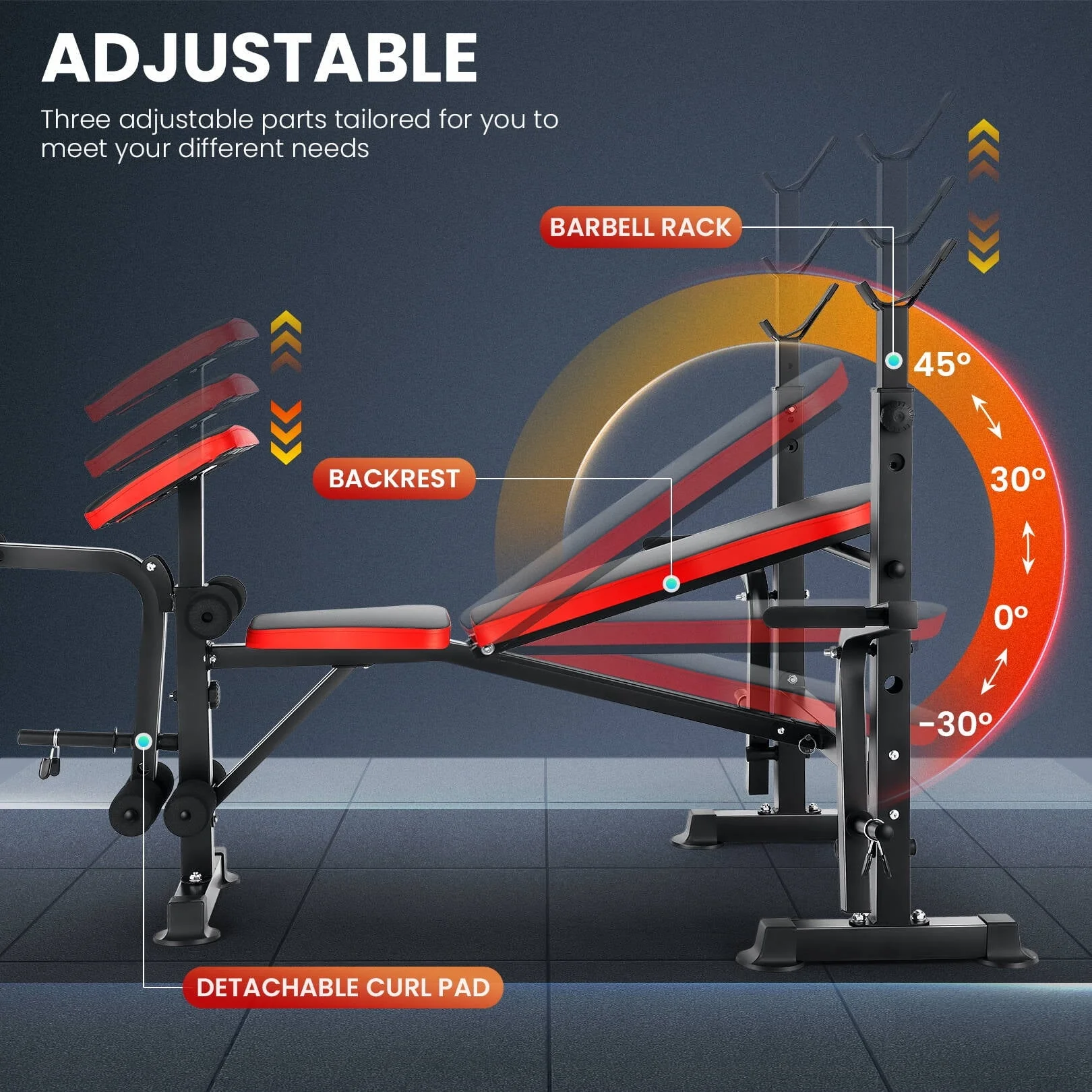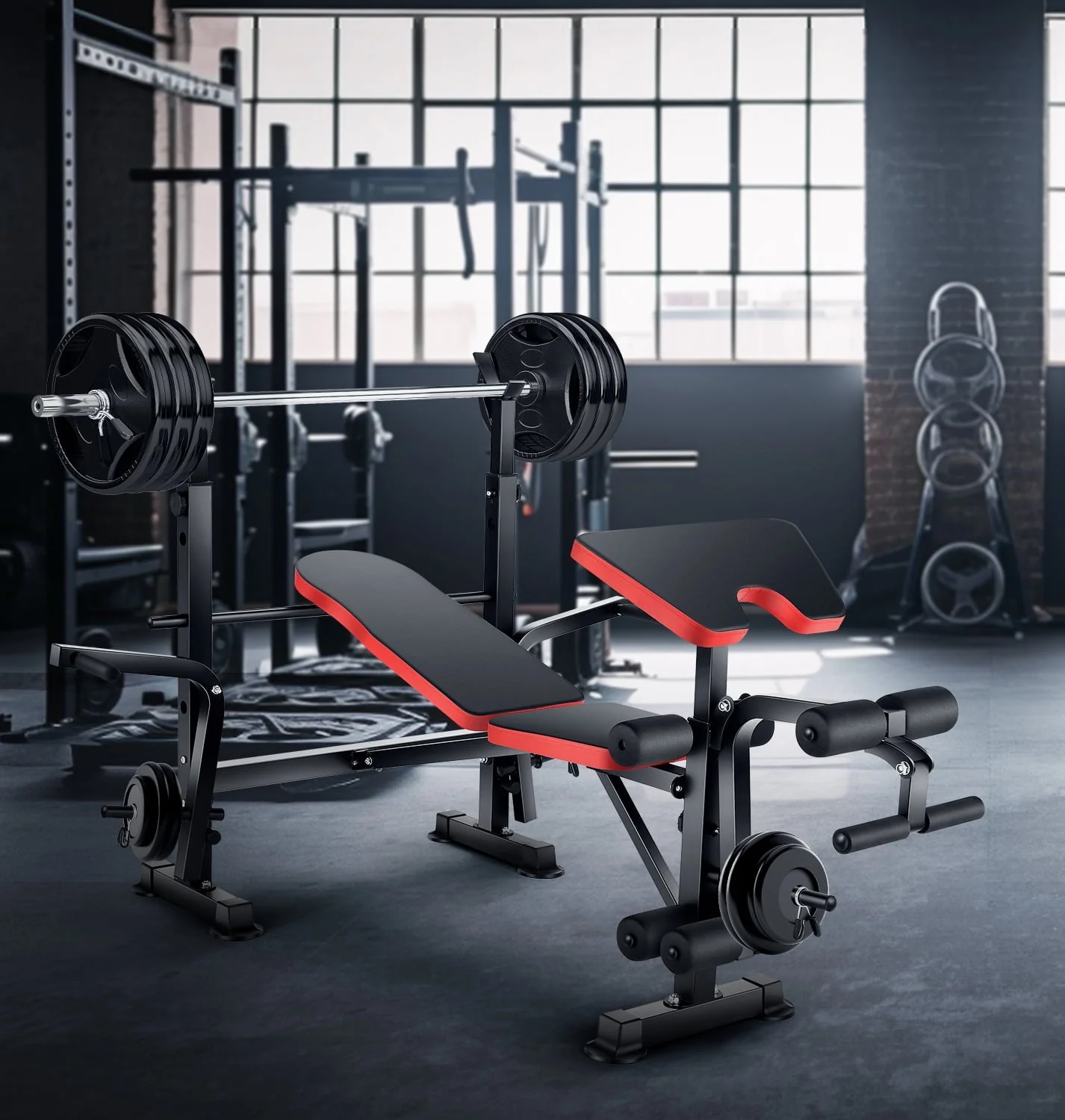 VIBESPARK Olympic Weight Bench combines quality and functionality to bring you a perfect piece of home gym equipment. If you're tired of spending thousands on equipment or paying monthly gym fees, customize your personal home gym instead. We're dedicated to bringing gym-quality workout and weightlifting equipment to the comfort and convenience of your own home. This Olympic Weight Bench with Barbell Rack & Leg Developer Preacher Curl Rack will bring you the workout you crave. Whether you're bulking up your upper body with some chest presses or toning those muscles with leg lifts, this equipment is the ideal all-in-one machine. Deluxe cushions, barbell rack, leg developer preacher curl rack, and a no-pinch grip design combine to give you a smooth and comfortable workout. This bench is compatible with Olympic weight sets up to 600 lbs, so you can work out with the pros. Save time, money, and space in your home gym by adding this weight bench to your routine. Try our family of products for all your at-home exercise equipment.