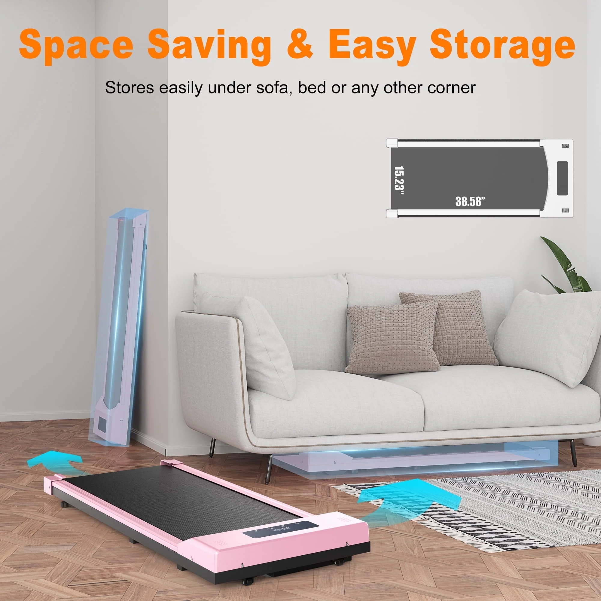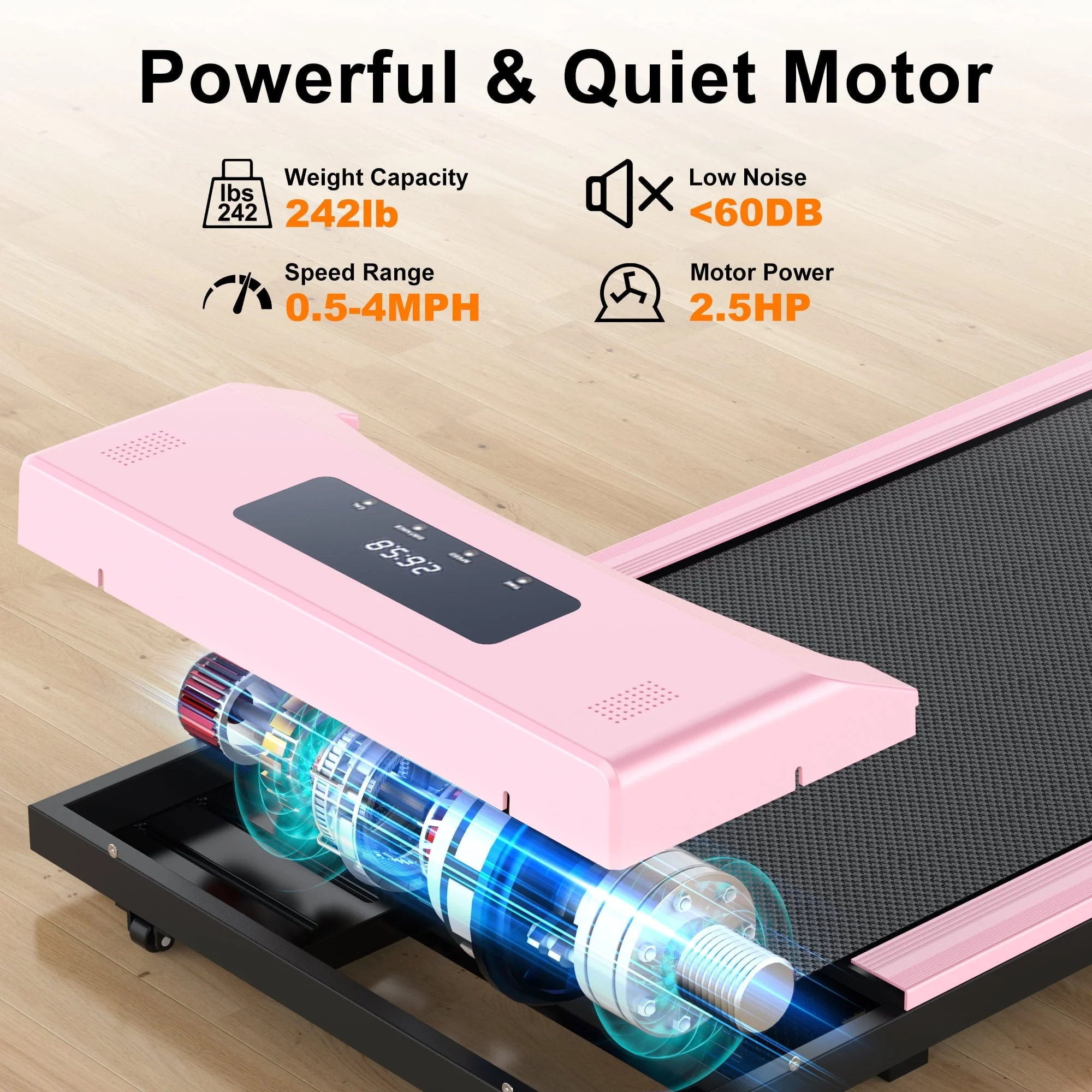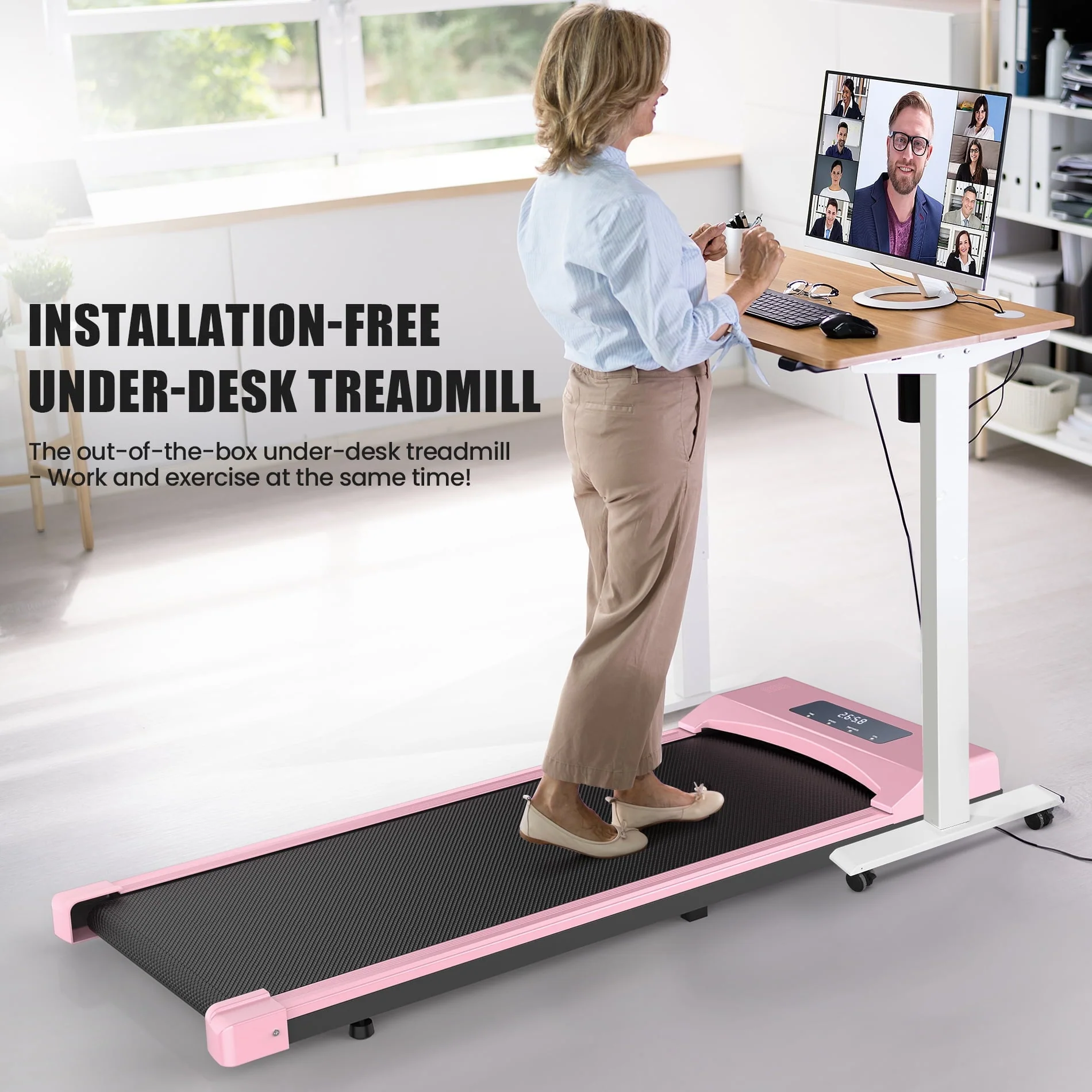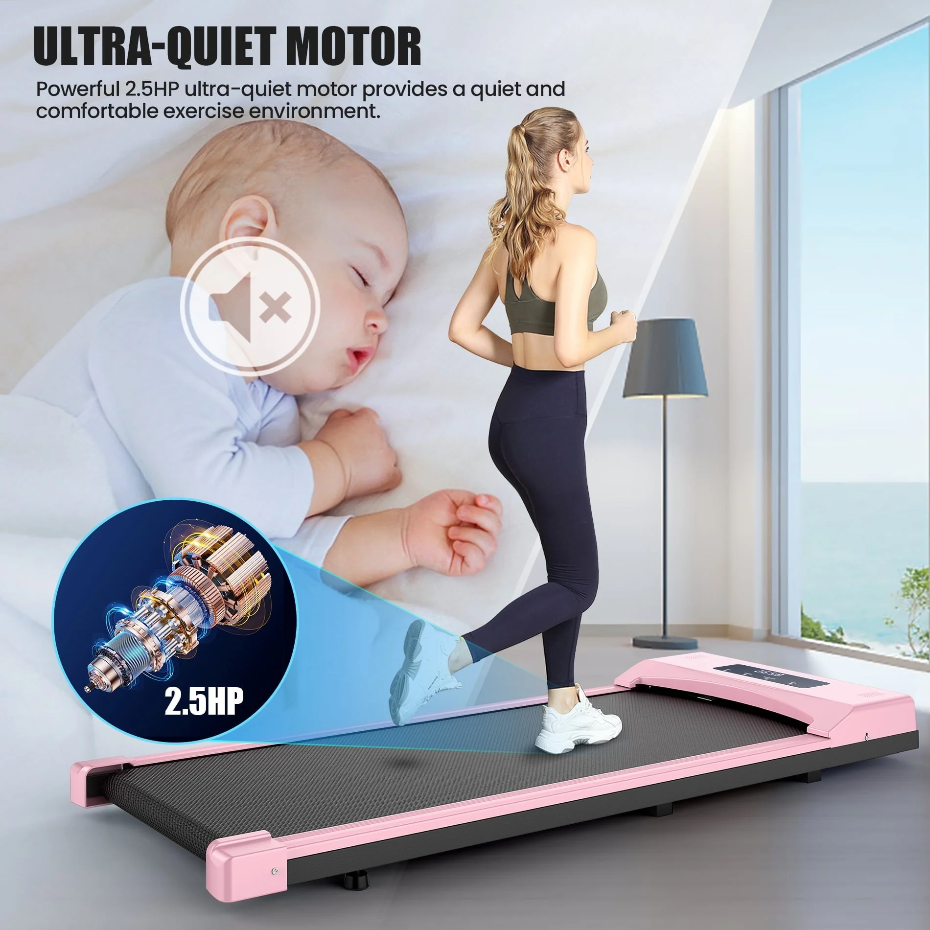Adnoom Under Desk Treadmill, 2.5HP Installation - Free Slim Flat Compact Treadmill, Electric Quiet Walking Treadmill with LED Display and Wireless Remote Control for Home/Office (Pink)