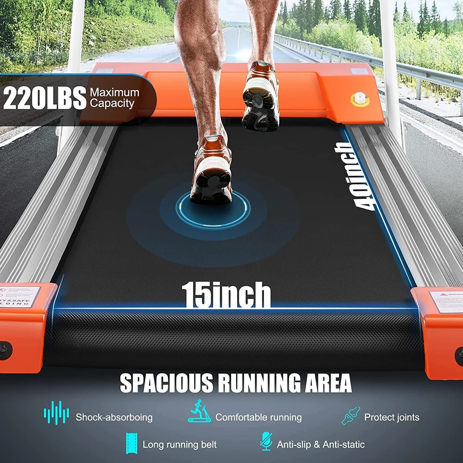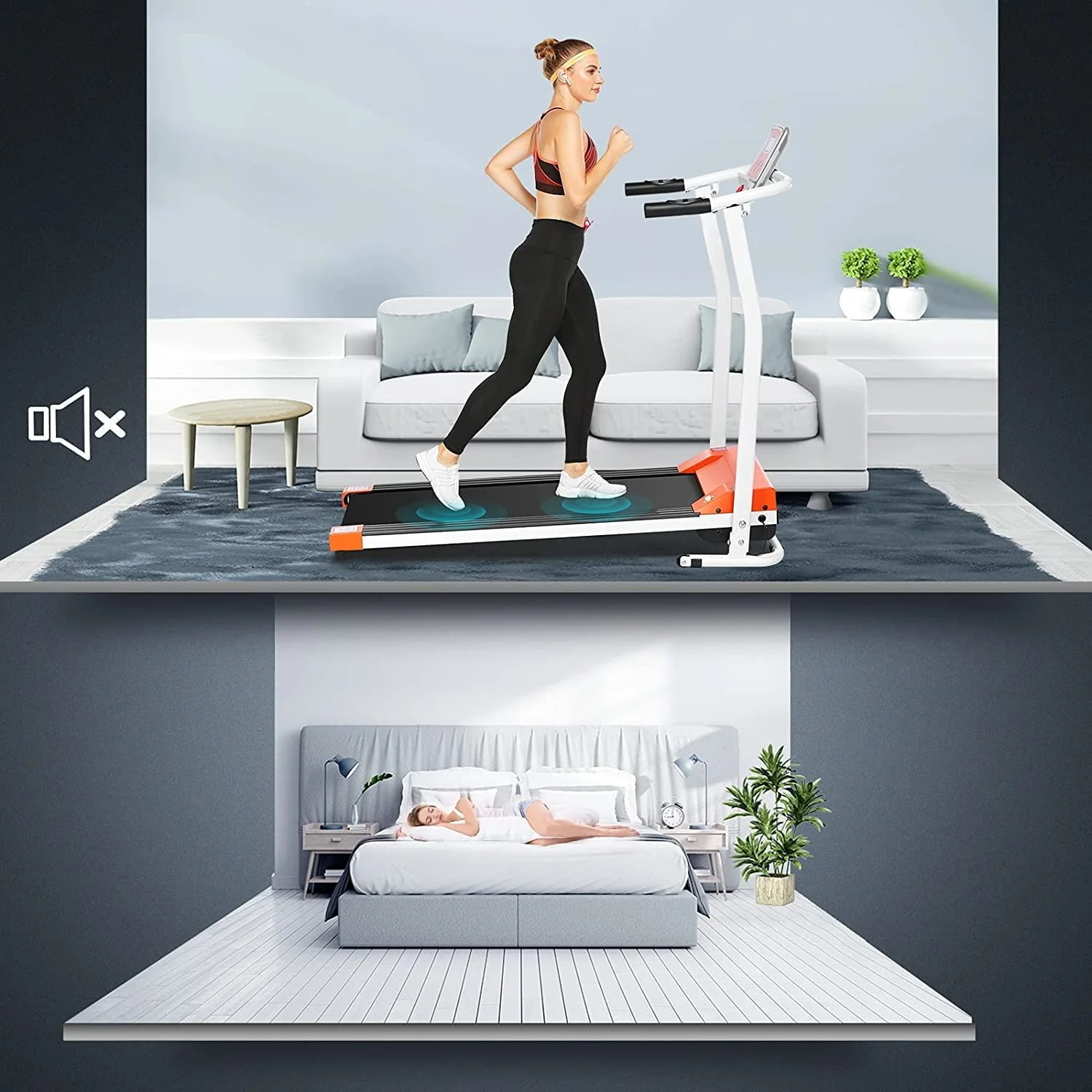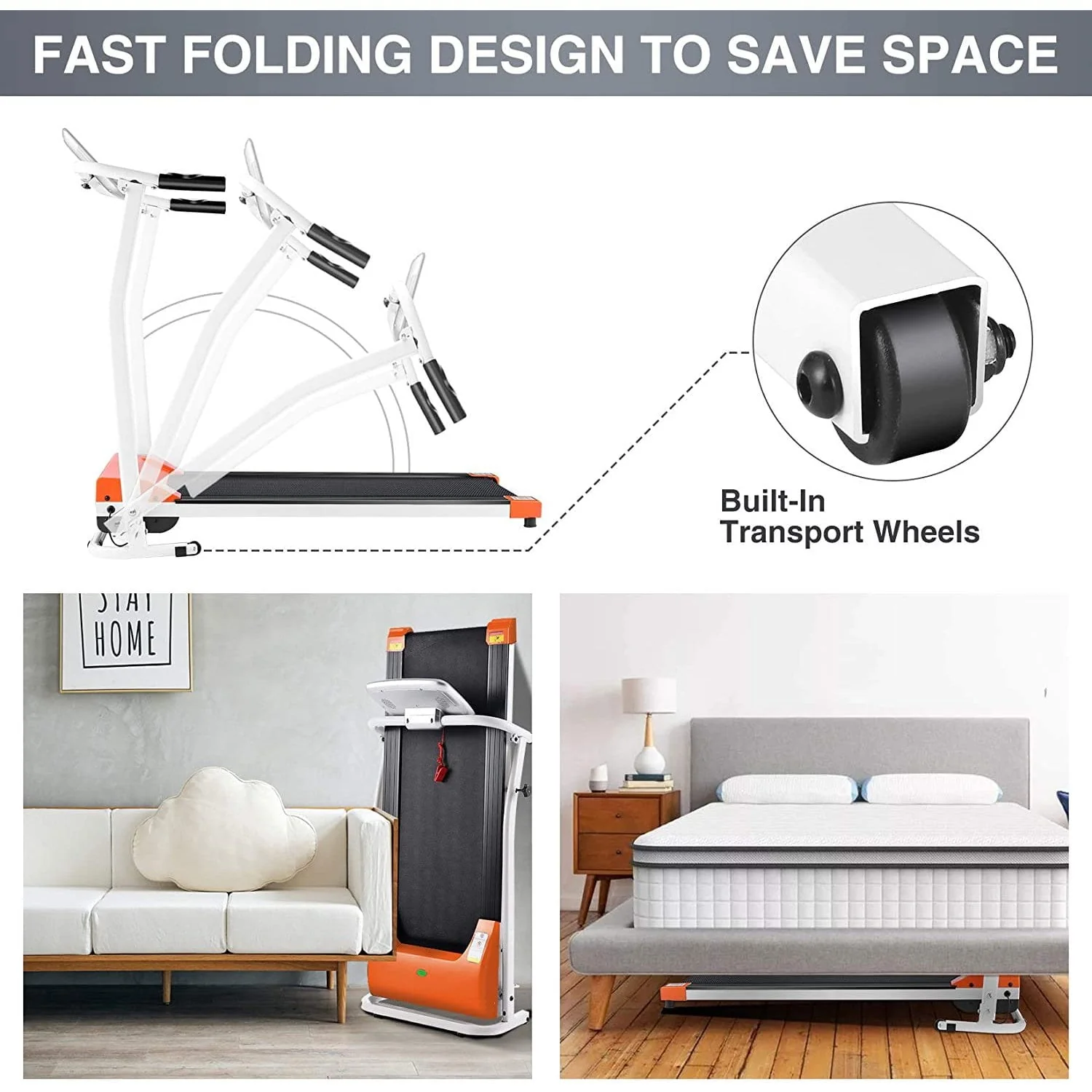 🌰【Space-Saving Design】This foldable treadmill has a compact footprint and a quick-folding design with convenient transport wheels for easy mobility. You can store it in the living room, study, small corner, or under the bed. Sturdy steel frame for durability; up to 220lb.