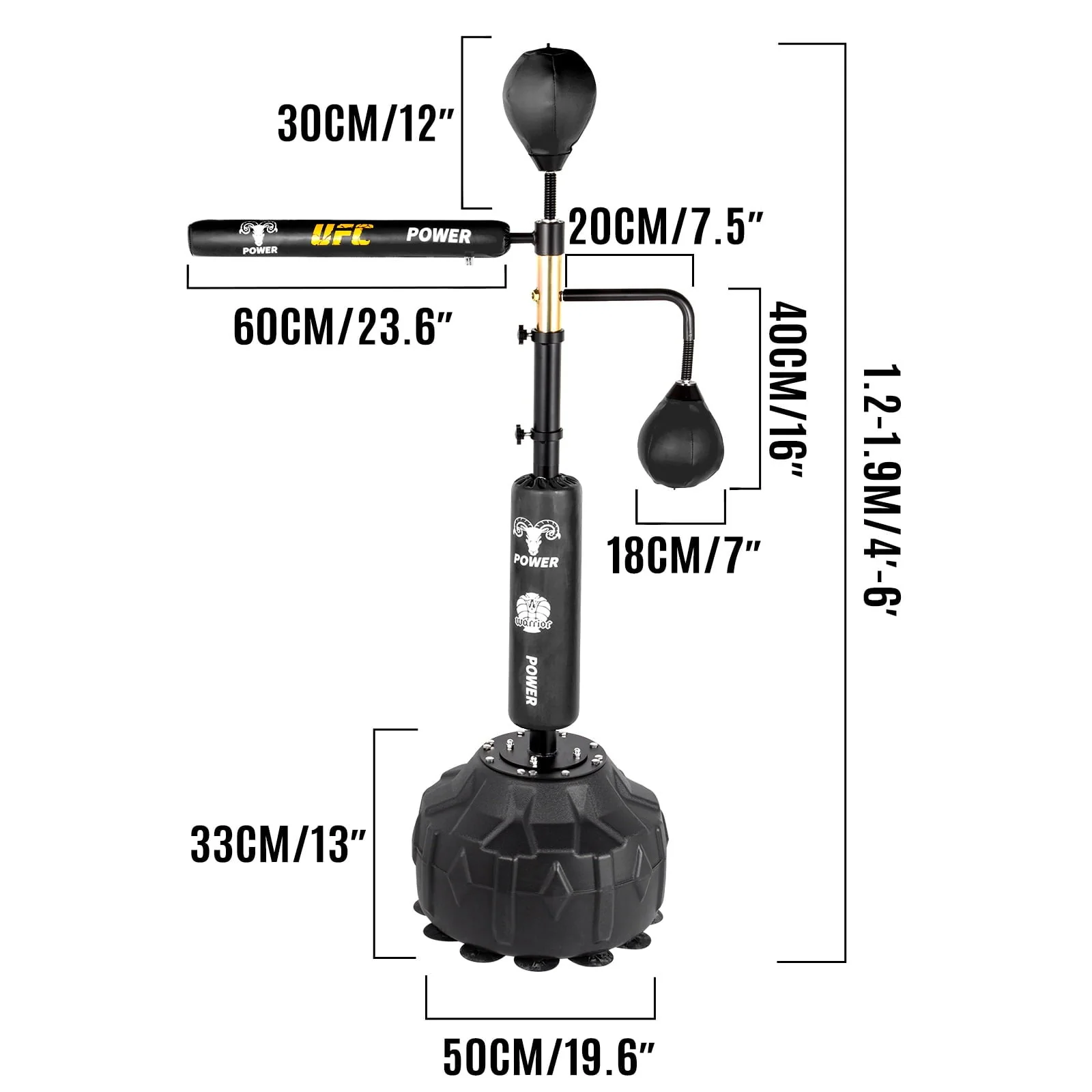 The large base with 12 suction cups measures 19.6''/50 cm in diameter and 13''/ 33 cm in height, after added water or sand, it is stable enough to withstand strong punch and kick.