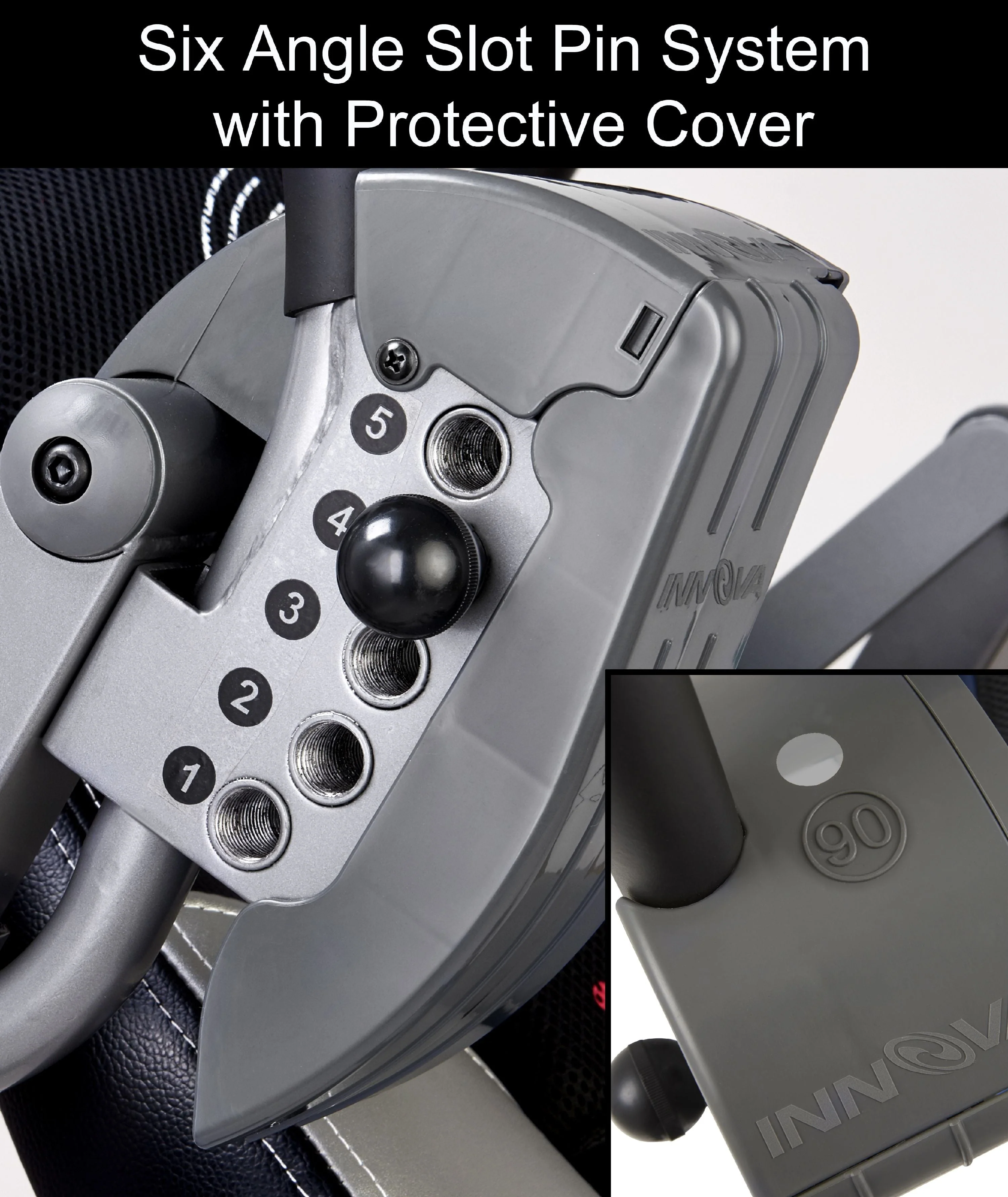 �?Six (6) Position Adjustable Pin System with added Patented Protective Cover for easy positioning