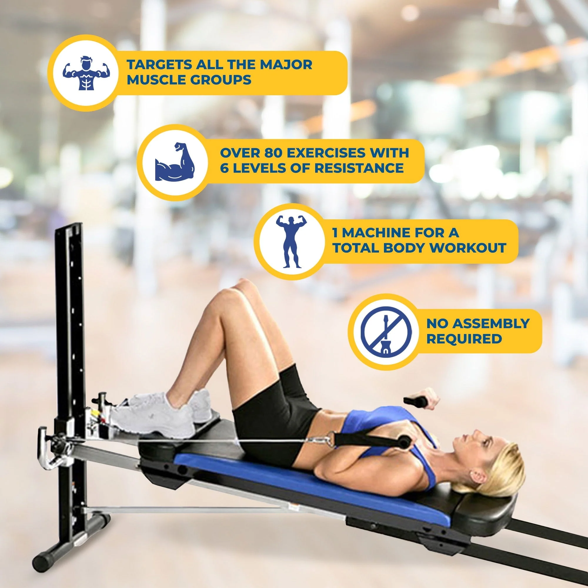 With the capabilities of more than 80 exercises with 6 levels of resistance conveniently packed into 1 foldable home machine, your adrenaline will be flowing and endorphins released as you go between cardio, strength training, and stretching. Fully equipped with a ribbed squat stand, wing attachment, leg pull accessory with 2 ankle cuffs, exercise chart, training deck, and nutritional meal planning guide. Take the guesswork out of exercising with access to Total Gym training videos and feel confident knowing you can keep up with the most experienced fitness buffs. With no assembly required, you can save the hard work for the machine.