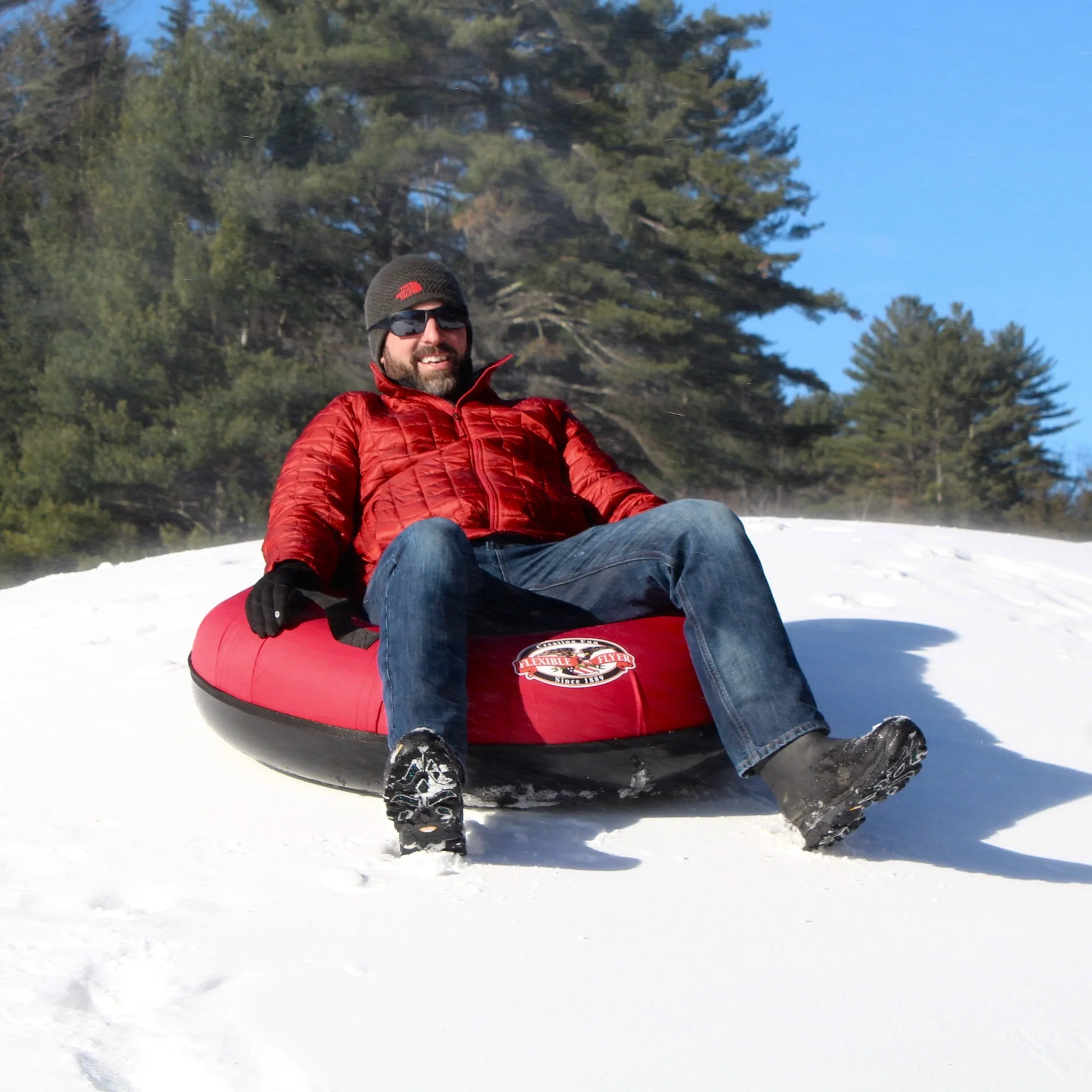 Originally designed for commercial tubing parks, this Flexible Flyer hard plastic-bottomed snow tube offers the cushion of a winter tube with the speed of a fast plastic sled. It features a heavy duty, hard shell plastic bottom to prevent punctures. The thick black rubber inner tube and 1000 denier Cordura nylon cover withstand rugged conditions. Hammock web straps provide even support while the cushioned inflatable sled tube absorbs bumps, providing a much smoother ride than hard plastic snow sliders. The slick-coated hard-shell base provides an ultra-smooth sliding surface that makes this sledding inner tube glide over snow. For even more speed, apply a light coat of wax. The black inner tube has a Schrader valve that inflates just like car tires. The built-in tow strap make it easy to carry and pull back up the hill. A kids and adult snow tube, heavy duty conditions are where it thrives! A snow sled for adults and kids age 5 and up. Measures 42 x 42 x 11 inches and weighs 8 lbs. Since 1889, Flexible Flyer has been producing sleds. We stand behind our products 100%.