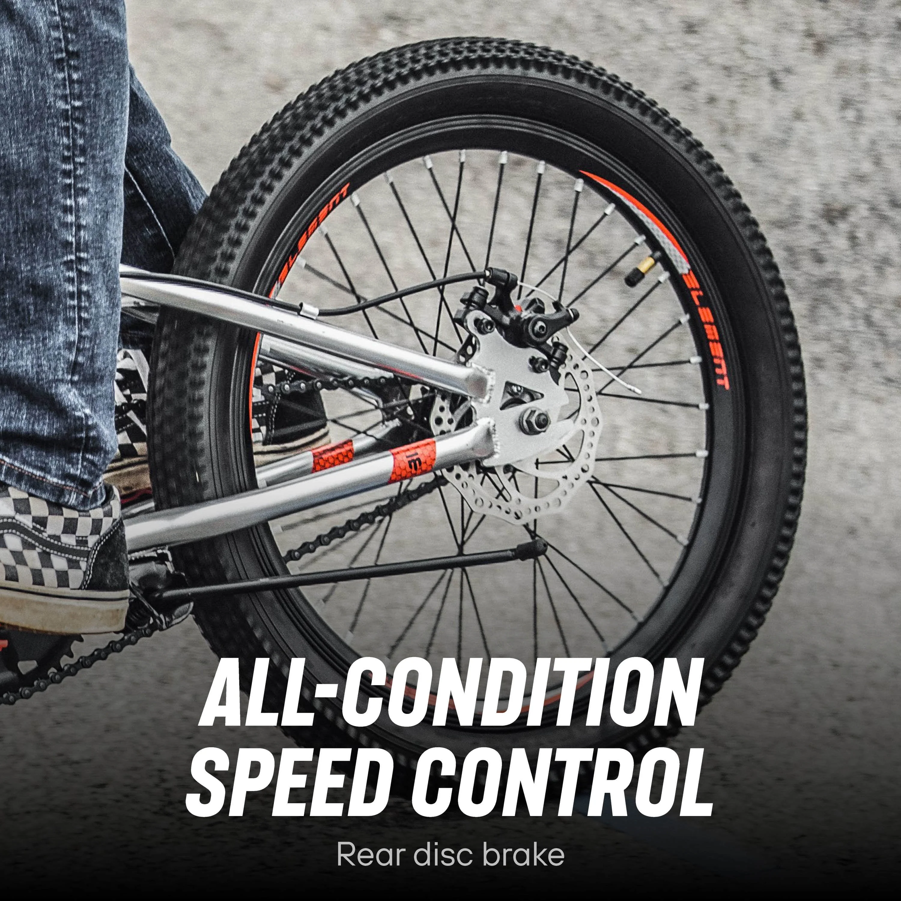 - The powerful rear disc brake gives you superior speed control in all weather conditions.