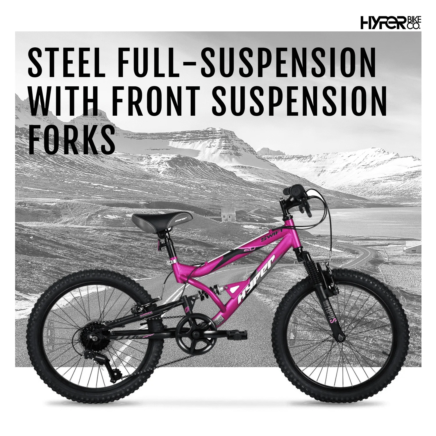 - Frame: Steel full-suspension with front suspension forks