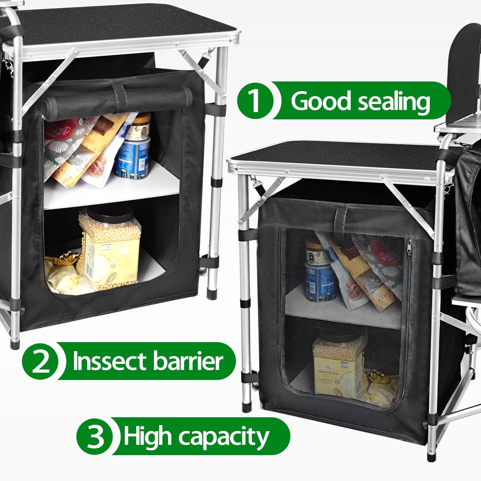 - Dayooh outdoor mobile kitchen comes with a two-level storage bag and two countertops and two side tables. Can hold your grill, cooking tools and condiments.