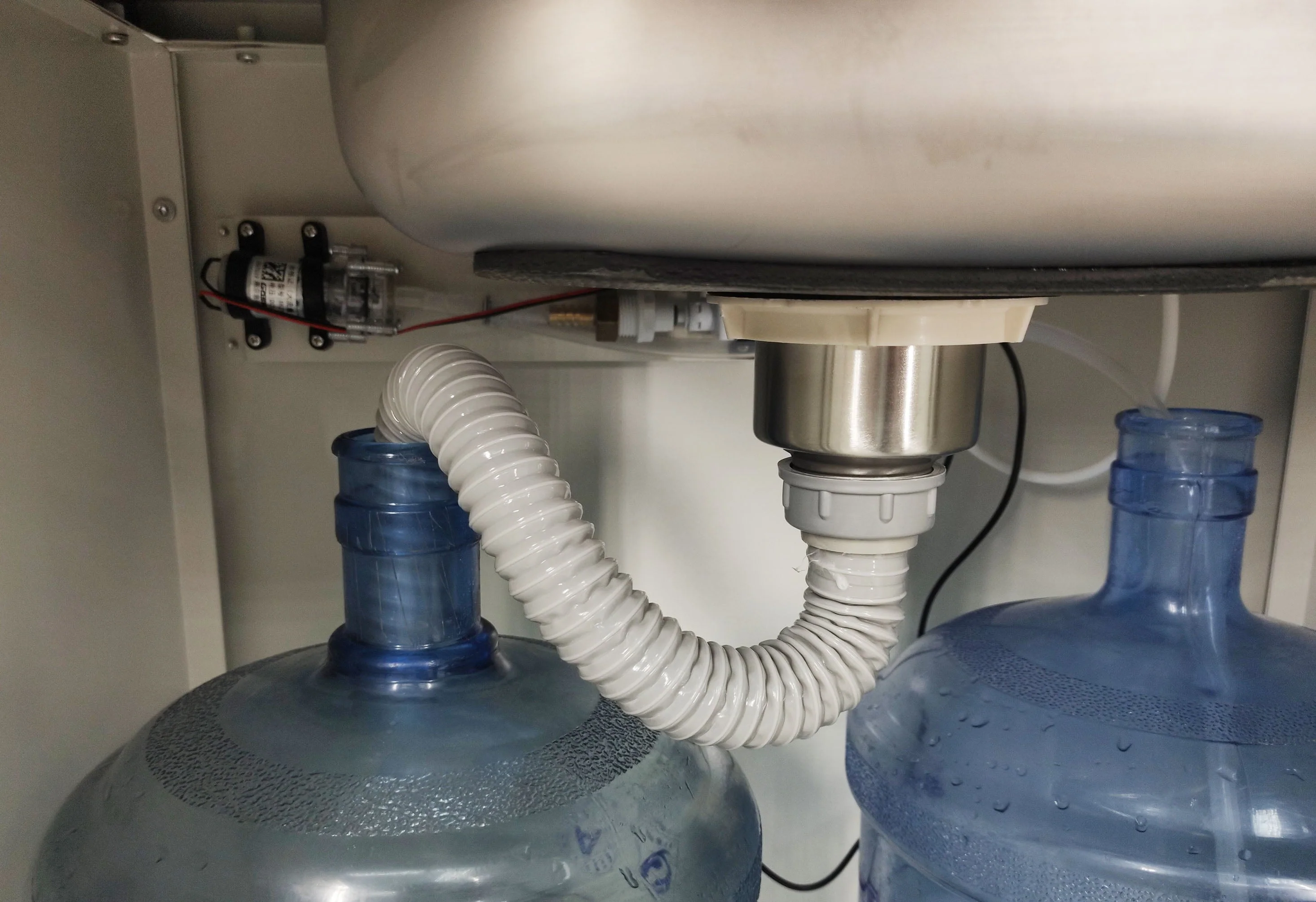 - Inside dimensions the stainless steel sink is 12.9" Width X 10.23" Heigth X 5" Deep. Water bottle is NOT included. Water jug can be purchased in most grocery stores for very low cost. Gross weight is 48 lbs. The cabinet is made of steel powder coated white. Equipped with 4 casters at the bottom for easy movement. Two of the four casters are locking casters. Come with Electric pump (110V) with adaptor working voltage is 12V.