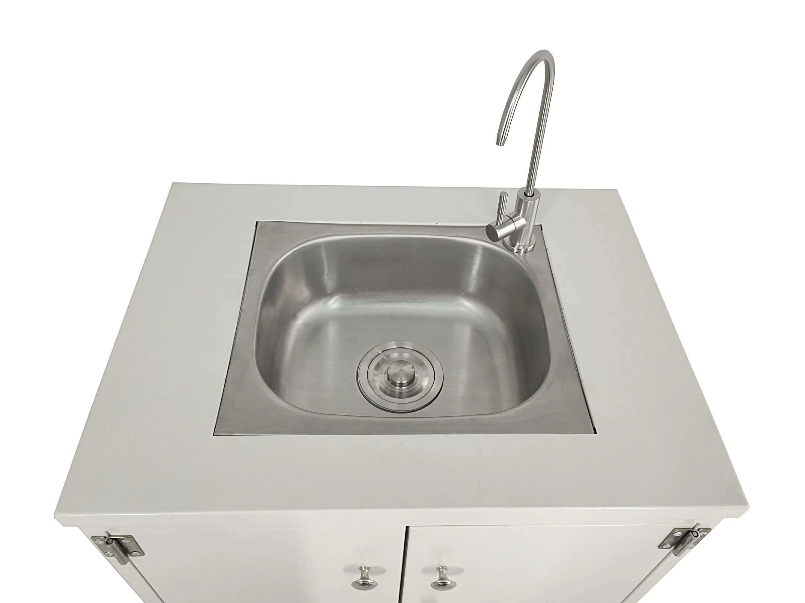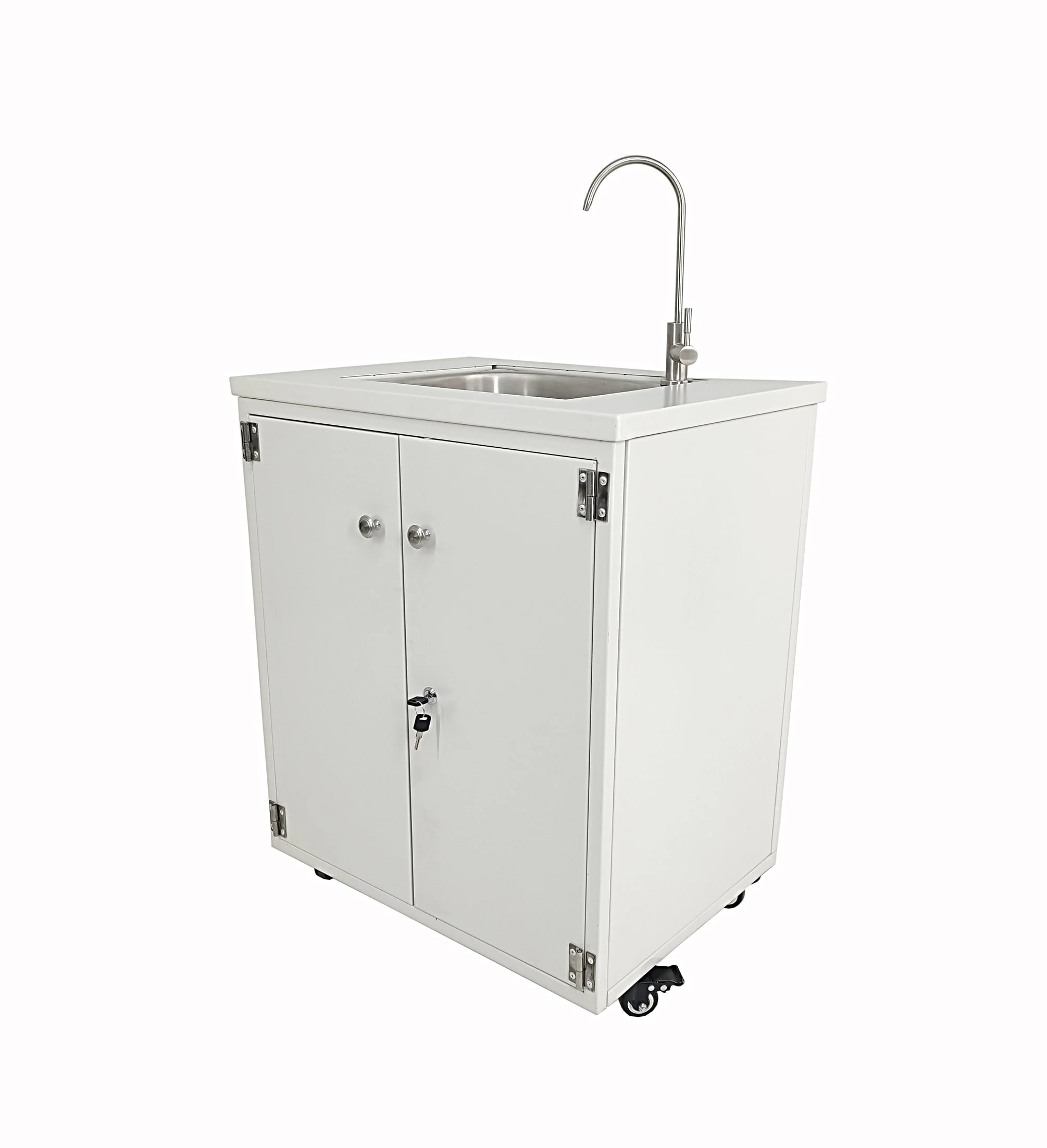 - This Portable Metal Sink Self Contained Hand Wash Station Mobile Sink Water Fountain w/Pump, is great for pre-schools, day cares, laboratories, clinics, hospitals, food truck services, festivals, county fairs, shopping malls, supermarkets, factories and other public places to have water available for quickly washing hands, or dispense drinking water or for lab work. Cabinet size is 24" Width X 29" Heigth X 18.3" Deep. Faucet is 10.5" tall. Waterline is 1/4". Single line.