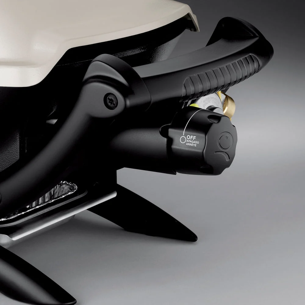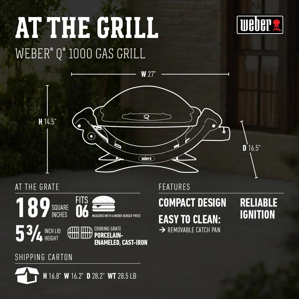 Weber Q 1000 Portable Propane Gas Grill - Titanium - 50060001. 50060001. Portable Gas Grills. Ready, set, grill on the go! The Weber Q 1000 portable gas BBQ grill offers 189 square inches of cooking space to create the grilled foods you love anytime, anywhere. Weber Q gas grills are perfect for tailgating, camping or small spaces like apartment balconies. With the push of a button, the grill ignites quickly and easily. The durable stainless steel burner produces 8,500 BTUs and the infinite control burner valve allows you to set it to the precise temperature you need with an easy-to-use knob. This Weber portable gas grill features a two-piece, porcelain-enameled cast iron cooking grate that heats evenly across its surface. It also features a cast aluminum lid and body with drip ducts and a sturdy glass-reinforced nylon frame and handles. A removable grease catch pan is included to make clean-up easy. This Weber Q 1000 operates on a portable 14. 1 or 16. 4 ounce propane cylinder (not included). An optional 20-lb tank adaptor hose is available as an accessory for those times you need to feed larger groups. Weber Q recipe booklet is included....