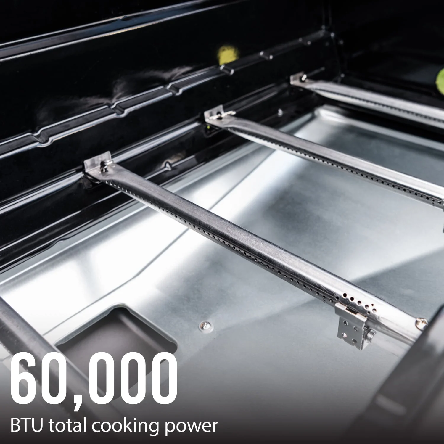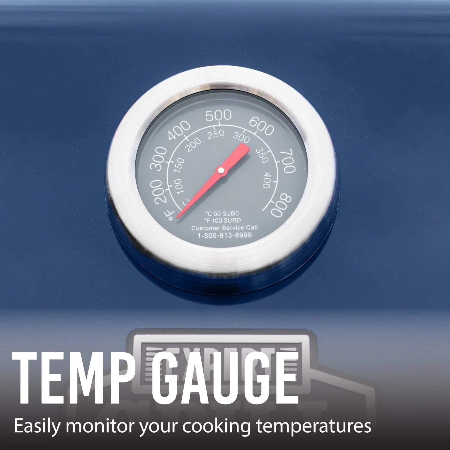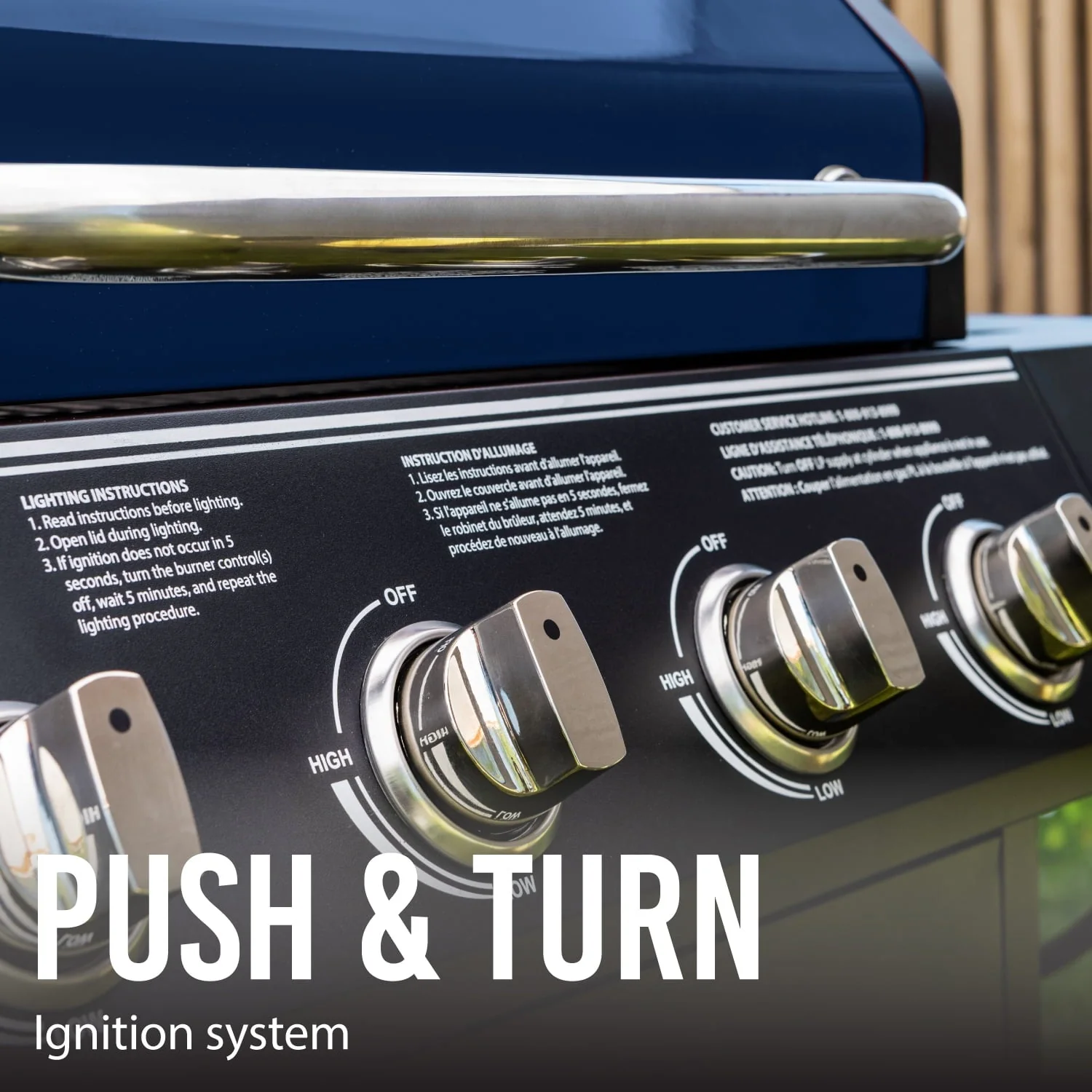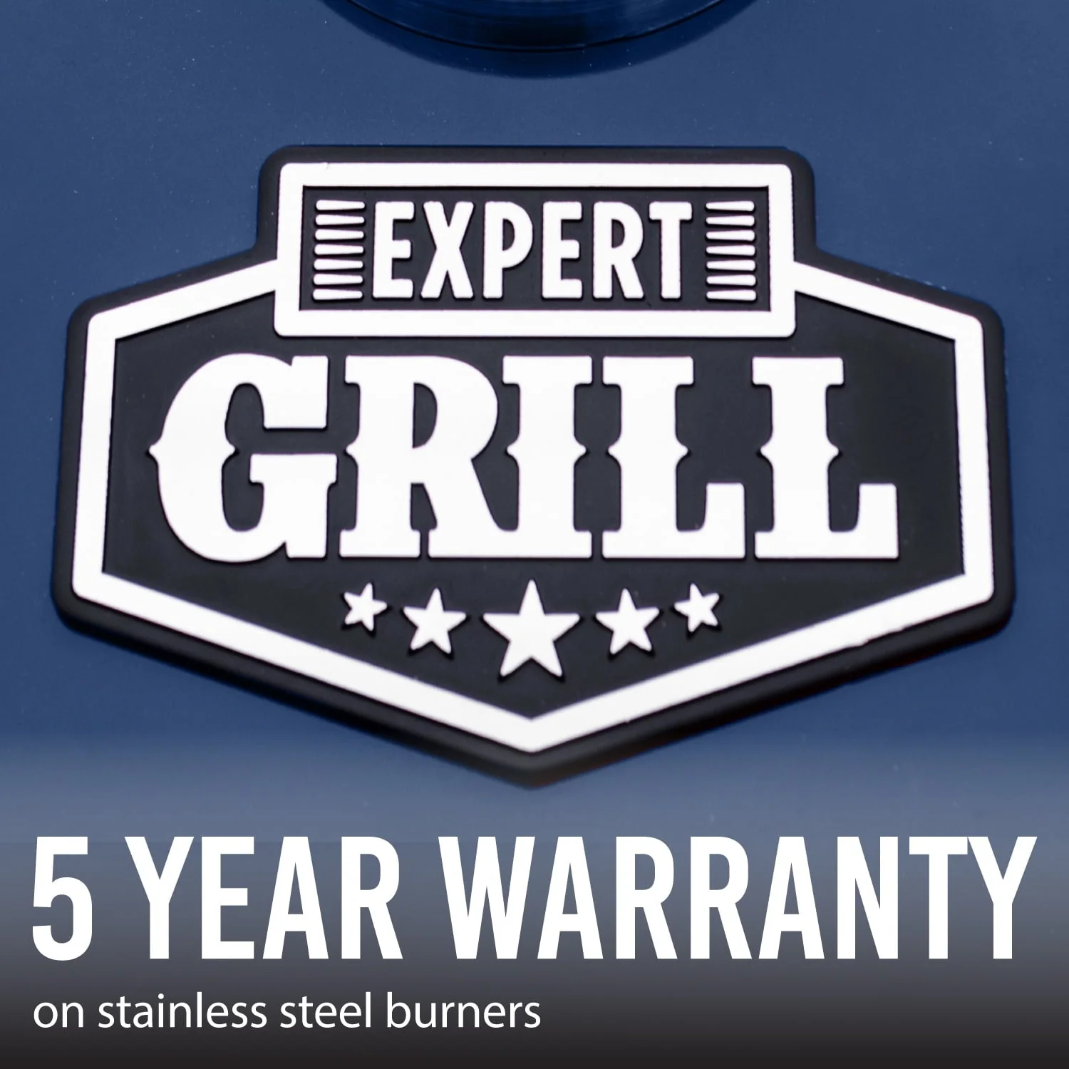 The Expert Grill 4-Burner Liquid Propane Gas Grill with Side Burner in Blue is the ideal grill for getting your backyard or patio cookout ready. Featuring 60,000 total BTUs of heating energy for quick, controlled heating, while 619 square inches of total cooking space provides enough room to fit up to 25 burger patties at once. When it’s time to clean up, 2 heavy duty wheels offer easy transport for storage, to help keep your grill in top shape for seasons to come.