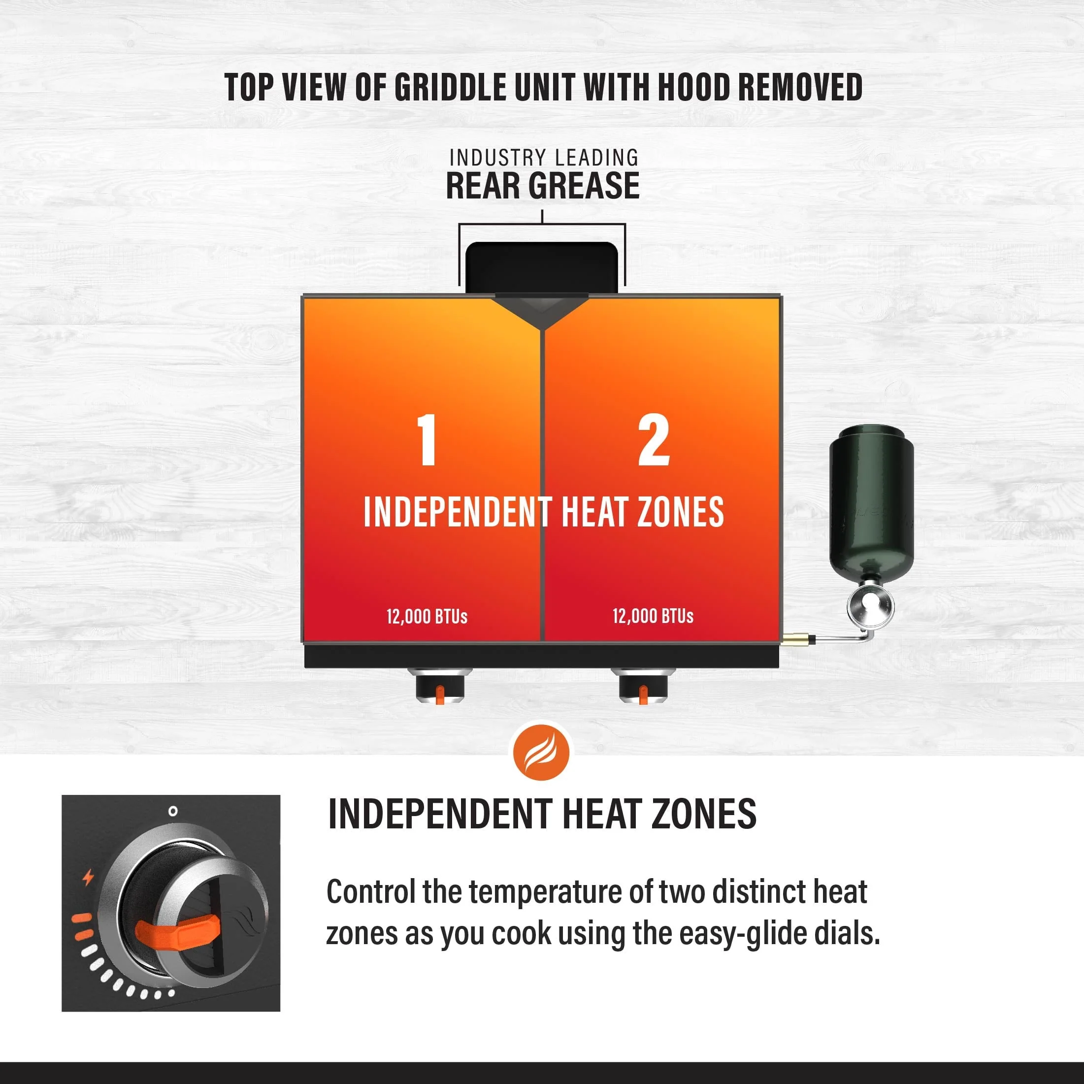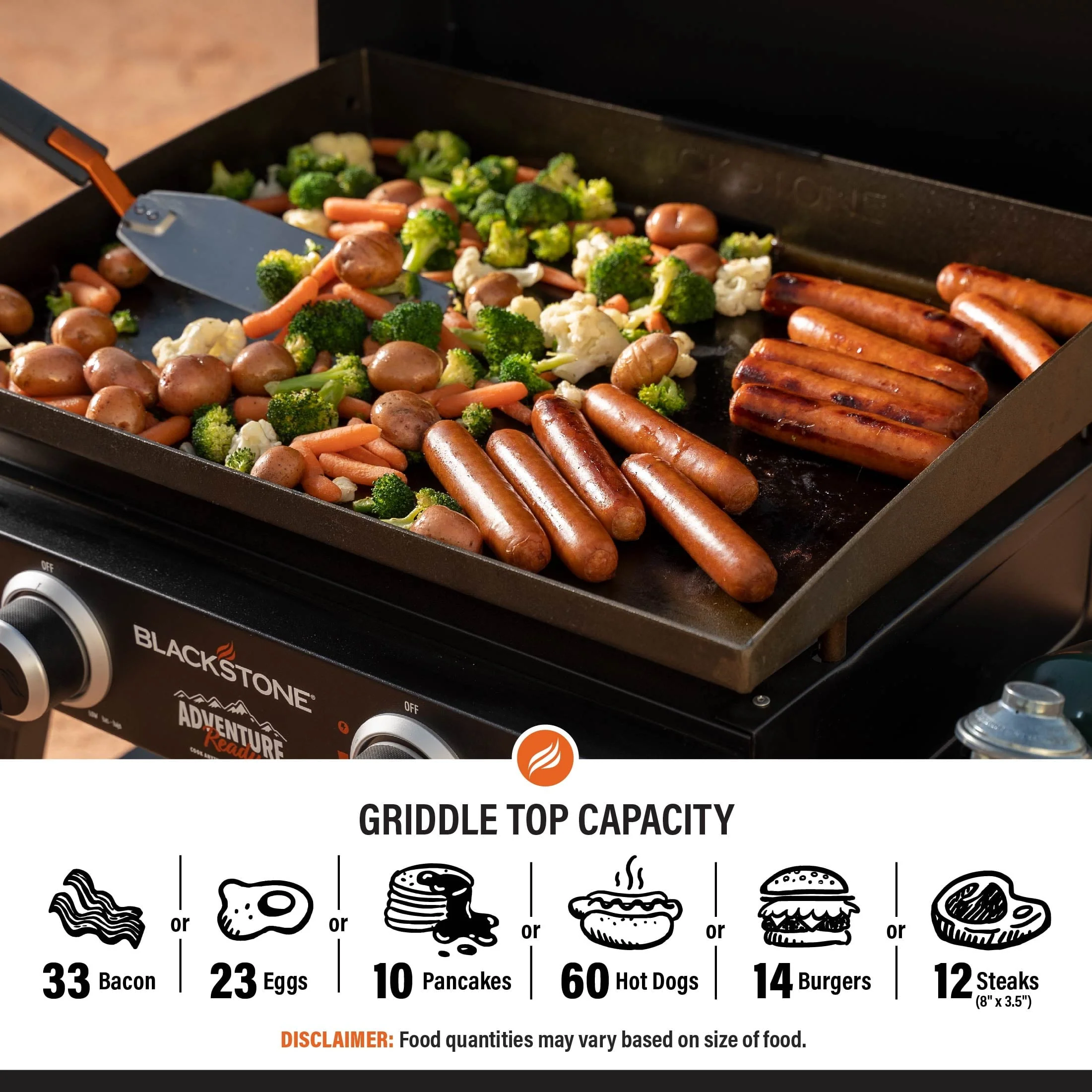 The Blackstone Adventure Ready 22" Propane Griddle with Hood, Legs, and Bulk Adapter Hose is the ideal package. Combine the already great tabletop griddle with a folding stand and this griddle will cook anywhere, any time of the year! A hood with a non-slip grip protects your griddle surface and traps 24,000 total BTUs of heat when grilling, no matter the location. With an included adapter hose, you can connect a 20-pound propane tank to your griddle, perfect for long hunts, fishing expeditions, or family camping trips. With 361 square inches of cooking space, this unit will cook burgers, hot dogs, steaks, eggs, pancakes, and much more. Dual H-syle burners evenly distribute heat across the griddle surface in two separate cooking zones, giving you ultimate control. This ultimate combination of Blackstone is sure to bring good food and memories to everyone!