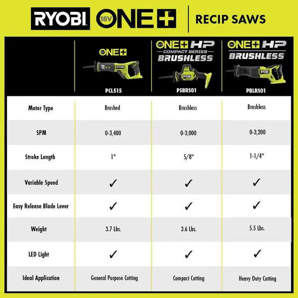 RYOBI introduces the ONE+ HP 18V Brushless Cordless Compact One-Handed Reciprocating Saw Kit with 1.5 Ah Battery and 18V Charger. This Recip Saw is our most compact reciprocating saw to date-just 13 in. in length to be exact. Being 31% more compact and 24% lighter weight than the brushed version, this saw is ideal for cutting in tight spaces and completing overhead applications without strain. The brushless motor delivers speeds of up to 3,000 SPM. That's one powerful tool wrapped up in a lightweight design. The pivoting shoe provides greater depth control to maximize blade efficiency and to minimize downtime. There is also an easy blade release lever to swap blades out quickly. Best of all, it is part of the RYOBI ONE+ System of over 280 Cordless Products that all work on the same battery platform. Backed by the RYOBI 3-Year Manufacturer's Warranty, the ONE+ HP 18V Compact Brushless One-Handed Recip Saw Kit includes a 6 in. wood cutting blade, an 18V ONE+ 1.5 Ah Battery, an 18V ONE+ Lithium-Ion Charger, and an operator's manual.