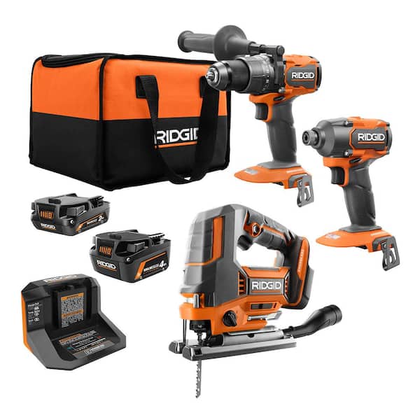 RIDGID introduces the 18V Brushless Cordless 3-Tool Combo Kit w/ Hammer Drill, Impact Driver, Jig Saw, Batteries, Charger & Bag. RIDGID brushless motor technology delivers maximum performance & longer runtime. The 18V Brushless 1/2 in. Hammer Drill delivers up to 800 in./lbs. of torque for maximum power. With a 2-speed gearbox and max RPM of 2,100, this 18V brushless hammer drill can handle the complete range of drilling application like drilling and driving into wood and metal as well as drilling into masonry. The 18V Brushless 3-Speed 1/4 in. Impact Driver delivers 20% faster driving compared to the previous model (R86039). The powerful motor in this 18V brushless 3-speed impact driver delivers up to 2,300 in./lbs. of torque to easily drive deck screws or fasten lag bolts. The 3-speed selector on this 18V brushless impact driver provides adjustable power and speed for the most demanding applications and precision work. This Jig Saw delivers up to 45% faster cutting in high demand application. This kit is backed by the Industry's Only Lifetime Service Agreement, simply register within 90 days of purchase for FREE Parts, FREE Service, For LIFE. This 18V Brushless Cordless 3-Tool Combo Kit includes 18V Brushless 1/2 in. Hammer Drill/Driver, 18V Brushless 3-Speed 1/4 in. Impact Driver, 2.0 Ah MAX Output Battery, 4.0 Ah MAX Output Battery, Charger, Tool Bag, an 18V Jig saw with blade and an operator's manual.