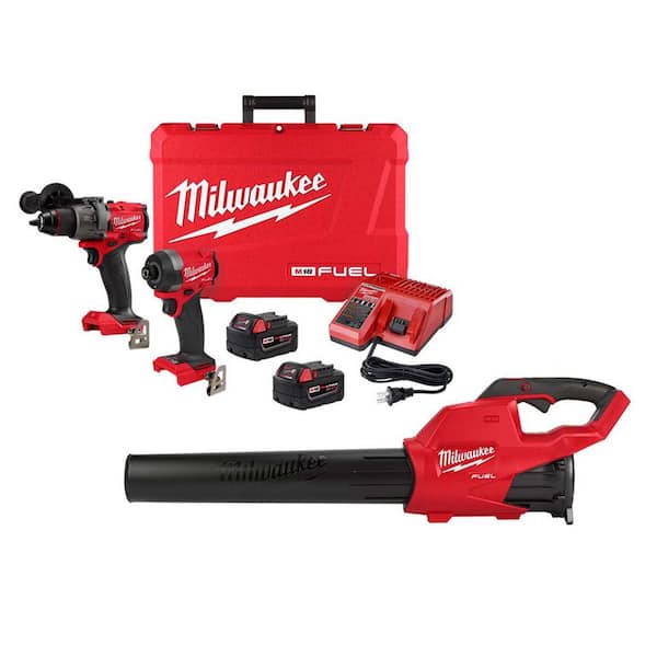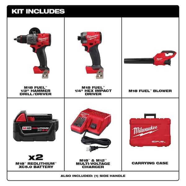 Includes: one M18 FUEL 1/2 in. hammer drill (2904-20), one M18 FUEL 1/4 in. hex impact driver (2953-20), two M18 REDLITHIUM XC5.0 battery, one M18 and M12 multi-voltage charger, 1 side handle, 1 BMC case, 1 M18 FUEL blower (2724-20)