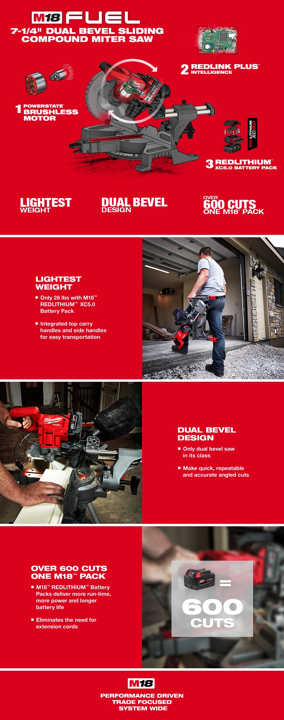 Milwaukee m18 fuel 7-1/4 dual-bevel sliding compound miter saw (2733) was designed for demand needs of professional carpenter and remodeler. Designed to increase productivity and efficiency on jobsite, miter saw combines best in accuracy, portability, and performance. Weighing in at only 28 lbs with battery, dual-bevel sliding compound miter saw is lightest weight saw in its class. Dual bevel functionality provides users with most efficient and productive way to make a variety of different cuts without flipping or turning workpiece. Combination of power state brushless motor and m18 redlithium xc5.0 battery delivers over 600 cuts per charge for all-day run-time on a single charge.Milwaukee folding miter saw stand (48-08-0551) is designed for increased portability and jobsite durability. With aluminum main beam construction,Milwaukee folding miter saw stand weighs in at only 31 lbs. Steel legs and support extensions are designed for maximum strength and rigidness to support even heaviest work pieces. An included carrying strap makes moving stand on and off site easy and allows you to transport or items at same time, increasing productivity.