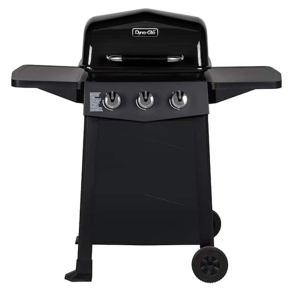 The Dyna-Glo 3-burner Open Cart Propane Gas Grill in Black features (3) 8,000 BTU stainless steel burners with a total cooking area of 449 sq. in. The 310 sq. in. primary cooking area houses easy to clean porcelain cooking grates and porcelain coated heat tents that help vaporize foods natural juices to add flavor to your food while spreading the heat to create an even cooking surface. The porcelain enamel warming rack provides an additional 139 sq. in. to keep food warm and 2 large side tables furnish extra food preparation space. The high gloss black porcelain finish of the grill lid ensures easy cleanup and 2 wheels make it simple to reposition your grill once its cooled off.