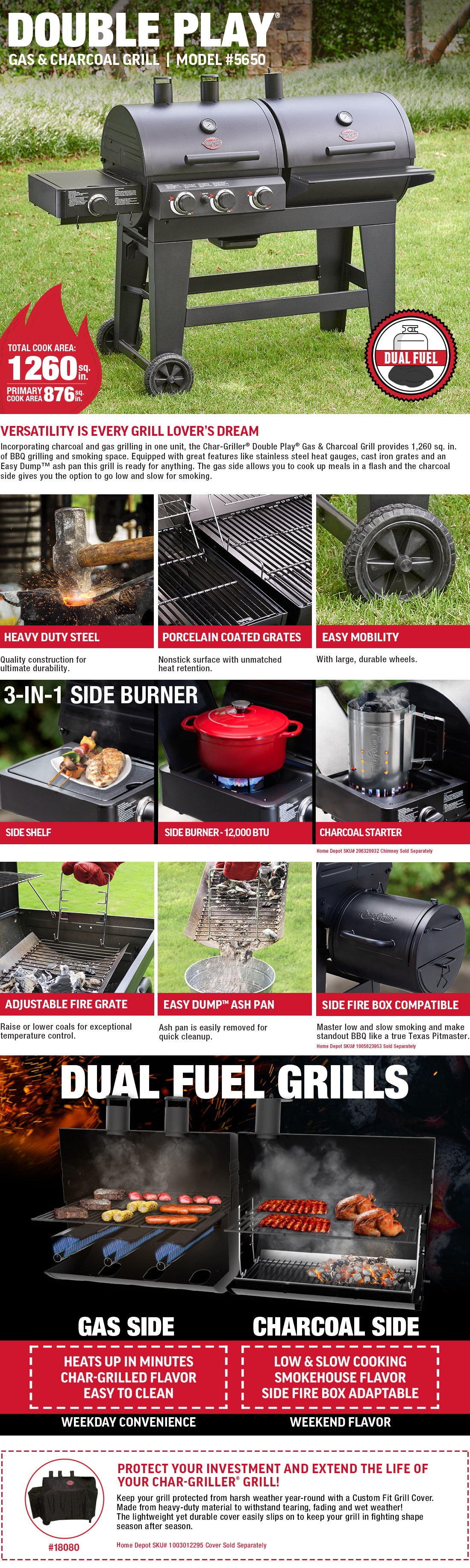 Protect your investment and extend the life of your Char-Griller Double Play with a custom-fit grill cover, sold separately. Model 18080, Home Depot SKU# 1003012295