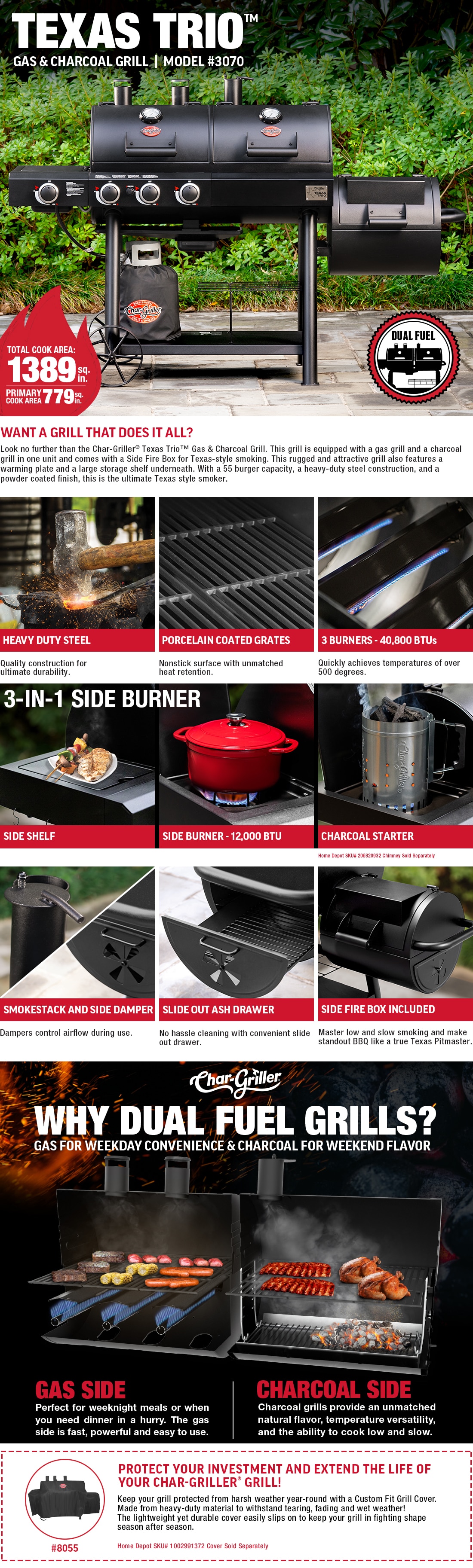 Protect your investment and extend the life of your Char-Griller Texas Trio with a custom-fit grill cover, sold separately. Model 8055, Home Depot SKU# 1002991372