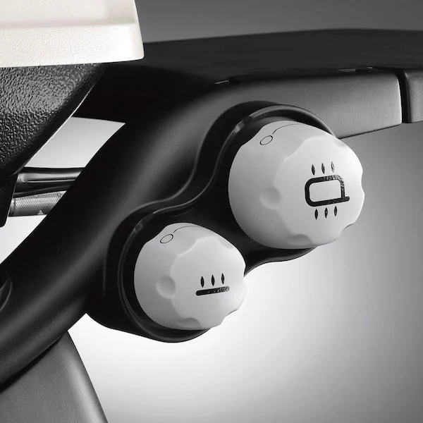 Porcelain enameled cast-iron cooking grates; electronic ignition; built-in thermometer reads Fahrenheit or Celsius; grill-out handle light