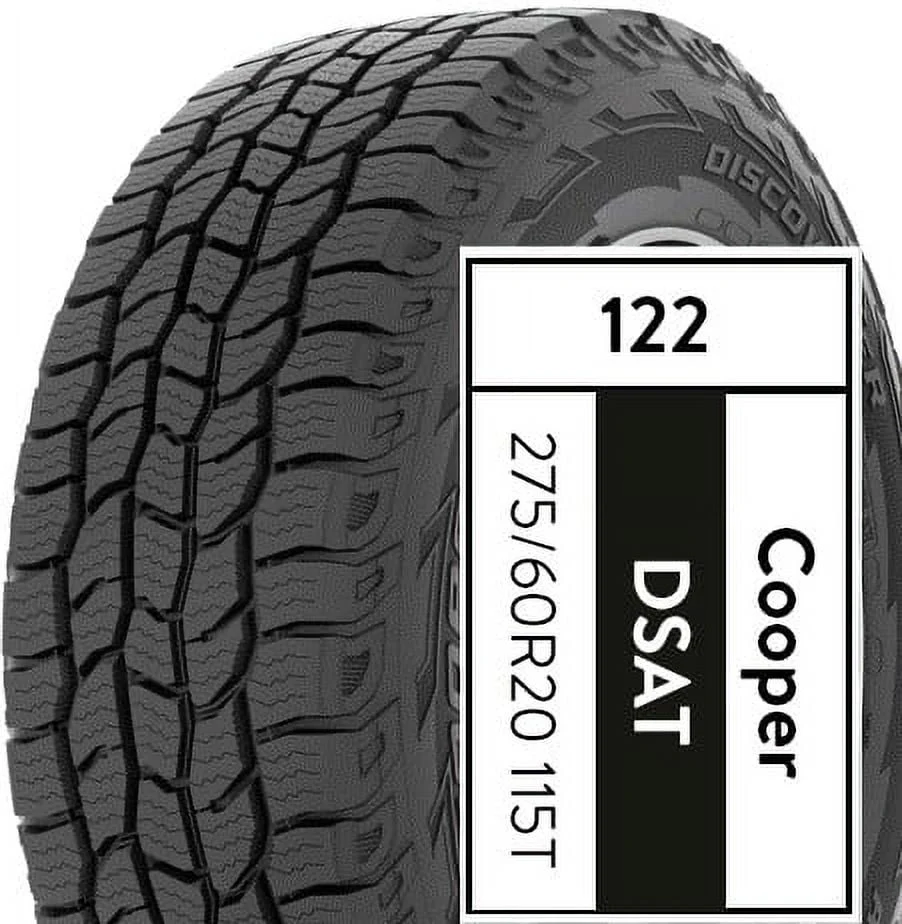 The Cooper Discoverer All-Terrain 275/60R20 115T All-Terrain Tire has a 60K (SUV) 55K (LT) Treadwear Warranty. The tread design and internal construction helps the tire fight uneven wear to attain treadwear warranty. Sound Barrier Walls in the shoulders of the tire help keep tread pattern noise to a minimum. Repeating pitch sequence helps provide a smooth ride. Silica tread compound helps the tire grip the road in wet weather. Circumferential grooves and increased siping in the tread design help push water out of the tire's way for better wet handling. Snow groove technology helps bite into snow providing confidence in winter driving. Similar to its predecessor, the tread pattern kicks out stones with the stone ejectors (in the intermediate grooves). Stone barriers keep stones from drilling into tires. Tread compound delivers off-road performance on unpaved roads.
