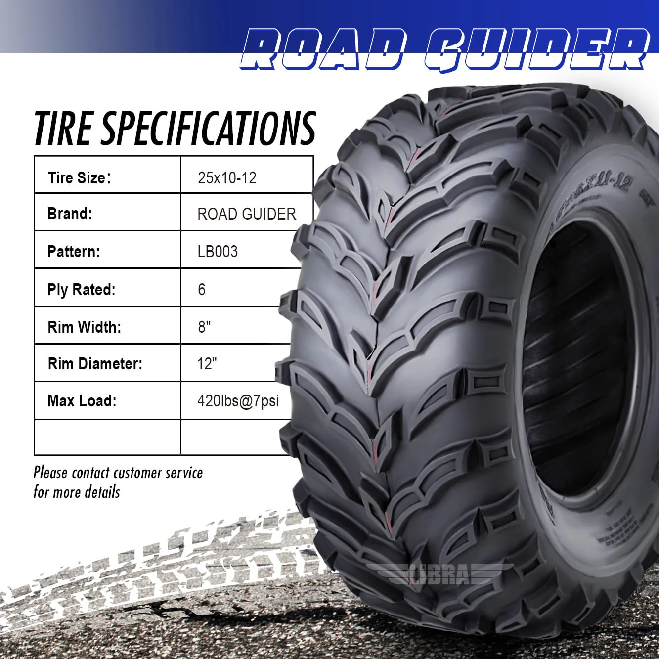 Set 2 of Roadguider 25x10-12 6PR ATV/UTV tire with dynamic tread pattern provides exceptional acceleration and traction. Versatile tread patterns perform well in soft to hard-pack conditions. Lug design provides better braking control. The heavy 6-ply rated nylon construction resists punctures and abrasions. Tires only, wheels are not included.