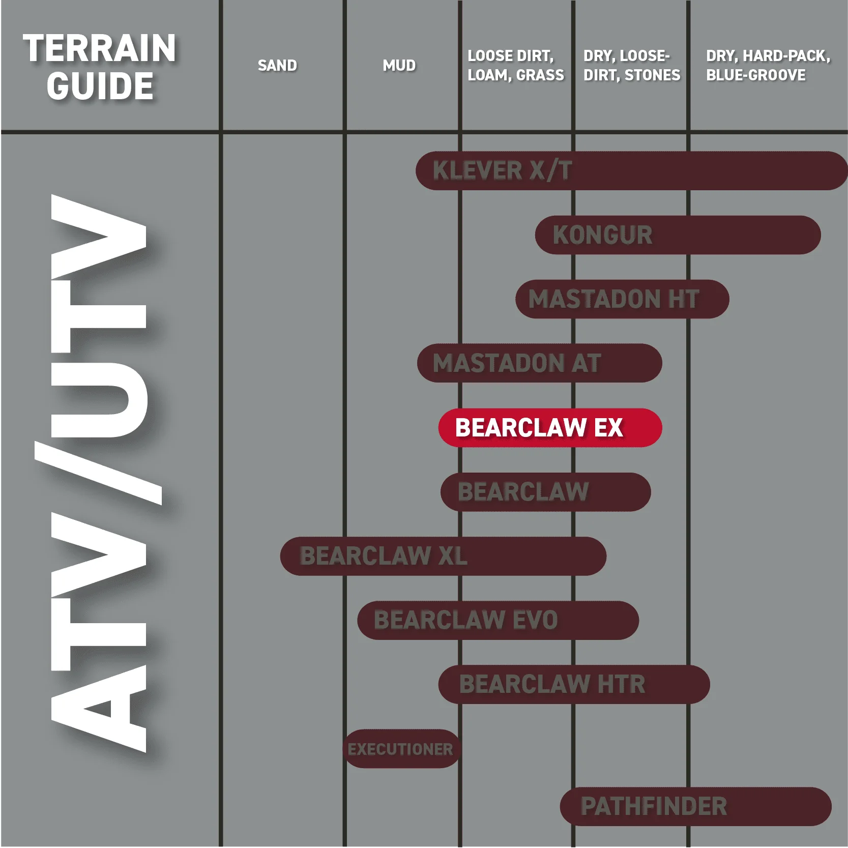 The Bear Claw EX shares many of the same characteristics as the original Bear Claw but does so with a more aggressive approach. The EX features an aggressive tread design that will claw its way through any terrain. Whether it be snow, mud, or rock the Bear Claw EX can handle it. It also has an innovative sidewall casing that is designed to help protect the rim from scraping against rocks and other debris. So, when you find yourself riding through a rock garden or tree roots, you don’t have to worry about tearing your rims up or puncturing your sidewall. The Bear Claw EX is designed for extended use with its long-wear rubber compound. The center tread lugs have an innovative ramp edge that increases the ease of rolling. When you pack all these features into a 6-ply rated casing, you get one tough tire! Once you ride a Kenda Bear Claw EX, you won’t want to ride any other tire.