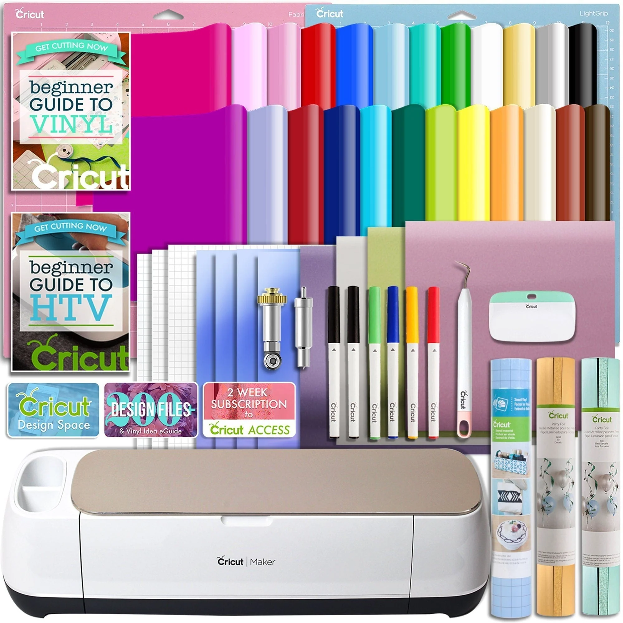 Description: Includes: �?Cricut Champagne Maker �?Built-in Wireless Bluetooth �?FabricGrip Mat 12"x12" Pink �?LightGrip Mat 12"x12" Blue �?Cricut Rotary Blade + Drive Housing �?Premium Fine Point Blade + Housing �?Printed Cricut HTV Guide & Cricut Vinyl Guide �?XL Scraper �?Weeder �?5 Pack Pen Set (colors may vary from image) �?24 Sheets Cricut Premium Removable Vinyl, Assorted Colors �?3 Sheets Cricut Transfer Tape �?4 Sheets Cricut Foil Iron on HTV �?2 Rolls Party Foil �?1 Roll of Holographic Vinyl (Equal to 4 - 12"x12" Sheets) �?1 Roll Cricut Stencil Material �?USB & Power Cord �?Exclusive Bonus 200+ Free Designs �?50 Free Ready To-Make Projects Ideas �?Fine Point Pen �?Applies up to 4 kg of Force