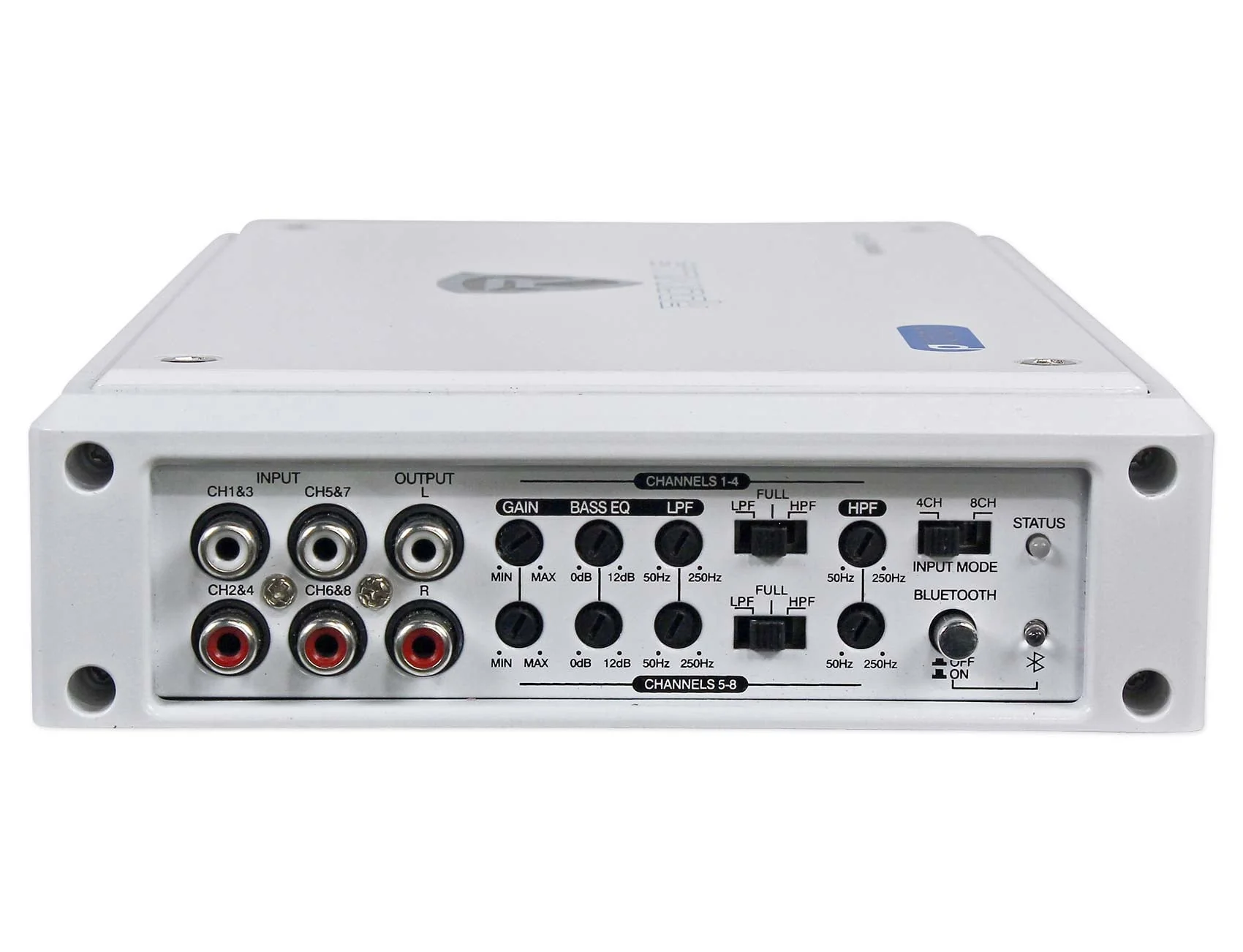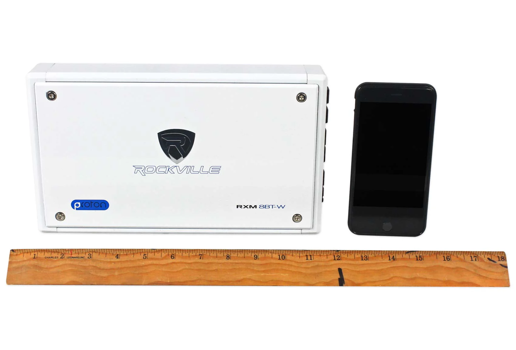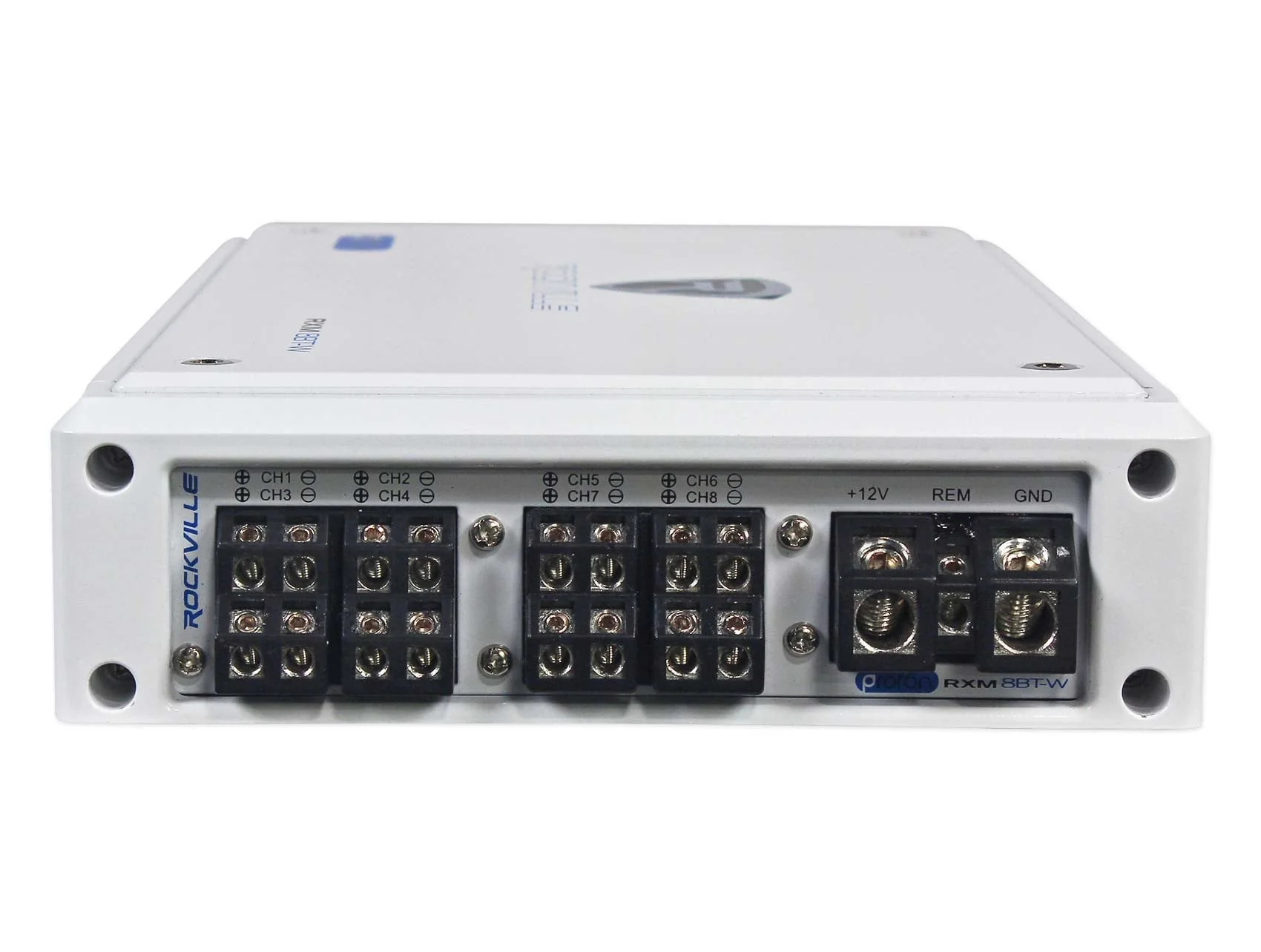 <p><br><center><object type="application/x-shockwave-flash" style="width: 560px; height: 315px;" data="//www.youtube.com/v/-rGRtx4YB9o?color2=FBE9EC&amp;version=3" title="Adobe Flash Player"><param name="movie" value="//www.youtube.com/v/-rGRtx4YB9o?color2=FBE9EC&amp;version=3"><param name="allowFullScreen" value="true"><param name="allowscriptaccess" value="always"></object></center>Rockville RXM8BT Marine 8 Channel Digital Class DPower Amplifier with Bluetooth Wireless Integration.<br><br>The Rockville Proton Series Marine amplifiers are engineered with advancedtechnologies. These amps are a full solution to your marine audio needs. Goneare the old days where people bring CD's on their boat or listen to FM radiothat cuts in and out. Gone are the days where you need a receiver and multipleamplifiers to power your speakers. Gone are the days where you have wiresrunning throughout your boat. Welcome to the marine system of the future! TheRockville RXM8BT will change your life! This is an 8 channel amplifier withBluetooth built in! The Bluetooth will allow you to stream music wirelessly froma Bluetooth enabled MP3 player or smartphone. Of course the RXM8BT features&quot;zero noise&quot; RCA differential preamp inputs and preamp outputs for systemexpansion. This means you can connect any audio device through the RCA input.But it's the high quality Bluetooth that will blow you away. It offers advancedstreaming from almost any music device. Now you can easily play your iTunes,Pandora, Rhapsody and Spotify directly from your smart phone directly to all 8channels of your amplifier.<br><br>Features:<br><br>Rockville RXM8BTW 8 Channel 1500 Watt Marine Amplifier W/Bluetooth White<br>Compact design and extremely high power (Do not be fooled by the compact size;this amp is a beast!!!)<br>1500 Watts Peak System Power<br>750 Watts RMS System Power<br>RMS Power Output at 4 Ohms: 65 Watts x 8 Channels CEA Rated<br>RMS Power Output at 2 Ohms: 95 Watts x 8 Channels<br>RMS Bridged Power Output at 4 Ohms: 190 Watts x 4 Channels<br>Peak Bridged Power Output at 4 Ohms: 380 Watts x 4 Channels.<br>Configurable to 8-6-4 channels or 6.1 or 4.2 System<br>Bluetooth Wireless with Auto Pairing<br>UV and Salt Water Resistant Paint, Silk Screen and Heat Sink Enclosure<br>Marine-Grade Conformal Coated Boards Resist Corrosion from Salt Spray andMoisture<br>LED Power and Protect Indicators<br>TI Digital Class D Audio Topology<br>High Speed MosFET Power Supply<br>Studio Grade Bipolar Output Stage Transistors<br>Micro Size Architecture with SMD Component Circuitry<br>Compact Design and High Power<br>Non-Corrosive High Gloss White Aluminum Casing<br>Selectable Bass<br>Non-Corrosive Brushed Aluminum Casing<br>Conforms to the American Boat and Yacht Council (ABYC) Marine ElectronicStandards<br>Bass Equalization: Fully Adjustable 0 - 12dB at 45Hz<br>4-Way System Protection Circuitry (DC, Short, Thermal, Overload)<br>Heavy-Duty Aluminum Alloy Heat-sink<br>Stainless Steel RCA Level Inputs<br>Stainless Steel Bolt Down Molded Terminals<br>4CH / 8CH Input Selector Mode<br>Independent Crossover Controls between CH1-4 and CH5-8<br>Full Range / Low Pass / High Pass Configurable<br>Variable High-Pass Filter: 50Hz - 250Hz at 12dB/per Octave<br>Variable Low-Pass Filter: 50Hz - 250Hz at 12dB/per Octave<br>Frequency Response: 10Hz - 40KHz<br>S/N Ratio: &gt;100dB<br>Minimum THD: &lt;0.05%<