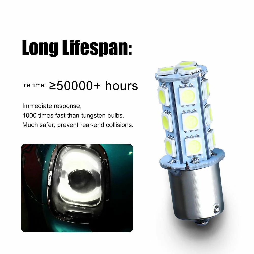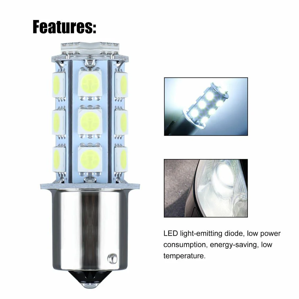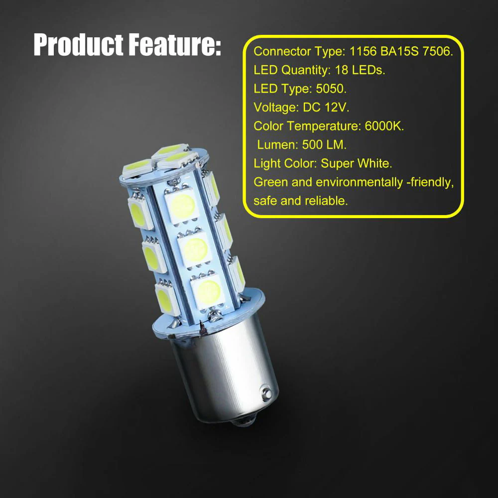 �?strong>Connector Type: 1156 BA15S 7506. LED Quantity: 18 LEDs. LED Type: 5050. Voltage: DC 12V. Color Temperature: 6000K. Lumen: 500 LM. Super bright LED bulbs. Light Color: Super White. Green and environmentally -friendly, safe and reliable.