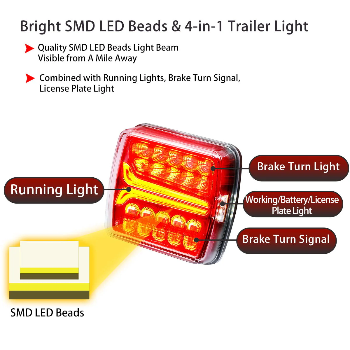 The wireless trailer light adopt quality SMD led beads, features high brightness and low-power consumption, lights can be seen up to a mile away, using life-time up to 60,000hrs. The trailer light combined with running lights, brake light, turn signal, and license plate light.