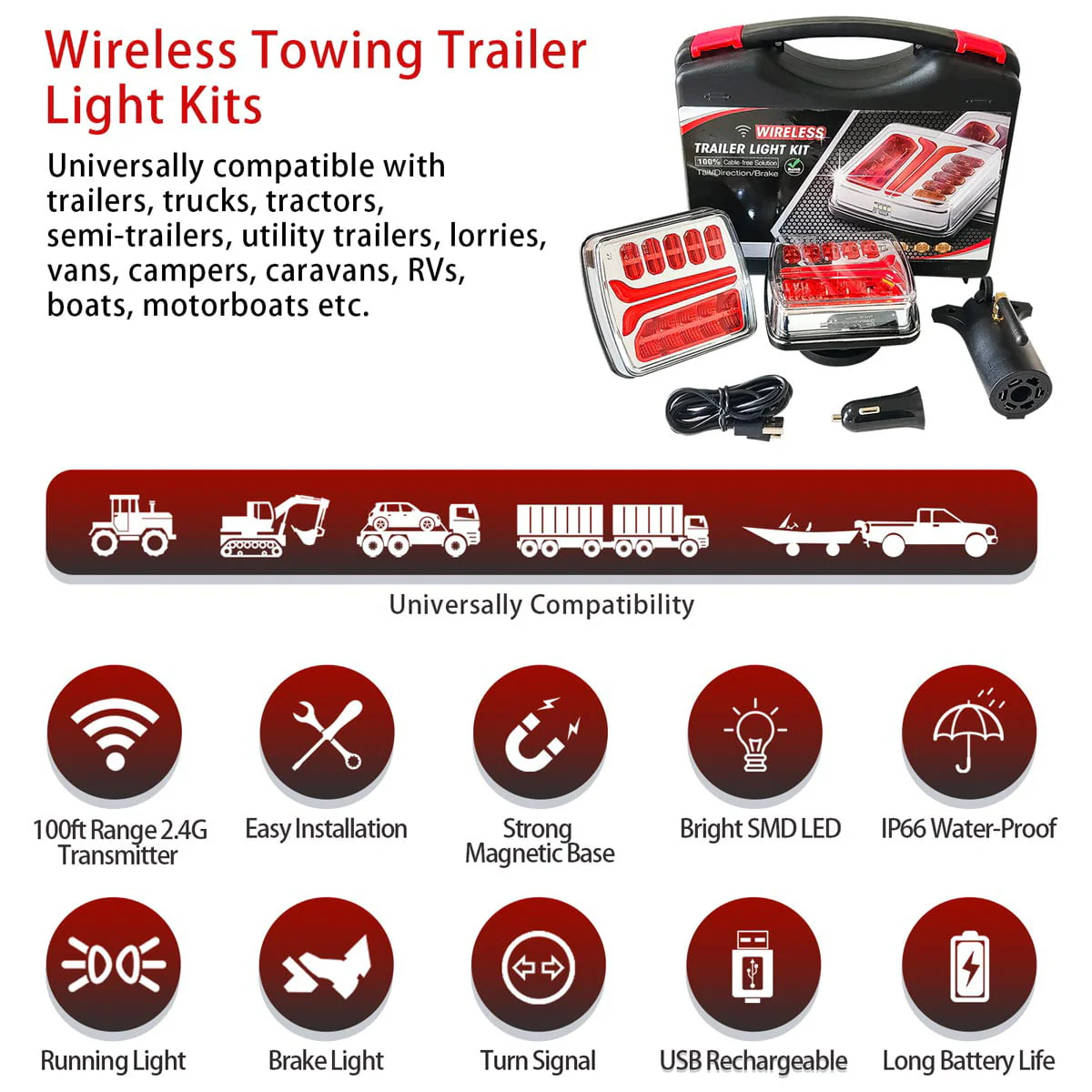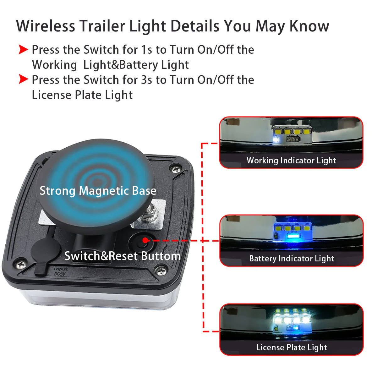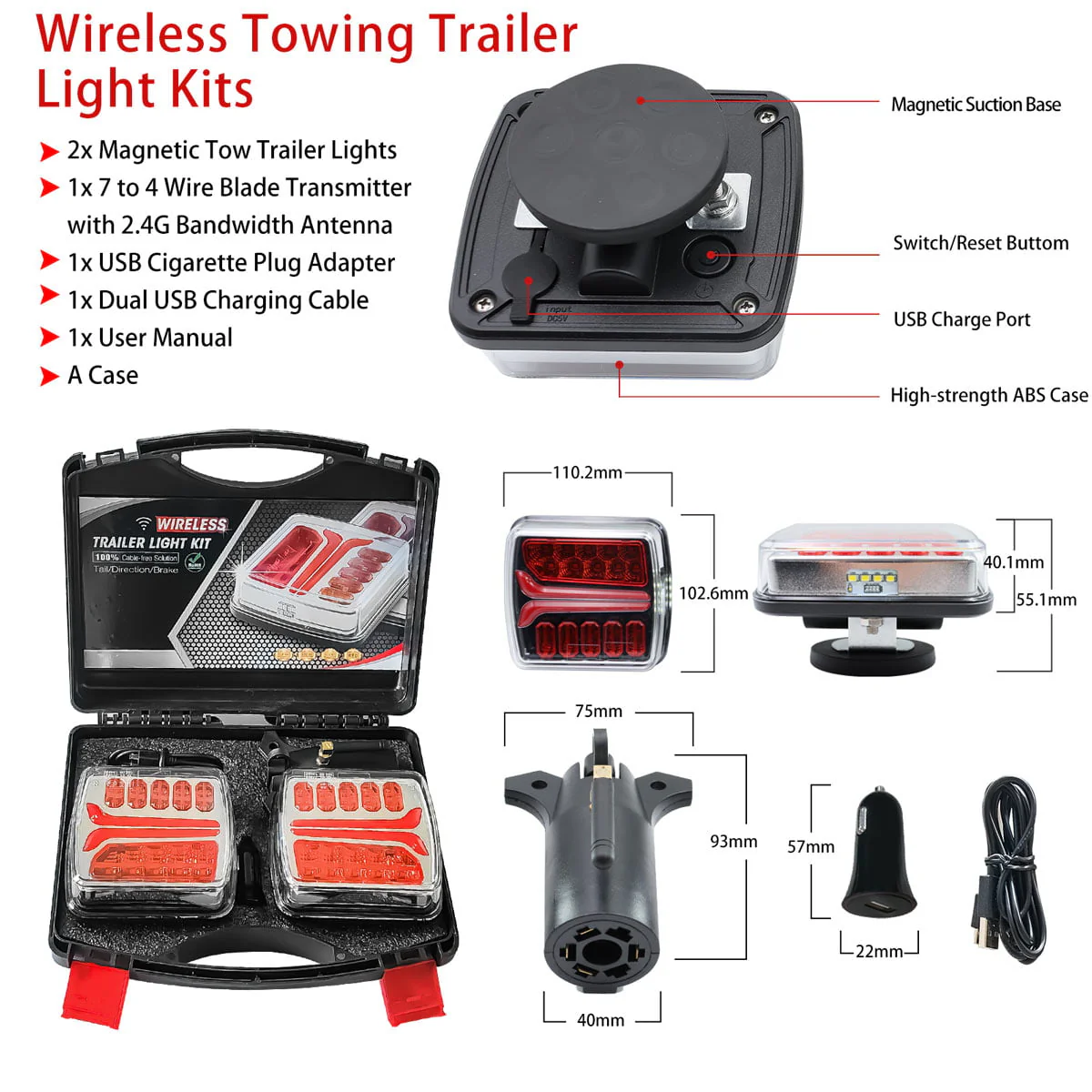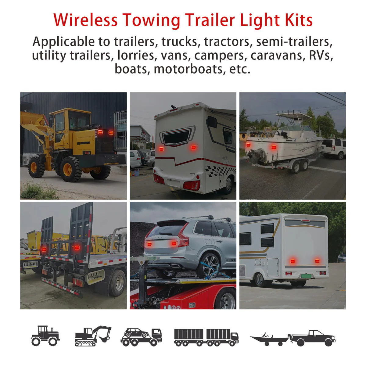 The wireless trailer light kit, it allows the taillight to easily attach to the rear of the trailer firmly with the strong magnetic base, greatly reduces wire installation process, easy to install detachable, perfectly solving the problem of shortening the life of the taillight due to damaged wires and poor contact.