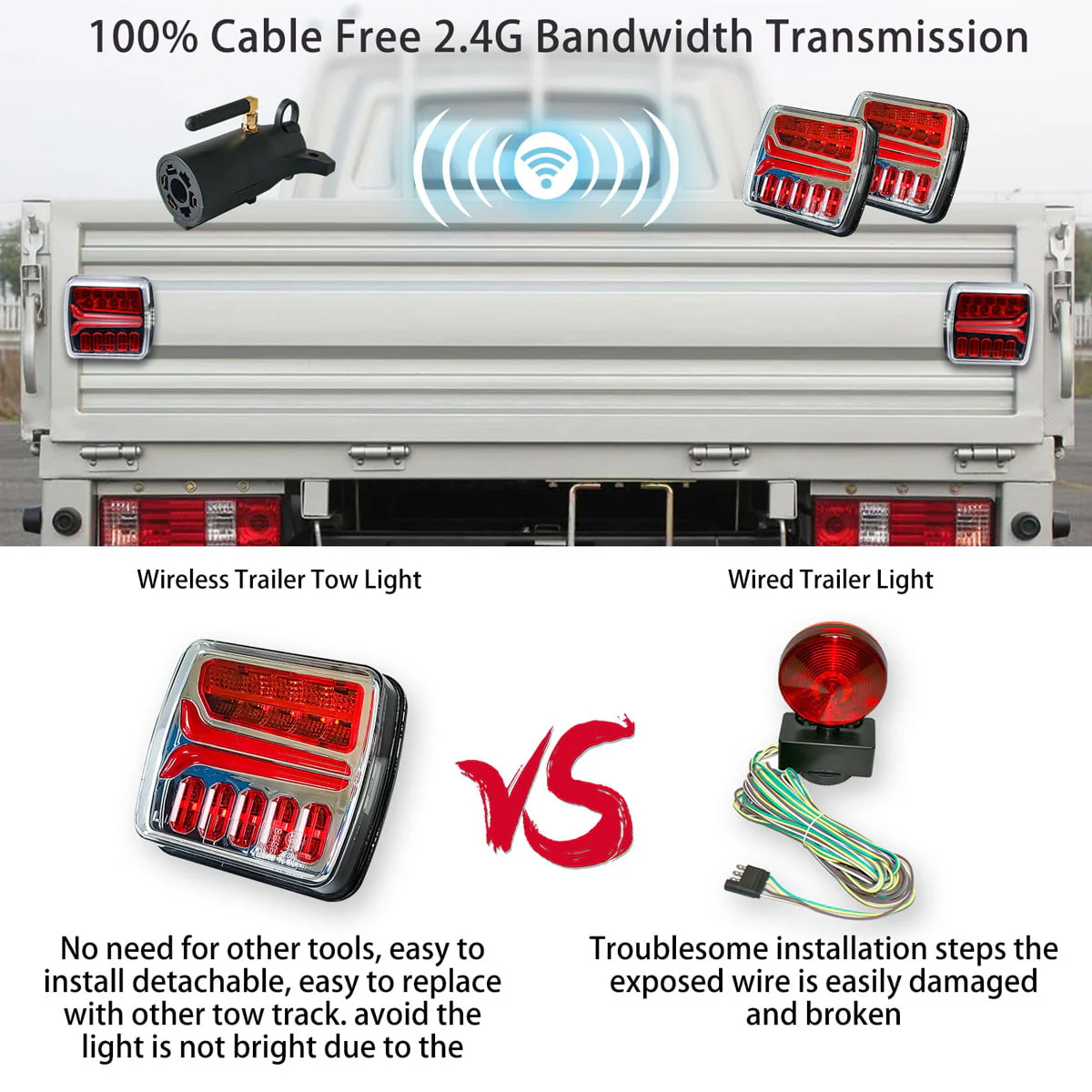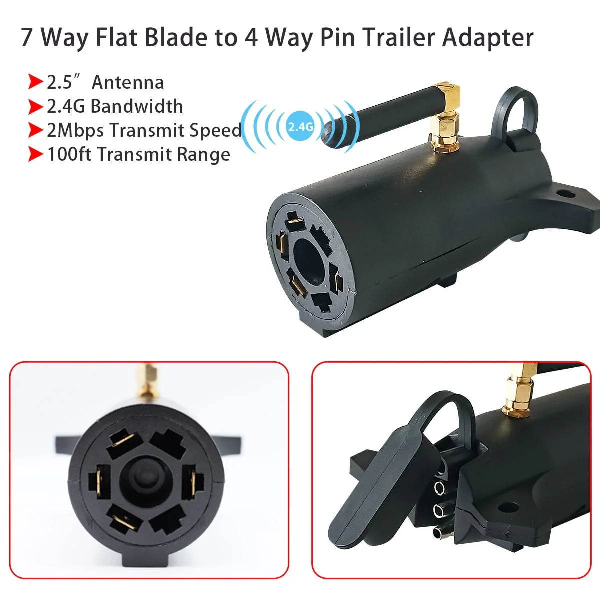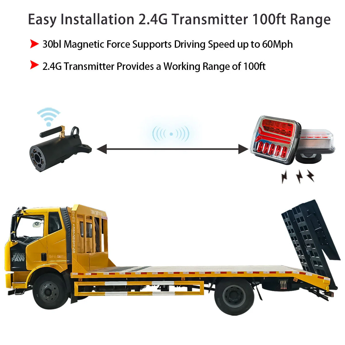 The wireless led trailer towing lights with a 7 way flat blade to 4 way pin transmitter, used the 2.4G bandwidth antenna to transmit at a speed of 2Mbps that provides a effective connection range of approximately 100 feet.