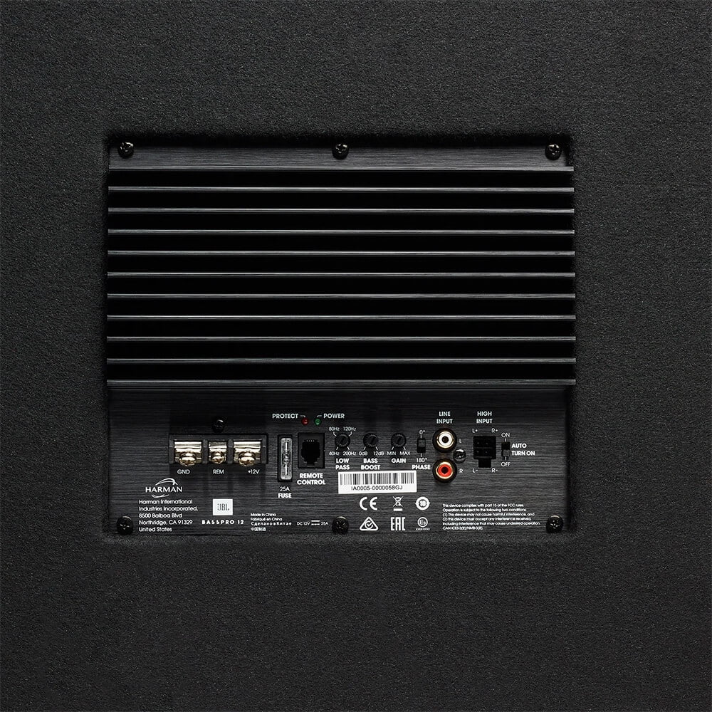 JBL BassPro 12 delivers 150 Watts of powered noise-free deep bass thanks to JBL's patented Slipstream port technology. The Slipstream port is mathematically engineered to keep airflow with the port turbulence-free, which avoiding the common shortcoming of traditional ported boxes. Coupled with the built-in 150Wrms amplifier the BassPro 12 really delivers. Also the Bass Volume Remote control is included for easy adjustment, no more stopping to pop the trunk.