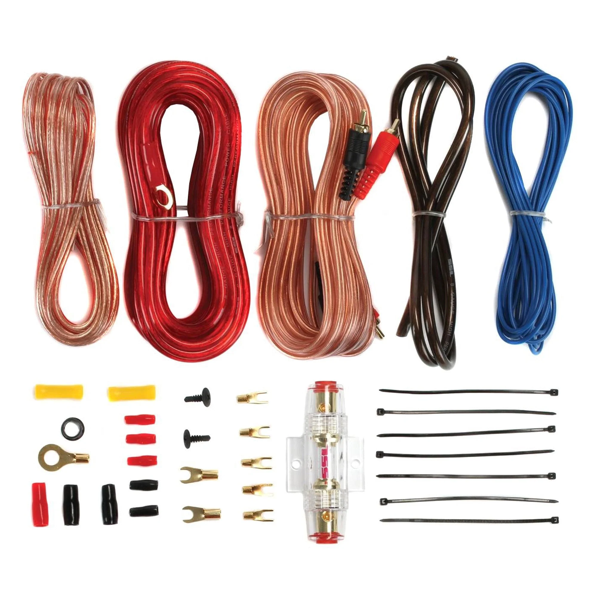 This MTX terminator series subwoofer system includes 2 subs, a sub enclosure, and a car amp. With 1200 max power, it gives off super deep bass sounds while keeping maximum sound quality. All you need to complete this subwoofer package is an amp wiring kit. The 8-gauge amplifier installation kit has everything you need to install the amplifier in your car. The amp kit features a 20 foot 8 gauge red power cable, premium quality fuse holder, 3 feet of 8 gauge black ground cable, 16 feet of 18-gauge blue turn-on wire, a 20-foot high-performance RCA interconnect, 30 feet of speaker wire, 20, 4-inch wire ties, 3, rubber grommets, a Number 10 ring terminal, a 5/16 inch ring terminal, and a 1/4 inch ring terminal.