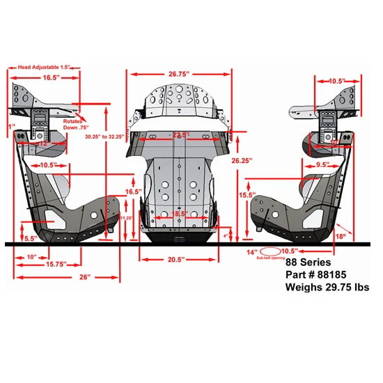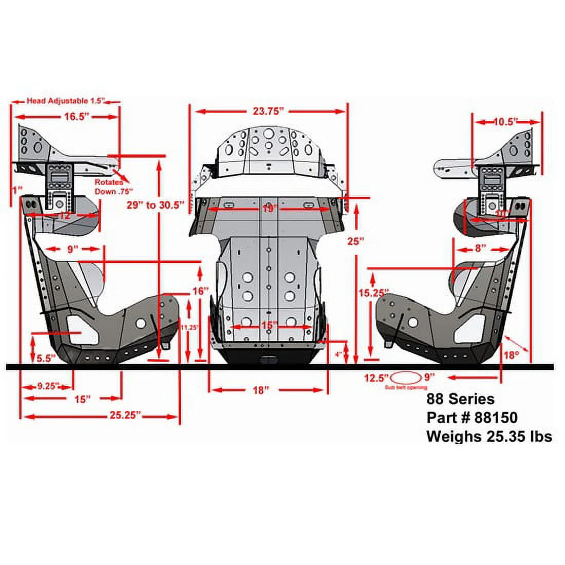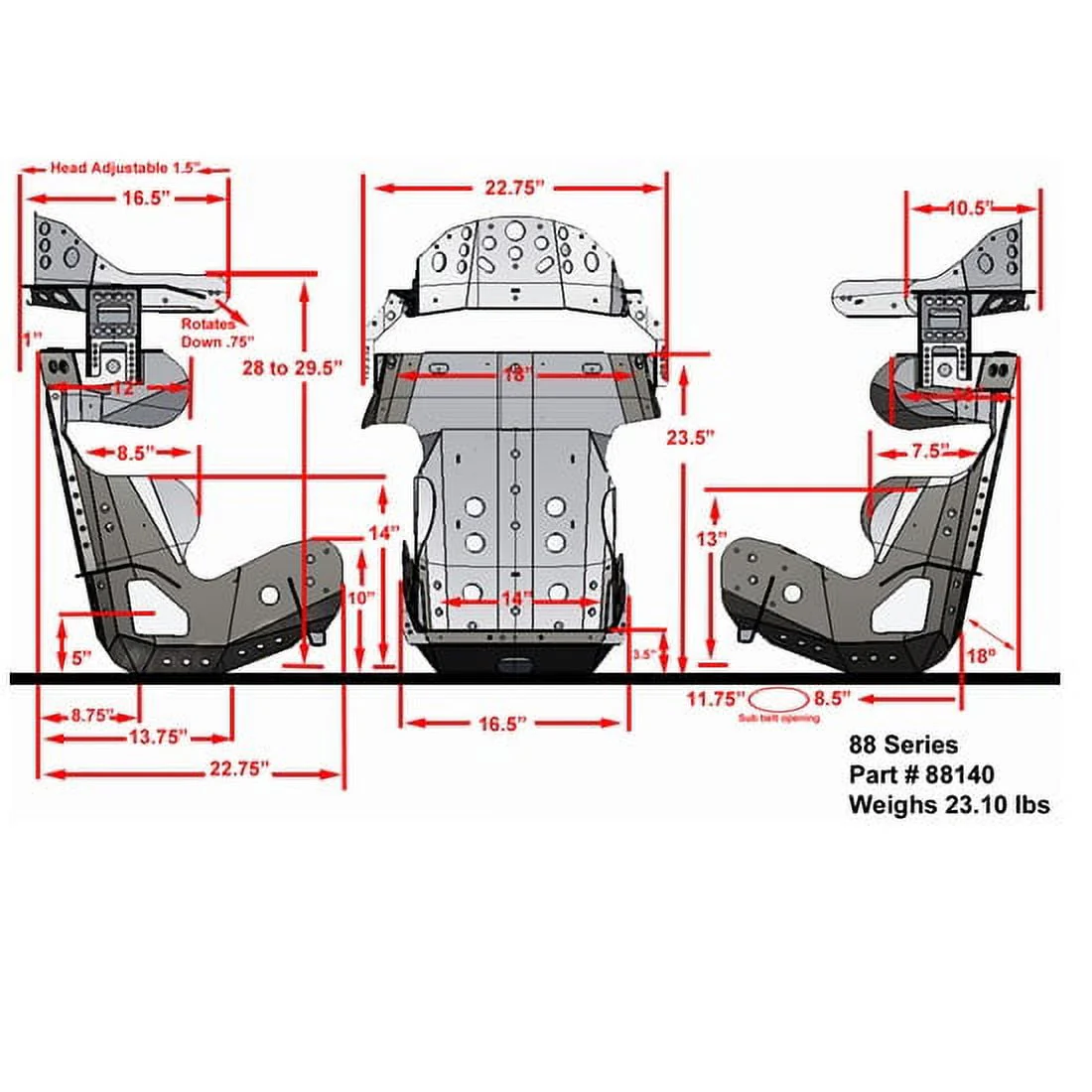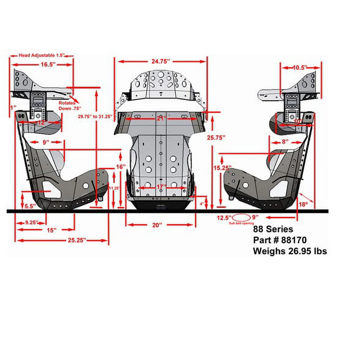 KIRKEY RACING ALUMINUM LATE MODEL, IMCA MODIFIED SEAT KIT. Designed for Dirt Late Model, Asphalt Late Models , Midwest Modifieds, Street Stock, Crate Late Models. Five (5) sizes available, (14", 15", 16", 17",18-1/2"). Kit comes with black cloth cover. 18 degree layback. Easily removable cover has additional ½" energy absorbing padding for extra lumbar support. Designed to accommodate all head and neck restraints. Constructed from TIG welded .100" 5052 grade aluminum. Additional MIG welding adds strength. Contoured elongated bottom reinforced for added thigh and hip support. Energy absorbing padding on seat bottom. Rib and reinforced shoulder supports have extra 1/2" energy absorbing padding directly on seat. Head restraint is adjustable both vertically and laterally and uses molded high density energy absorbing impact pads that eliminates upholstery. Head restraint can also rotate down for additional peripheral vision. Fabricated aluminum connector brackets for easy head adjustment. Left side of head restraint angled and shortened to allow easy entry, exit. Right and Left leg extensions built in. Lap and sub belt openings have molded rubber grommets to eliminate belt wear. Designed to accommodate all seat belt systems. Mounts direct to chassis or use mount listed below. KIT design reduces shipping cost.