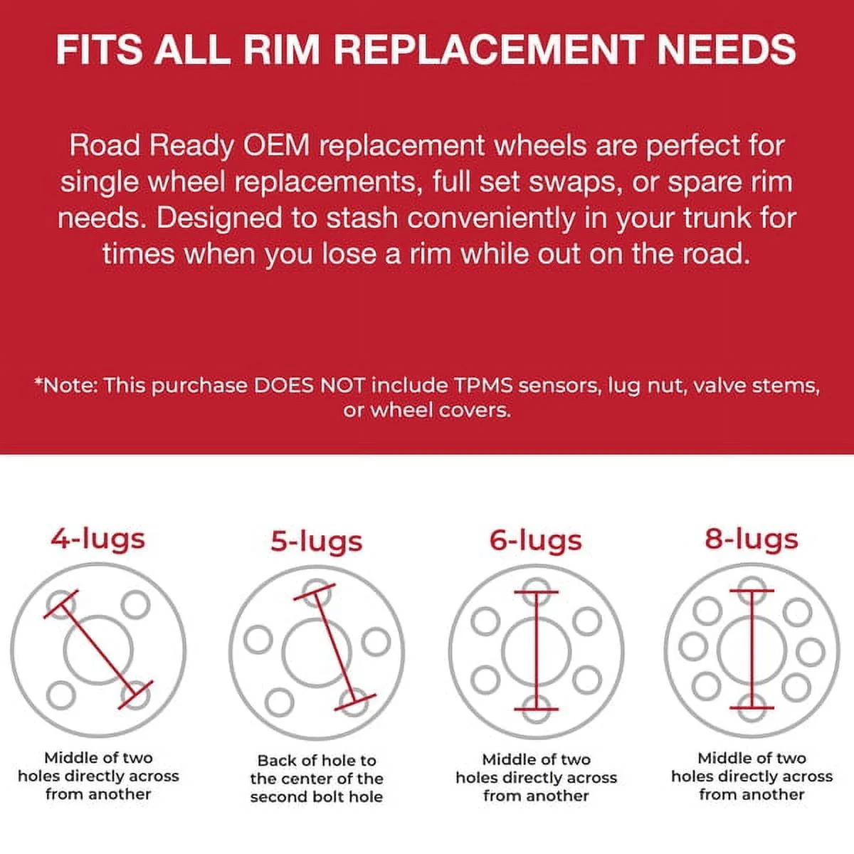 This Road Ready wheels has been thoroughly tested to ensure quality, durability, and toughness. This wheel has passed all of the necessary safety requirements and has been constructed to be a direct OEM replacement. All of our product here at Road Ready is fully compatible with your factory equipment including but not limited to: wheel covers, TPMS sensors, hubcaps, lug nuts, and tires. Serving over 30,000 customers in all 50 states, we are considered one of the top wheel providers in the country. Feel safe when buying your product, shop Road Ready today!