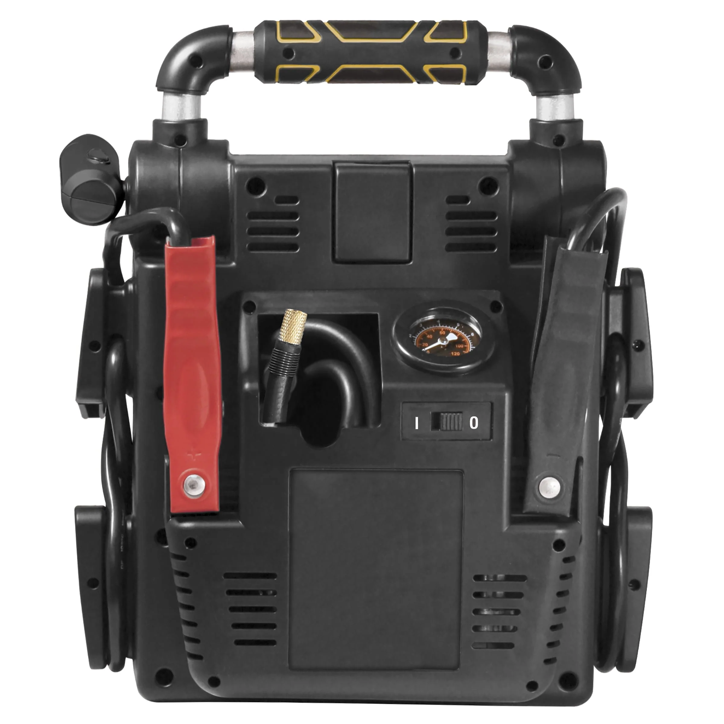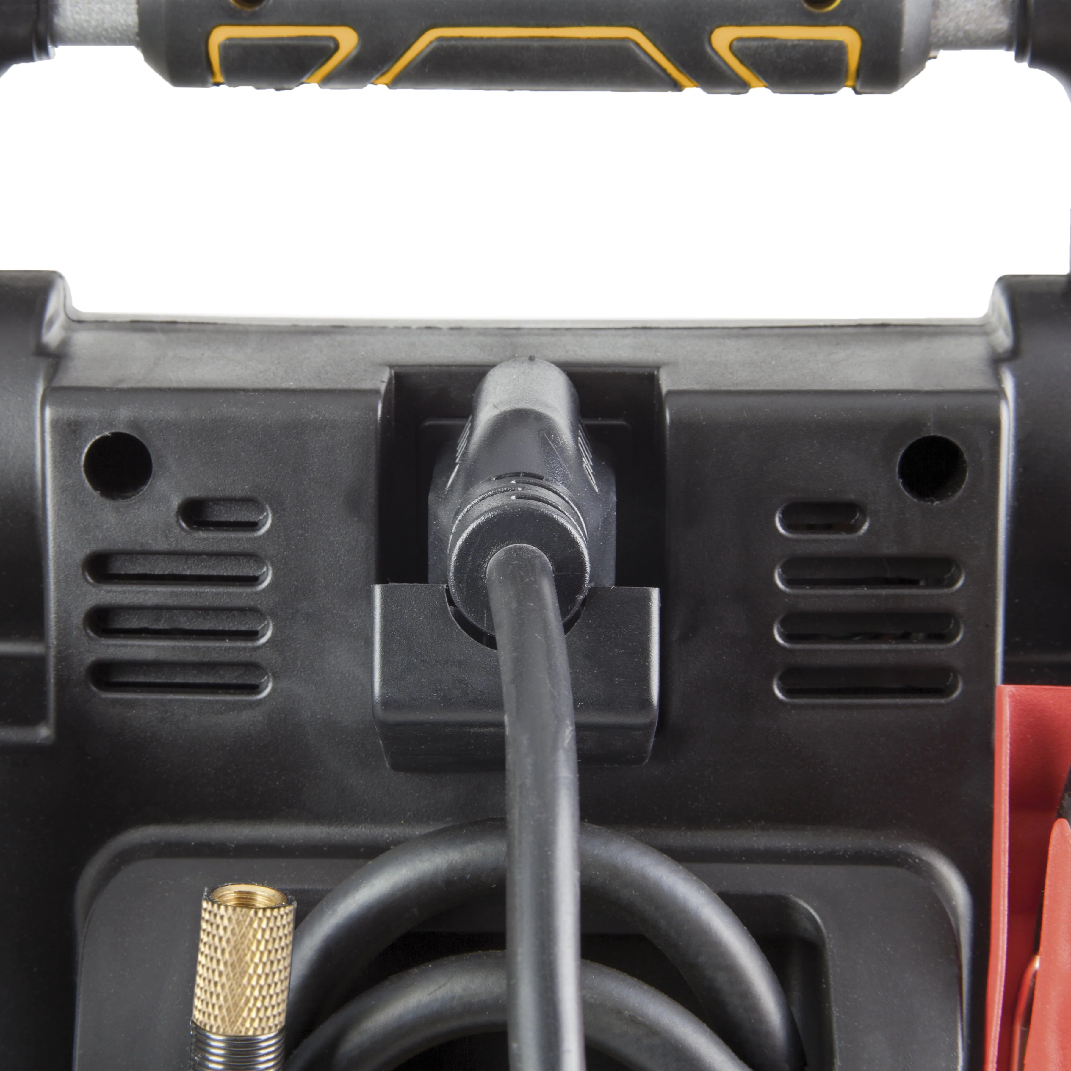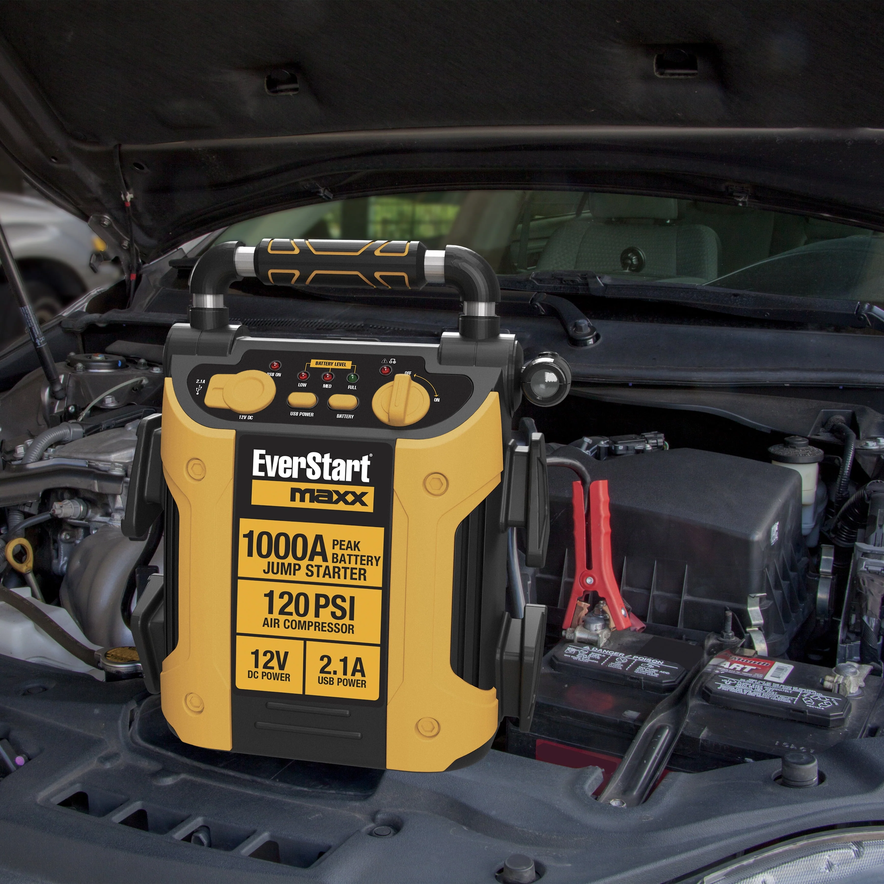 The EverStart Maxx J5C09E 1000 Peak Amp Jump Starter with 120 PSI Air Compressor is a practical solution for some of the most common roadside emergencies. Through the integrated heavy-duty metal clamps, it can deliver enough power to start most vehicles on the road today (up to and including V8-powered cars and trucks). The 120 PSI Air Compressor comes with a backlit digital gauge and a Sure Fit nozzle so that you can top off automotive tires or inflate sports equipment with ease. The 12V DC and USB Charging Ports provide a great source of backup power while you’re on-the-go, and the pivoting LED work light delivers easy on-demand illumination wherever you go. Combine all that with practical safety features like a Reverse Polarity Alarm and manual Safety Switch, and you get a practical solution for almost any driver on the road today.