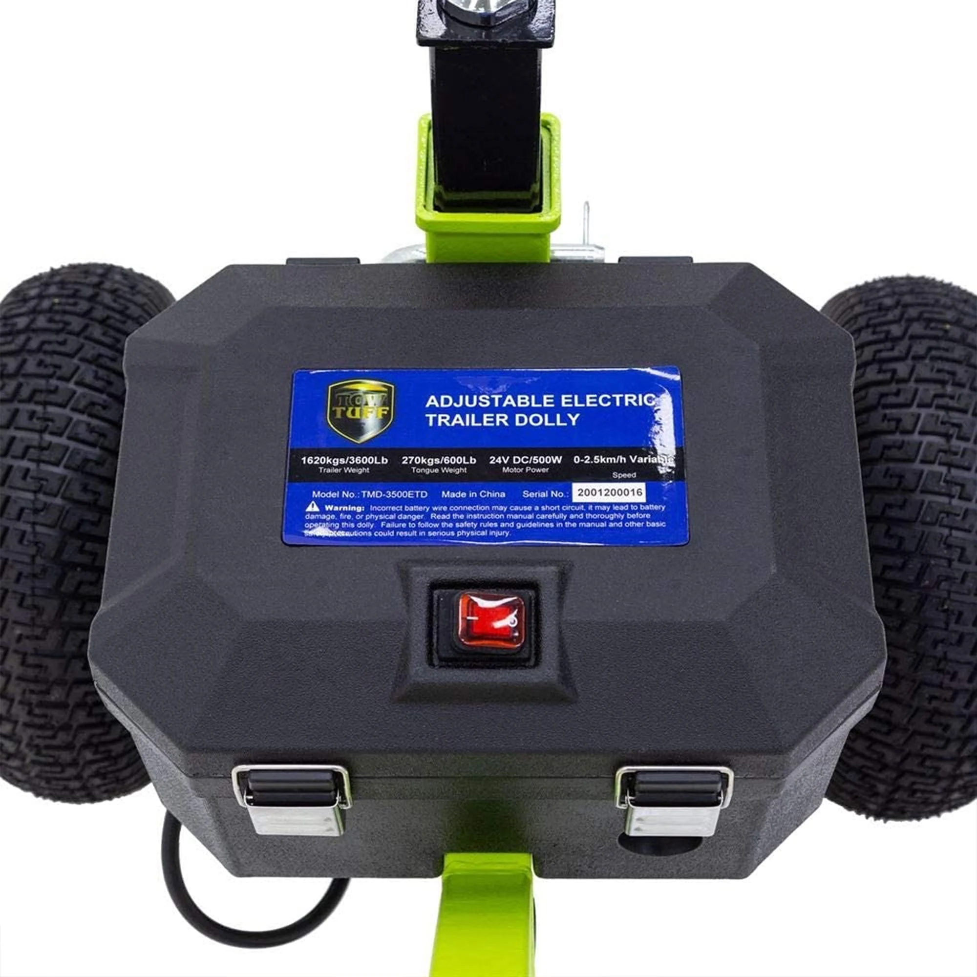 The Tow Tuff TMD-35ETD8 Electric Trailer Dolly is an excellent way to move utility, boat, or cargo trailers and even fish houses. The unique, 3rd wheel design stabilizes the load to move trailers and equipment safely. This trailer dolly is powered by two 24 Volt sealed 7Ah batteries and has variable speeds for smooth forward and reverse movements. Dolly can also travel for up to 1.5 MPH.