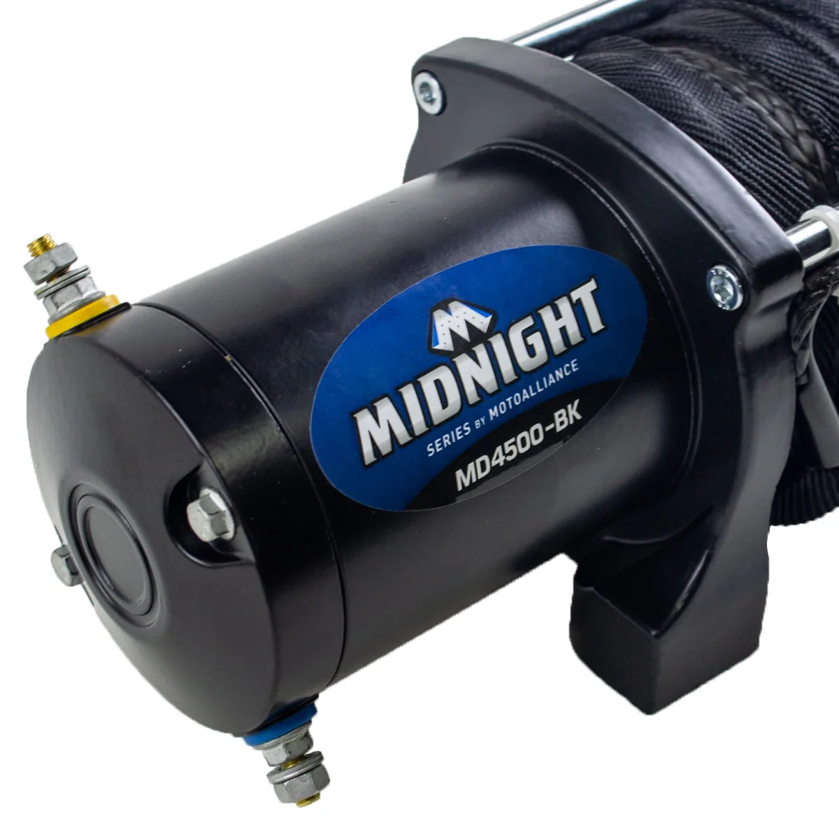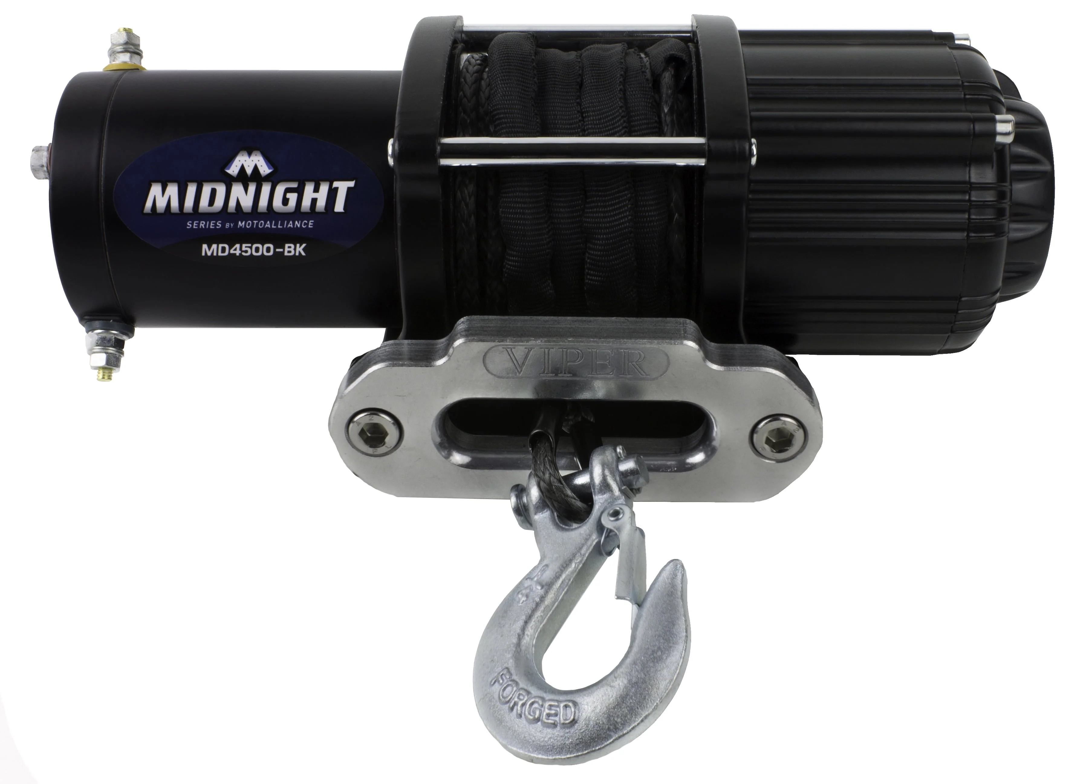 The VIPER Midnight 4,500lb Winch is a durable winch for ATVs, UTVs and Side by Sides. A great winch for snowplowing and mudding with ATV and UTVs, it has a sealed planetary metal gear train, a 1.8 horsepower permanent magnet motor, automatic brake, and stainless-steel hardware. Wireless remote switch, waterproof handle bar switch and synthetic rope are standard on this Midnight winch.