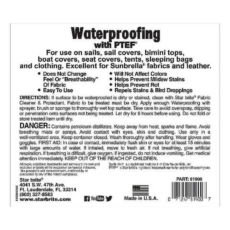 Star brite Waterproofing with PTEF restores water repellency to virtually all marine fabrics from boat covers to bimini tops. It is also the easiest, most effective way to waterproof car covers, tents, tarps, foul weather gear, convertible tops and more.